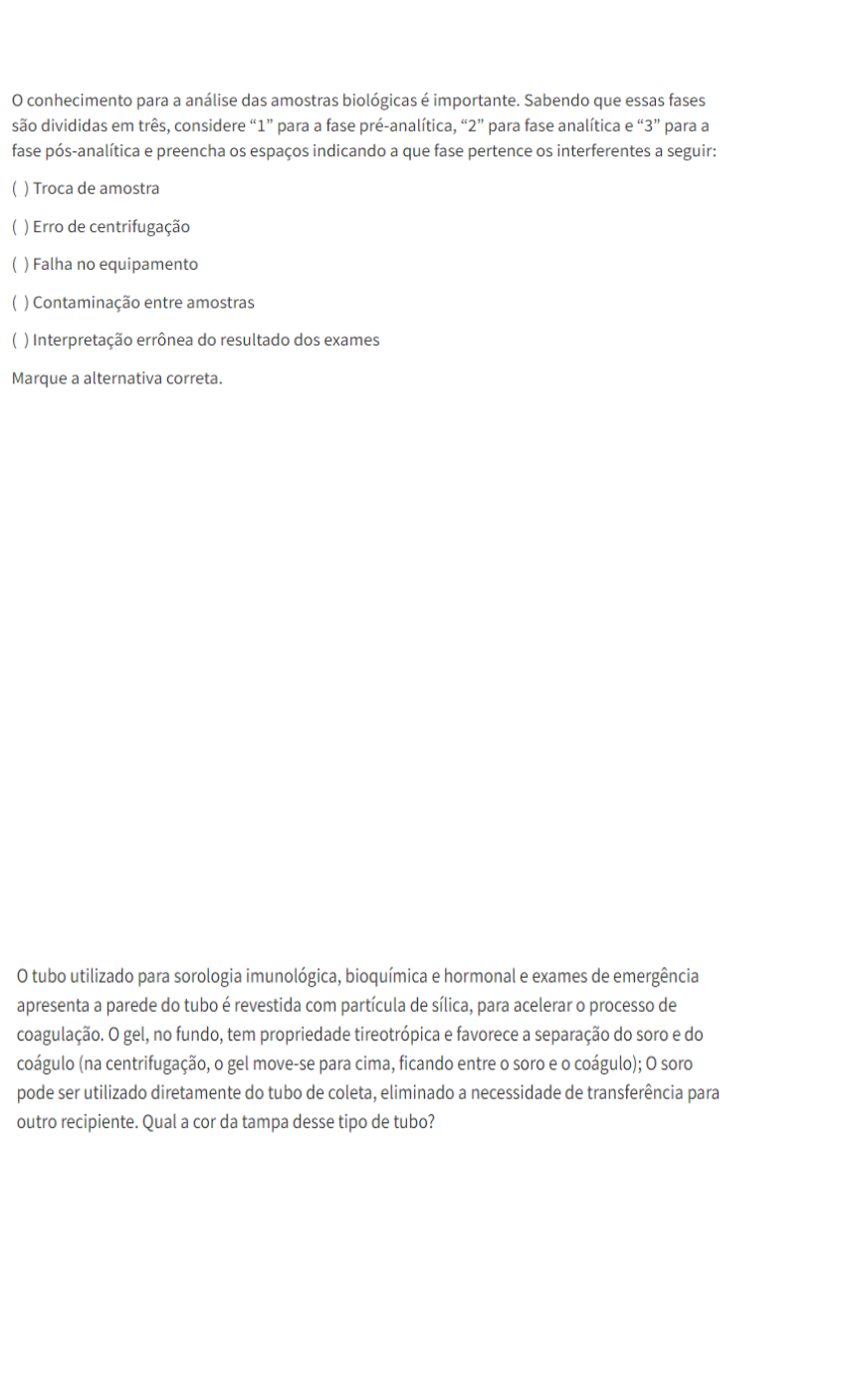 INSTRUMENTAÇÃO BIOMÉDICA 1Código:55685 -Disciplina -INSTRUMENTACAO BIOMEDICA Enunciado: Alternativa correta: • b) 2, 2, 2, 1, 3 Alternativa marcada: • d) 2, 1, 2, 1, 3 2Código:55704 -Disciplina -INSTRUMENTACAO BIOMEDICA Enunciado: Os interferentes associados às análises clínicas são relacionados às fases de avaliação laboratorial. Sobre os possíveis interferentes da fase pré-analítica, assinale a alternativa INCORRETA. Alternativa correta: • b) Uso de EDTA Alternativa marcada: • b) Uso de EDTA 3Código:135587 -Disciplina -INSTRUMENTACAO BIOMEDICA Enunciado: Alternativa correta: • c) Tampa Vermelha Alternativa marcada: • c) Tampa Vermelha Justificativa: Tubo Sem Aditivo, mas com Gel para Separação do Soro – Tampa Vermelha 4Código:55722 -Disciplina -INSTRUMENTACAO BIOMEDICA Enunciado: " Na gestão de qualidade, essa norma pode ser aplicada em diferentes tipos de organizações, incluindo laboratórios e pontos de coleta. Essa norma está acompanhada de outras que, juntas, descrevem as regras relacionadas à implantação, desenvolvimento e avaliação do Sistema de Gestão de Qualidade." Estamos falando da: Alternativa correta: • b) ISO 9000 Alternativa marcada: • b) ISO 9000 5Código:55702 -Disciplina -INSTRUMENTACAO BIOMEDICA Enunciado: O setor de medicina diagnóstica segue algumas portarias e regulamentações para que seja possível seu funcionamento. Em 2005, foi publicada uma regulamentação específica para o setor laboratorial. Qual é esse documento? Alternativa correta: • b) RDC 302 Alternativa marcada: • b) RDC 302 6Código:55691 -Disciplina -INSTRUMENTACAO BIOMEDICA Enunciado: Alternativa correta: • d) Especificidade e seletividade, intervalo de confiança, linearidade, limite de detecção, exatidão, precisão e robustez. Alternativa marcada: • d) Especificidade e seletividade, intervalo de confiança, linearidade, limite de detecção, exatidão, precisão e robustez. 7Código:55701 -Disciplina -INSTRUMENTACAO BIOMEDICA Enunciado: Para a realização de um ensaio é necessário preparar 1000 ml de uma solução A, de concentração 10,00 mol/L, que deve ser feita a partir de uma solução estoque B, concentrada em 50 mol/L. O volume necessário da solução B, para a efetivação do preparo da solução A, é: Alternativa correta: • d) 200 ml Alternativa marcada: • d) 200 ml 8Código:55711 -Disciplina -INSTRUMENTACAO BIOMEDICA Enunciado: Os mapas de riscos em laboratórios clínicos buscam representar todos os riscos possíveis presentes em cada ambiente e as medidas preventivas. Esses riscos são classificados em: riscos químicos, riscos biológicos, riscos físicos, riscos de acidente e riscos ergonômicos. Sobre os mapas de riscos, é incorreto: Alternativa correta: • c) Os fumos, gases, vapores, pressões e umidade são considerados riscos químicos e são marcados no mapa em vermelho Alternativa marcada: • c) Os fumos, gases, vapores, pressões e umidade são considerados riscos químicos e são marcados no mapa em vermelho. 9Código:135610 -Disciplina -INSTRUMENTACAO BIOMEDICA Enunciado: Alternativa correta: • e) Revolver Alternativa marcada: • e) Revolver Justificativa: É necessário utilizar o revólver, pois nele estão acopladas as lentes objetivas. 10Código:55712 -Disciplina -INSTRUMENTACAO BIOMEDICA Enunciado: Alternativa correta: • c) I. EPC, II. EPC, III. EPI, IV. EPI Alternativa marcada: • b) I.EPI, II. EPC, III. EPI, IV. EPI