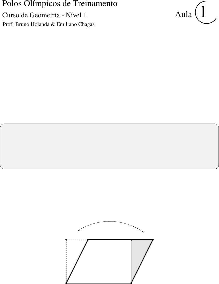 Polos Olímpicos de Treinamento Prof. Bruno Holanda & Emiliano Chagas Aula 1Curso de Geometria - Nível 1 Áreas I A área de uma figura plana é um conceito primitivo de Geometria Plana que é dif́ıcil de formalizar de maneira rigorosa, mas fácil de se entender de maneira intuitiva. Para facili- tar nosso entendimento, estudaremos as áreas das figuras planas a partir de três premissas básica que iremos assumir como verdadeiras. São elas: Premissa I. A área de um retângulo de comprimento x e altura y é dado por xy. Premissa II. Se uma figura plana é dividida em dois ou mais pedeços, a soma das áreas dos pedaços é igual à área da figura original. Premissa III. Se duas figuras são idênticas, então possuem a mesma área. Veremos agora como podemos calcular a área de paralelogramos e triângulos a partir dessas premissas. Em primeiro lugar, veja que um paralelogramo pode ser separado em duas partes (um triângulo e um quadrilátero) através de uma altura que passa por um de seus vértices. Essas duas partes podem ser rearranjadas de modo a formar um retângulo de acordo com a figura: A B C D EF Figura 1: Veja que a área do paralelogramo ABCD é igual à área do retângulo ADEF . POTI - Geometria - N1 - Aula 1 - Profs. Bruno Holanda & Emiliano Chagas Assim, se B é a medida do lado horizontal do paralelogramo (que chamaremos de base) e h é a medida da altura, podemos verificar que a área desse paralelogramo é igual a B×h. A B C D Para descobrirmos a área de um triângulo ABC, trace uma paralela ao lado BC pas- sando por A e uma paralela ao lado AC passando por B. Se D é o ponto de encontro entre essas duas paralelas, veja que ABCD é um paralelogramo e que os triângulos ABC e ACD são idênticos. Agora, sendo B a medida da base BC e h a altura do triângulo, pelo o que vimos anteriormente, sabemos que a área do paralelogramo ABCD é igual a B × h. Por outro lado, esse paralelogramo pode ser divido em duas partes iguais (os triângulos ABC e BCD). Portanto, cada um terá área igual a B×h2 . Notação: Utilizaremos colchetes para denotar áreas de figuras. Por exemplo, a área do triângulo ABC será denotada por [ABC] e a área do quadrilátero XY ZW será denotada por [XY ZW ]. Para finalizar a parte teórica neste caṕıtulo, iremos demonstrar o seguinte resultado: Fato Importante. Se ABC é um triângulo e M é o ponto médio do lado BC, então as áreas dos triângulos ABM e AMC são iguais. A B CM Demonstração. Note que os dois triângulos têm a mesma altura e a mesma medida de base, pois BM = MC (por definição). Logo, utilizando a fórmula de área para triângulos, o resultado é imediato. 2 POTI - Geometria - N1 - Aula 1 - Profs. Bruno Holanda & Emiliano Chagas Problemas Introdutórios Problema 1. (OBMEP 2015 - 1a Fase) Os pontos destacados nos quadrados abaixo são pontos médios dos lados. Quantos desses quadrados têm área sombreada igual a 1 4 de sua área? Problema 2. (OBMEP 2017 - 1a fase) A figura mostra um quadrado de centro O e área 20 cm 2. O ponto M é o ponto médio de um dos lados. Qual é a área da região sombreada? O M Problema 3. (OBMEP 2017 - 1a Fase) A área da figura é igual à soma das áreas de quantos quadradinhos do quadriculado? Problema 4. Cada lado do quadrado ABCD de lado quatro é dividido em partes iguais por três pontos. Escolhendo um ponto (dos três internos) em cada lado podemos formar um quadrilátero cinza. Qual é a área desse quadrilátero? 3 POTI - Geometria - N1 - Aula 1 - Profs. Bruno Holanda & Emiliano Chagas A B CD Problema 5. (OBM 2005 - 1a Fase) Seis retângulos idênticos são reunidos para formar um retângulo maior conforme indicado na figura. Qual é a área deste retângulo maior? 21cm Problema 6. (OBMEP 2010 - 1a Fase) A figura mostra um quadrado dividido em 16 quadradinhos iguais. A área em sombreado corresponde a que fração da área do quadrado? Problemas Propostos Problema 7. (OBMEP 2013 - 1a Fase) A figura representa um retângulo de área 36 m2, dividido em três faixas de mesma largura. Cada uma das faixas está dividida em partes iguais: uma em quatro partes, outra em três e a terceira em duas. Qual é a área total das partes sombreadas? 4 POTI - Geometria - N1 - Aula 1 - Profs. Bruno Holanda & Emiliano Chagas Problema 8. (OBMEP 2009 - 1a Fase) A figura mostra cinco triângulos equiláteros. A que fração da área da figura corresponde a área sombreada? Problema 9. (OBMEP 2012 - 1a Fase) O retângulo ao lado, que foi recortado de uma folha de papel quadriculado, mede 4 cm de largura por 5 cm de altura. Qual é a área da região sombreada? Problema 10. (OBM 2011 - 1a Fase) O retângulo da figura abaixo está dividido em 10 quadrados. As medidas dos lados de todos os quadrados são números inteiros positivos e são os menores valores posśıveis. Qual é a área desse retângulo? 5 POTI - Geometria - N1 - Aula 1 - Profs. Bruno Holanda & Emiliano Chagas Problema 11. (OBMEP 2009 - 1a Fase) Na figura, o quadrado ABCD tem área 40 cm2 . Os pontos P, Q, R e S são pontos médios dos lados do quadrado e T é o ponto médio do segmento RS. Qual é a área do triângulo PQT? A P B Q CD R S T Problema 12. (OBMEP 2010 - 1a Fase) A figura mostra um quadrado com suas diagonais e segmentos que unem os pontos médios de seus lados. A área em cinza corresponde a que fração da área do quadrado? Problema 13. (OBMEP 2015 - 1a Fase) A figura abaixo é formada por dois quadrados de lado 6 cm e dois triângulos. Se M é o ponto médio de AB, qual é a área total da figura? 6 POTI - Geometria - N1 - Aula 1 - Profs. Bruno Holanda & Emiliano Chagas B M A Problema 14. (OBM 2004 - 2a Fase) No desenho, os quadriláteros ABCD, EFAG e IAJH são retângulos e H é ponto médio de AE. Calcule a razão entre a área do retângulo ABCD e o triângulo AHI. A B CD E F G H I J Problema 15. (OBM 2009 - 1a Fase) Na figura, C é um ponto do segmento BD tal que ACDE é um retângulo e ABCE é um paralelogramo 
