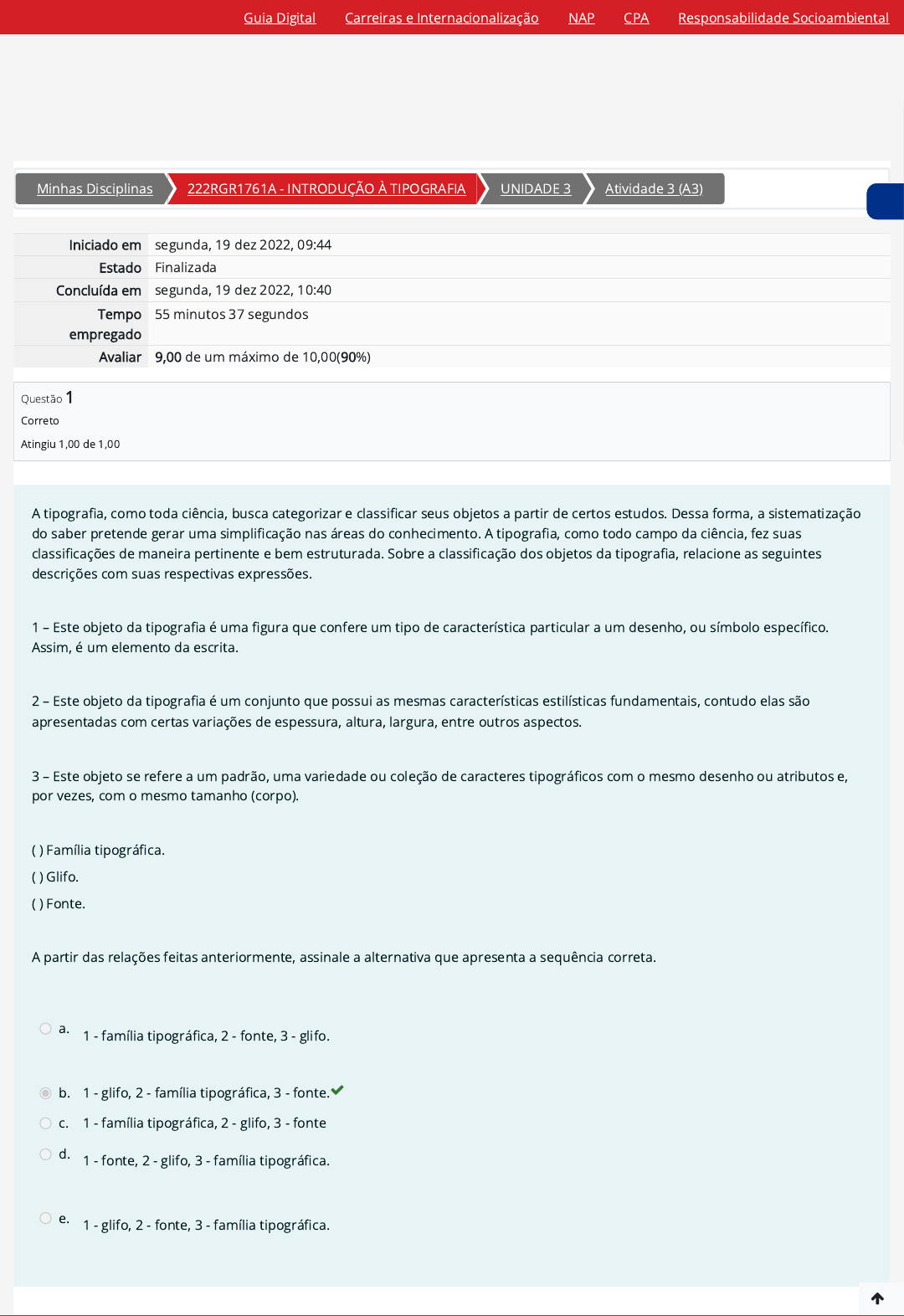 19/12/2022 10:44 Atividade 3 (A3): Revisão da tentativa https://ambienteacademico.com.br/mod/quiz/review.php?attempt=1742371&cmid=524919#question-1969093-2 1/6 Minhas Disciplinas 222RGR1761A - INTRODUÇÃO À TIPOGRAFIA UNIDADE 3 Atividade 3 (A3) Iniciado em segunda, 19 dez 2022, 09:44 Estado Finalizada Concluída em segunda, 19 dez 2022, 10:40 Tempo empregado 55 minutos 37 segundos Avaliar 9,00 de um máximo de 10,00(90%) Questão 1 Correto Atingiu 1,00 de 1,00 A tipogra�a, como toda ciência, busca categorizar e classi�car seus objetos a partir de certos estudos. Dessa forma, a sistematização do saber pretende gerar uma simpli�cação nas áreas do conhecimento. A tipogra�a, como todo campo da ciência, fez suas classi�cações de maneira pertinente e bem estruturada. Sobre a classi�cação dos objetos da tipogra�a, relacione as seguintes descrições com suas respectivas expressões. 1 – Este objeto da tipogra�a é uma �gura que confere um tipo de característica particular a um desenho, ou símbolo especí�co. Assim, é um elemento da escrita. 2 – Este objeto da tipogra�a é um conjunto que possui as mesmas características estilísticas fundamentais, contudo elas são apresentadas com certas variações de espessura, altura, largura, entre outros aspectos. 3 – Este objeto se refere a um padrão, uma variedade ou coleção de caracteres tipográ�cos com o mesmo desenho ou atributos e, por vezes, com o mesmo tamanho (corpo). ( ) Família tipográ�ca. ( ) Glifo. ( ) Fonte. A partir das relações feitas anteriormente, assinale a alternativa que apresenta a sequência correta. a. 1 - família tipográ�ca, 2 - fonte, 3 - glifo. b. 1 - glifo, 2 - família tipográ�ca, 3 - fonte. c. 1 - família tipográ�ca, 2 - glifo, 3 - fonte d. 1 - fonte, 2 - glifo, 3 - família tipográ�ca. e. 1 - glifo, 2 - fonte, 3 - família tipográ�ca. Guia Digital Carreiras e Internacionalização NAP CPA Responsabilidade Socioambiental https://ambienteacademico.com.br/my/ https://ambienteacademico.com.br/course/view.php?id=18567 https://ambienteacademico.com.br/course/view.php?id=18567§ion=5 https://ambienteacademico.com.br/mod/quiz/view.php?id=524919 https://codely-fmu-content.s3.amazonaws.com/Moodle/GuiaDigital/Guia+digital/index.html https://informa.fmu.br/carreiras/ https://codely-fmu-content.s3.amazonaws.com/Moodle/NAP/inicial/nap/fmu/index.html https://codely-fmu-content.s3.amazonaws.com/Moodle/CPA/landing_CPA/index.html https://portal.fmu.br/sustentabilidade 19/12/2022 10:44 Atividade 3 (A3): Revisão da tentativa https://ambienteacademico.com.br/mod/quiz/review.php?attempt=1742371&cmid=524919#question-1969093-2 2/6 Questão 2 Incorreto Atingiu 0,00 de 1,00 Questão 3 Correto Atingiu 1,00 de 1,00 A diagramação de textos é realizada com base em diversos elementos de ferramentas aplicáveis aos glifos, famílias tipográ�cas, fontes, dentre outros. Considerando os elementos de ajustamento, assinale a alternativa que apresenta elementos aplicáveis às famílias tipográ�cas. a. Paica e Didot. b. Paica, Didot e Leading c. Kerning, Tracking e Leading. d. Leading, Tracking e Contraste e. Leading, Cor e Paica. Em conformidade aos postulados de Lupton e Stolarski (2009) e Williams (2009), os sistemas de classi�cação tipográ�cos atuais consideram, de maneira geral, três elementos como objetos classi�cadores: os glifos, as famílias tipográ�cas e a fonte. Na maior parte dos sistemas classi�cadores, comumente se encontram duas abordagens diferentes: a classi�cação por enquadramento tradicional e a classi�cação por enquadramento histórico. LUPTON, E.; STOLARSKI, A. Pensar com tipos: guia para designers, escritores, editores e estudantes. São Paulo: CosacNaify, 2009. WILLIAMS, R. Design para quem não é designer: noções básicas de planejamento visual. 3. ed. São Paulo: Callis, 2009. Sobre a classi�cação por enquadramento tradicional, assinale a alternativa que, segundo esses autores, não tem relação com essa classi�cação. a. Cursivas ou Manuscritas. b. Decorativa c. Com Serifa ou Serifada. d. Itálicas. e. Sem Serifa. Guia Digital Carreiras e Internacionalização NAP CPA Responsabilidade Socioambiental https://codely-fmu-content.s3.amazonaws.com/Moodle/GuiaDigital/Guia+digital/index.html https://informa.fmu.br/carreiras/ https://codely-fmu-content.s3.amazonaws.com/Moodle/NAP/inicial/nap/fmu/index.html https://codely-fmu-content.s3.amazonaws.com/Moodle/CPA/landing_CPA/index.html https://portal.fmu.br/sustentabilidade 19/12/2022 10:44 Atividade 3 (A3): Revisão da tentativa https://ambienteacademico.com.br/mod/quiz/review.php?attempt=1742371&cmid=524919#question-1969093-2 3/6 Questão 4 Correto Atingiu 1,00 de 1,00 Questão 5 Correto Atingiu 1,00 de 1,00 A maior parte das classi�cações tipográ�cas aborda dois tipos de classi�cações: por enquadramento tradicional e por enquadramento histórico. Com base nessa divisão, é correto a�rmar que são exemplos de classi�cações por enquadramento tradicional: a. Com ou sem serifa”, humanistas, egípcias e góticas. b. Humanistas, transicionais, egípcias e modernas. c. Sem serifa, com serifa, cursiva e decorativa. d. Modernas, antigas, novas e robustas. e. Sem serifa, com haste, histórica e manuscritas. Segundo Lupton e Stolarski (2009) e Williams (2009), os sistemas de classi�cação tipográ�cos atuais consideram, de maneira geral, três elementos como objetos classi�cadores: os glifos, as famílias tipográ�cas e a fonte. Na maior parte dos sistemas classi�cadores, comumente se encontram duas abordagens diferentes: a classi�cação por enquadramento tradicional e a classi�cação por enquadramento histórico. LUPTON, E.; STOLARSKI, A. Pensar com tipos: guia para designers, escritores, editores e estudantes. São Paulo: CosacNaify, 2009. WILLIAMS, R. Design para quem não é designer: noções básicas de planejamento visual. 3. ed. São Paulo: Cal