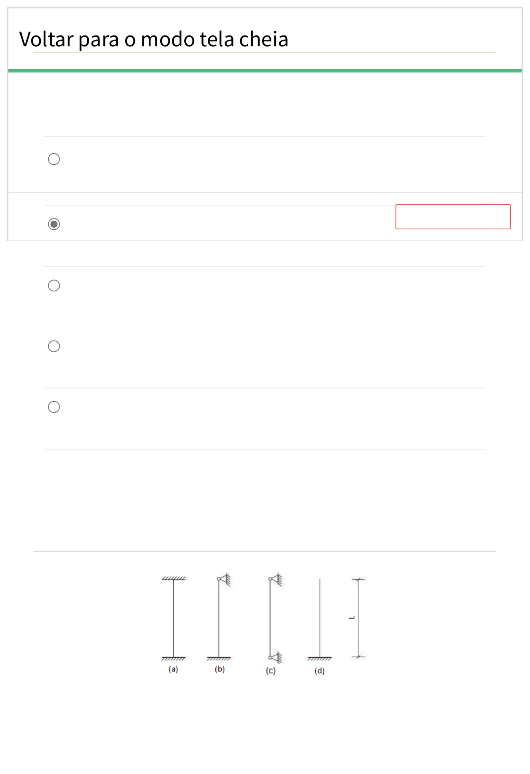 Uma barra circular, de seção constante em todo o seu comprimento, é submetida a esforços de tração sob a ação de uma carga P. Aumentando-se os valores da carga e relacionando-as com a seção transversal, bem como o alongamento com comprimento da barra, obtemos o diagrama tensão x deformação, e podemos afirmar que: Questão 1 A) Nos materiais frágeis, após o escoamento ocorre a deformação plástica. B) Em um primeiro momento as tensões são proporcionais às deformações até o limite de proporcionalidade e o diagrama de tensões é linear. C) No trecho onde verifica-se uma deformação considerável, sem um aumento significativo de forças tem-se a ruptura do material. D) Com o alongamento ocorre a estricção que é a diminuição da seção longitudinal. E) Os materiais que sofrem grandes deformações antes da fratura são chamados de frágeis. Texto de Apoio Questão 2 Voltar para o modo tela cheia Ativar modo tela cheia ATENÇÃO, você só poderá fazer a prova em modo tela cheia. Clique abaixo para voltar para a prova. A flambagem das colunas submetidas a esforços de compressão é feita em função de suas condições de vinculação. Considere uma barra comprimida axialmente de seção constante e as condições de vinculação apresentadas na figura. A) A maior e a menor carga crítica de instabilidade (carga crítica de Euler) são nas condições (c) e (d), respectivamente. B) A maior e a menor carga crítica de instabilidade (carga crítica de Euler) são nas condições (a) e (d), respectivamente. C) A maior e a menor carga crítica de instabilidade (carga crítica de Euler) são nas condições (c) e (a), respectivamente. D) A maior e a menor carga crítica de instabilidade (carga crítica de Euler) são nas condições (b) e (d), respectivamente. E) A maior e a menor carga crítica de instabilidade (carga crítica de Euler) são nas condições (b) e (c), respectivamente. Texto de Apoio Sobre a viga biapoiada da imagem é correto afirmar que: Questão 3 A) O momento fletor é máximo no meio do vão, o esforço cortante é nulo e o esforço normal é máximo no meio do vão. Voltar para o modo tela cheia Ativar modo tela cheia ATENÇÃO, você só poderá fazer a prova em modo tela cheia. Clique abaixo para voltar para a prova. B) O momento fletor é máximo nas extremidades, o esforço cortante é máximo no meio do vão e o esforço normal é nulo. C) O momento fletor é nulo, o esforço cortante é máximo nas extremidades e o esforço normal é nulo. D) O momento fletor é nulo e os esforços cortante e normal são máximos no meio do vão. E) O momento fletor é máximo no meio do vão, o esforço cortante é máximo nas extremidades e o esforço normal é nulo. O parâmetro mecânico que proporciona uma medida da rigidez de um material sólido e que é obtido na fase de comportamento elástico linear dos materiais é denominado Questão 4 A) Módulo de Young ou Módulo de Elasticidade. B) Constante Elástica. C) Módulo de Deformação ou Módulo Transversal. D) Coeficiente de Poisson. E) Módulo de Euler ou Constante de Flambagem. Voltar para o modo tela cheia Ativar modo tela cheia ATENÇÃO, você só poderá fazer a prova em modo tela cheia. Clique abaixo para voltar para a prova. Quando um determinado material encontra-se no regime elástico linear, diz-se que a relação entre a tensão e a deformação deste material é regida pela lei de: Questão 5 A) Euler B) Bernoulli C) Hooke D) Kirchho� E) Newton Assinale a alternativa correta. Nas propriedades dos corpos sólidos a definição: “É a capacidade que tem os corpos de se adelgaçarem até formarem lâminas sem, no entanto, se romperem”, define o/a: Questão 6 A) Tenacidade B) Desgaste C) Dureza D) Maleabilidade Voltar para o modo tela cheia Ativar modo tela cheia ATENÇÃO, você só poderá fazer a prova em modo tela cheia. Clique abaixo para voltar para a prova. E) Ductilidade Assinale a alternativa correta. Nas propriedades dos corpos sólidos a definição: “É a perda de qualidades ou de dimensões com o uso contínuo”, define o/a: Questão 7 A) Maleabilidade B) Dureza C) Desgaste D) Tenacidade E) Ductilidade Quando os materiais destinam-se a aplicações estruturais, seu comportamento mecânico tem um papel primário no projeto. Nesta fase, requer-se várias propriedades do material, entre as quais: Questão 8 A) A resistência, dimensão e o tempo. B) A dimensão, a dureza, beleza e a resistência. Voltar para o modo tela cheia Ativar modo tela cheia ATENÇÃO, você só poderá fazer a prova em modo tela cheia. Clique abaixo para voltar para a prova. C) O tempo, a luminosidade, a dimensão e a forma. D) A resistência, dimensão, beleza e temperatura. E) A resistência, a rigidez, a ductilidade, a tenacidade e a dureza. Considere as vigas da imagem abaixo que representam tipos de estruturas e suas condições de apoio. A correta condição das estruturas é: Questão 9 A) I - Hipoestática; II - Hipoestática; III - Isostática; IV - Hiperestática B) I - Isostática; II - Isostática; III - Hiperestática; IV - Hipoestática C) I - Hipoestática; II - Hiperestática; III - Hiperestática; IV - Isostática D) I - Hiperestática; II - Hipoestática; III - Hipoestática; IV - Isostática Voltar para o modo tela cheia Ativar modo tela cheia ATENÇÃO, você só poderá fazer a prova em modo tela cheia. Clique abaixo para voltar para a prova. E) I - Isostática; II - Hiperestática; III - Hipoestática; IV - Isostática Texto de Apoio A flambagem é um fenômeno que pode ser observado em peças esbeltas quando elas são solicitadas por forças de compressão axial. De acordo com a figura apresentada, que representa uma barra isolada com as vinculações nas extremidades, e L é o comprimento total da barra isolada. Nesse caso, o comprimento de flambagem teórico é: Questão 10 A) 1,2 L B) 0,5 L C) 0,7 L D) 1,0 L Voltar para o modo tela cheia Ativar modo tela cheia ATENÇ