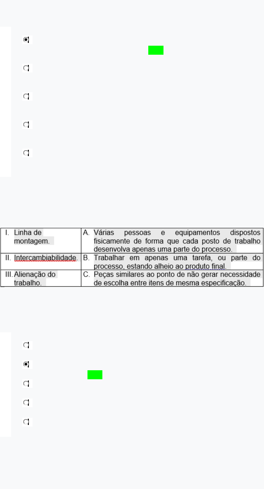 Podem ser consideradas informações de entrada do S&OP. Alternativas: · Novos clientes, preços, fornecimentos certo e economia. · Promoções, economia, preços e controle de produção. · Histórico de vendas, promoções, controle de produção, preços. · Clientes atuais, diretrizes administrativas, novos produtos e OEE. · Clientes atuais, produtos antigos, concorrência e histórico de vendas. Código da questão: 60368 2) Leia e associe as duas colunas: Assinale a alternativa que traz a associação correta entre as duas colunas: Alternativas: · I – B; II – A; III – C. · I – A; II – C; III – B. certa · I – C; II – B; III – A. · I – A; II – B; III – C. · I – B; II – C; III – A. Código da questão: 60325 3) Assinale a opção que apresenta um tipo de parada de máquina de responsabilidade da produção e que, por isso, deve ser descontada do “tempo produzindo” do OEE: Alternativas: · Almoço. · Falta de energia elétrica. · Setup correto · Reunião · Sem serviço para o setor. Código da questão: 60367 4) Os estoques são classificados em: estoques de matérias-primas, de materiais auxiliares, de manutenção, intermediários, de produtos acabados, em trânsito e consignados. A respeito dos estoques intermediários, assinale a alternativa correta. Alternativas: · Produtos embalados que serão enviados para o cliente. · Materiais utilizados nas anotações de apontamentos de produção, como caneta e papel. · Materiais como lixas e limas que são utilizados para dar acabamento a peças. · Materiais como tecido, couro e algodão recebidos de fornecedores. · Produtos que passaram em três de quatro etapas necessárias e estão aguardando processamento. certa Código da questão: 60331 5) Sobre o Planejamento e Controle da Produção (PCP), analise as afirmações as seguir: I. No nível tático, são usadas técnicas como MPS (Master Program Schedule), ou Plano Mestre de Produção (PMP), e o MRP (Material Requirement Planning) – Planejamento das Necessidades de Materiais. II. No nível estratégico, são definidas políticas estratégicas para próximos períodos, por exemplo, os próximos trimestres e anos. III. Just in time é uma ferramenta que consiste na utilização de sinais sonoros ou luminosos com o intuito de avisar o operador da ocorrência de uma falha na linha de produção. IV. MRP e MRP II apresentam o mesmo significado, ou seja, Planejamento das Necessidades de Materiais. É correto o que se afirma em: Alternativas: · I e II, apenas. · II e IV, apenas. · I, apenas. · I e III, apenas. certa · II, apenas. Código da questão: 60335 6) Uma técnica amplamente utilizada para classificar estoques é ________. Essa técnica permite verificar quais são os itens que ________ contribuem para os eventos analisados e que, geralmente, são constituídos por um________ número de itens. Assinale a alternativa que completa adequadamente as lacunas: Alternativas: · A curva ABC; menos, baixo. · O MRP; menos; baixo. · A curva ABC; mais; baixo.certa · O MRP; menos; baixo. · A curva ABC; mais, alto. Código da questão: 60332 7) De acordo com a simbologia adotada nos fluxogramas, as operações são representadas pela forma geométrica: Alternativas: · Seta. · Triângulo. · Losango. · Círculo. · Retângulo. certa Código da questão: 60328 8) Sobre as etapas que devem ser realizadas em uma modelagem de processos, analise as afirmativas a seguir e assinale-as com V (verdadeiro) ou F (falso): ( ) Representar processos de maneira precisa. ( ) Analisar a situação atual de um processo. ( ) Analisar a situação futura de um processo. ( ) Propor uma situação futura para um processo. ( ) Invalidar Procedimentos Operacionais Padrão – POPs. Assinale a alternativa que contenha a sequência correta: Alternativas: · V – V – F – V - F. certa · V – F – V – F – F. · F – V – F – V – V. · F – V – F – F – V. · V – V – V – V – F. Código da questão: 60324 9) Sobre o balanceamento de linhas, analise as afirmações a seguir: I. É preciso ter operadores que consigam desenvolver diversas funções no processo produtivo para que seja possível realizar o agrupamento de tarefas. II. Não acontecem perdas no processo de balanceamento de linhas. III. Se o resultado obtido no cálculo de estágios (etapas) exigidos para atender ao Takt Time não for um número inteiro, deve-se arredondar para baixo o resultado. São verdadeiras: Alternativas: · I, apenas. certa · I e III, apenas. · II e III, apenas. · I e II, apenas. · II, apenas. Código da questão: 60345 10) Revisadas com frequência, ramificada, reflexiva e racionais. Alternativas: · Pequenas paradas; reuniões de equipe. errada · Parada por falha no equipamento; atrasos de planejamento. · Pequenas paradas; queda de velocidade. errada · Produtos defeituosos; queda de rendimento. errada · Atividades de inspeção; perdas de retrabalho errada Código da questão: 60363