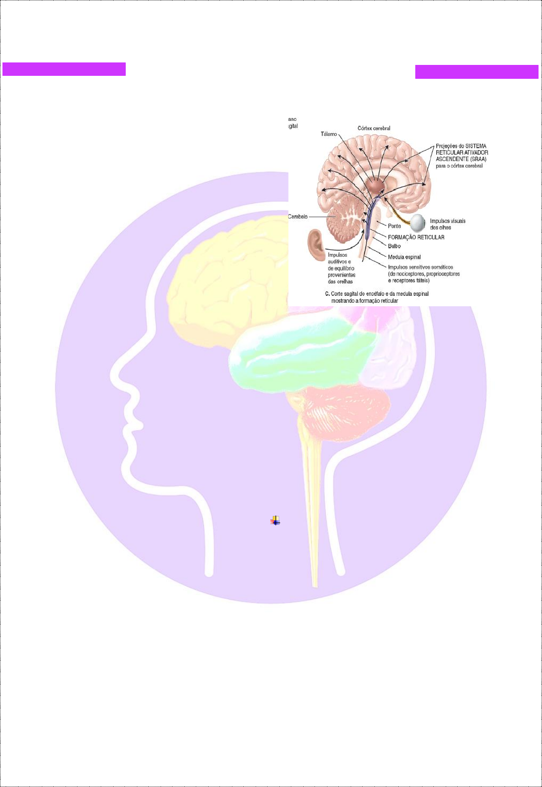 @karina_oliveiraq APG S7P1 Distúrbios do nível de consciência ➤ Fisiologicamente: ➥ A parte ascendente da formação reticular é chamada de sistema reticular ativador ascendente (SRAA), formado por axônios sensitivos que se projetam em direção ao córtex cerebral, diretamente ou via tálamo. Muitos estímulos sensitivos podem ativar o SRAA, dentre eles os estímulos visuais e auditivos; atividades mentais; estímulos de receptores de dor, tato e pressão; e estímulos de receptores em nossos membros e na cabeça que nos mantêm informados sobre a posição de nosso corpo. A função mais importante do SRAA seja a manutenção da consciência, estado de vigília no qual o indivíduo está totalmente alerta, consciente e orientado. Estímulos visuais e auditivos, bem como atividades mentais, podem estimular o SRAA a manter a consciência. O SRAA também está ativo durante o despertar, ou acordar do sono. Outra função do SRAA é manter a atenção (concentração em um objeto ou pensamento) e a vigilância. Ele também evita sobrecargas sensitivas (excesso de estimulação visual e/ou auditiva) por meio da filtração de informações insignificantes, de modo que elas não se tornem conscientes. A inativação do SRAA causa o sono, estado parcial de consciência a partir do qual o indivíduo pode ser despertado. Por outro lado, lesões do SRAA podem levar ao coma, estado de inconsciência do qual a pessoa não pode ser despertada. Nos estágios mais superficiais do coma, os reflexos do tronco encefálico e da medula espinal estão preservados, mas, nos estágios mais profundos, até estes reflexos são perdidos, e caso os centros respiratório e cardiovascular parem de funcionar, o paciente morre. Fármacos como a melatonina auxiliam o SRAA a induzir o sono, e os anestésicos gerais rebaixam a consciência por meio do SRAA. ➨Alterações patológicas quantitativas da consciência: rebaixamento do nível de consciência ➥ A consciência pode se alterar tanto por processos fisiológicos, normais, como por processos patológicos. Em diversos quadros neurológicos e psicopatológicos, o nível de consciência diminui de forma progressiva, desde o estado normal, vígil, desperto, até o estado de coma profundo, no qual não há qualquer resquício de atividade consciente. Os diversos graus de rebaixamento da consciência são: obnubilação, torpor, sopor e coma. 1º grau - Obnubilação: turvação da consciência ou sonolência patológica leve. Trata-se do rebaixamento da consciência em grau leve a moderado. À inspeção inicial, o paciente pode já estar claramente sonolento ou parecer desperto, o que pode dificultar o diagnóstico desse estado. De qualquer forma, há sempre diminuição do grau de clareza do sensório, com lentidão da compreensão e dificuldade de concentração. Nota-se que o indivíduo tem dificuldade para integrar as informações sensoriais oriundas do ambiente. Assim, mesmo não se notando a sonolência do paciente de forma evidente, observa-se, nos quadros de obnubilação, que a pessoa se encontra um tanto perplexa, com a compreensão dificultada, podendo o pensamento que expressa revelar confusão mental. No geral, o @karina_oliveiraq indivíduo diminui a atenção para as solicitações externas, dirigindo-se para a sonolência. Já se pode observar alguma lentificação do traçado eletrencefalográfico. 2º grau - torpor: é um grau mais acentuado de rebaixamento da consciência. O paciente está evidentemente sonolento; responde ao ser chamado apenas de forma enérgica e, depois, volta ao estado de sonolência evidente. A resposta aos estímulos externos, quando solicitado energicamente, é mais curta do que nos estados de obnubilação, mas menos frustra que no estado de sopor. Na obnubilação e no torpor, o paciente pode ainda apresentar traços de crítica e pudor, tentando cobrir as partes íntimas de seu corpo com o cobertor, quando em uma enfermaria ou emergência de hospital. No sopor e no coma, tal pudor e crítica da situação não existe mais, estando o indivíduo totalmente indiferente à exposição de partes íntimas (o que deve ser evitado sempre que possível, em respeito à pessoa). 3º grau, sopor: é um estado de marcante e profunda turvação da consciência, de sonolência intensa, da qual o indivíduo pode ser despertado apenas por um tempo muito curto, por estímulos muito enérgicos, do nível de uma dor intensa. Nesse momento, o paciente pode revelar fácies de dor e ter alguma gesticulação de defesa. Retorna, então, muito rapidamente, em segundos, à quase ausência de atividade consciente. Portanto, aqui, ele sempre se mostra intensamente sonolento, quase em coma. Embora ainda possa apresentar reações de defesa muito esporádicas, é incapaz de qualquer ação espontânea. A psicomotricidade encontra-se mais inibida do que nos estados de obnubilação e de torpor. O traçado eletrencefalográfico acha-se global e marcadamente lentificado, podendo surgir as ondas mais lentas, do tipo delta e teta. 4º grau, coma: é a perda completa da consciência, o grau mais profundo de rebaixamento de seu nível. No estado de coma, não é possível qualquer atividade voluntária consciente. Além da ausência de qualquer indício de consciência, os seguintes sinais neurológicos podem ser verificados: movimentos oculares errantes com desvios lentos e aleatórios, nistagmo, transtornos do olhar conjugado, anormalidades dos reflexos oculocefálicos (cabeça de boneca) e oculovestibular (calórico) e ausência do reflexo de acomodação. Além disso, dependendo da topografia e da natureza da lesão cerebral, podem ser observadas rigidez de decorticação ou de decerebração, anormalidades difusas ou focais do EEG com lentificações importantes e presença de ondas patológicas. Os graus de intensidade de coma são classificados de I a IV: I, semicoma; II, coma superficial; III, coma profundo; e IV, coma dépassé. ➨ Per