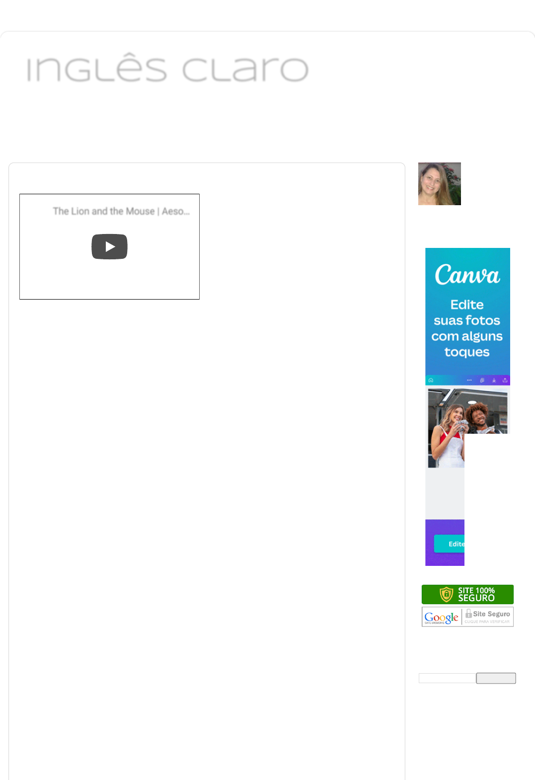 Dicas e Explicações para Aprender INGLÊS Inglês ClaroInglês Claro Início Artigos Vocabulário Reading and Listening Questões Enem VÍDEOS Fábula: The Lion and the Mouse + Exercícios Ative as legendas em inglês para acompanhar a leitura no próprio vídeo ou leia abaixo. One day, a mighty lion, tired from hunting all morning, laid down to take a nap under a large, shady tree. Some mice that lived at the foot of the tree scrambled over the sleeping lion to return to their home. But just as the last mouse was crawling over him, the lion woke up. The lion laid his big paw on the little mouse, trapping him. The mouse was very afraid. He apologized to the lion for disturbing him and begged him to spare his life and let him go. The lion pitied the little mouse, so he lifted his paw and set the mouse free. Some time later, the lion was walking near the mouse's home. The lion accidentally stepped on a trap set by a hunter, and a net made of thick ropes captured the lion and pulled him up into a tree. The lion struggled to free himself but could not. His angry roars rumbled through the forest as he became upset and afraid. The Lion and the Mouse | AesoThe Lion and the Mouse | Aeso…… Cristina Faria Ver meu perfil completo QUEM SOU EU Pesquisar PESQUISAR ESTE BLOG Como falar inglês com fluência: 1) Entenda que não há uma "Fórmula Mágica" Isso significa que 10 Dicas para Falar Inglês com Fluência https://www.inglesclaro.com/ https://www.inglesclaro.com/ https://www.inglesclaro.com/p/aqui-se-encontram-os-artigos-publicados.html https://www.inglesclaro.com/p/vocabulario.html https://www.inglesclaro.com/p/e.html https://www.inglesclaro.com/p/questoes-enem.html https://www.inglesclaro.com/p/v.html https://www.youtube.com/watch?v=iPybpc-xuG0 https://www.blogger.com/profile/08520796039695148329 https://www.blogger.com/profile/08520796039695148329 https://www.blogger.com/profile/08520796039695148329 https://adclick.g.doubleclick.net/pcs/click?xai=AKAOjstYOtEDNrYH1zy-lBLTSJWTsYfDqm2q27mh-XSuZLMUIgYTmU9UJAVUsMmI5Siq_iyZE_QAgjWu7DiCvaA9C49DYUVMdV9MDsyOMRteEq7Cj622QFUzM9-egZ3tcgFN_ZVPMLGyWxj59f5T7KUBY5-PTAJDhFqmO60JJfjz_rIJKXxj7QiRqpkKAykWebLJ0xl4HEN4IU6T2FOsSek2XrO6ZO-_utw8dO9JK8ofgIUMK4-KFFiXlCj_UDbQPKeJy8TjeYgewQOWlA2EnZAnafbmHoqwIbUxYVw3Hp_azW5Inpq3xiHh4tEcouEpcSXAsE0-ou7zqKUnudvwNjI0Ls8VvaMueuWvj_CyFpcJ6BBU-QFnPTa1vilDshMl_eSiz7iS3zIrSY_0QKWxODXZA9HyjsSPhHmaBhwu5NVP4jEHw70imIbtW4JsVI4L-tUSAXjn5rHUDYuKwXgqqtyL77JMWwuqSKIqS2dY_iDRCkqmPJgF2kxW4NZUnhqZI06ciAE-qm8WesE7ds4XAq0CBRU9Jzzfj7jA03Ab-oSUi2f3q9GxcM-S2FHXuFoK0SF_f01L9u8BxMxsslBZZfiu_08pZWF7bsqPE6dEoyRtY27UWFGQdDKrtUIBMwNxaIEVO3WpVEVEGSOPb2CizXT-_CRj_CBN__Ot7-Tm4S0tKvkb4_rKHVyNALQ8DcVwsbjN34I5m1SvT78ZsvgV8-kJkQEPWf3FXxctebdlf4BvRc7bTEU65XPYqzJjy7lCd1isOGILK2zErwz9qnWyY2zmly1WPPwm6LzJsTnDi55Xc65LQXULz6BAtbEdVTwi3CBlAl0e8ac2X0-_-cF0HQnGZel37gsUlc499OmyqstC2Zpkmp5R3VhbnGwlvAaDdkS_wHLrIoib3cst8Yen5Cu4hjbrT5pH19i1yLCtFLRm56_yp6zRwZLhGZKUkluetFoxf8O1Be8r7Hmkiaf3qdyfmGT-0KMcbnj-si2KmDX-Y6_qP-ti1YP4bMoRXqba2Gsqn2pQL9ULhmCbVNOZpxQd1B3TmpTSzsbaOPyfZyq53l1_76rmwJtx4ddLYEhvPJZNywwEFkpyhHIZfaXfEuaZStTkBCN7fHeA0tx-z_dBLDAC1k3fKIoOtpc9WI2K6adgFiuvKXXTYfoPfdNO75q_YjOue0rPkGOQ_VacmnS4RlvDB3UXQcXY8n6hc83om67--W0AbkmYhULcgDanHYT4Num6eAh466zFCn2fI3gYvAtPrGFjkYPdx_Z18g&sai=AMfl-YQiah31nMKDk3C5f0z9XkBVMlrjx-Ckc4_F5eUZZ8R__olL0Dcjhm8GTKlvCA8e79HDInpzWtvhAs8dRrxnmlKgcN1NZZNS9ej18Oki1wxkKgNyUa4TsAiGI5PzDgPk3G4I-QJgKU5XRDaSY5YW_UImboj_hr9ndf8Kx6IYRVvUB5KDm8i6lavcTAAlhtAcb-wSsvThd_e9HiaoIqroio26P0aVB-9hEMiSlmAUeNvNddNC-AZRHFbUfs0UrWVJ2dSbtaWgRx67XH5mFjZlKoqwio-Lh1nmwurUli9C34ClmYp41yBtXsXHt6OpDHarDhq5HelK_wZec3KWa83j3VHuNYhhg5x-4qAj4ueA-n5wZQ&sig=Cg0ArKJSzC3bztcpv2RL&cry=1&fbs_aeid=[gw_fbsaeid]&urlfix=1&adurl=https://canva.com/signup%3Futm_medium%3Ddisplay%26utm_source%3Ddv360%26utm_campaign%3Dbr_en_all_pro_acq_conversion_programmatic-display-mau%26utm_term%3D2021_photoeditor%26dclid%3D%25edclid! https://transparencyreport.google.com/safe-browsing/search?url=www.inglesclaro.com https://www.inglesclaro.com/2015/05/como-falar-ingles-com-fluencia.html The mouse heard the lion's cries. Remembering the lion's kindness, the mouse ran to the tree and climbed up to the trap. He used his sharp little mouse teeth to gnaw through the thick ropes and set the lion free. The lion and the mouse were friends forever after. Both of them had learned that it is good to help someone who has helped you. Moral of the story: Good deeds are rewarded. Vocabulário: 1) mighty = poderoso 2) tired = cansado 3) take a nap = tirar uma soneca 4) tree = árvore 5) scrambled over = passar por cima 6) crawling = rastejando 7) paw = pata 8) trapping = prendendo 9) apologized = pediu desculpas 10) spare his life = poupar sua vida 11) pitied = ficou com pena 12) trap = armadilha 13) ropes = cordas 14) struggled = lutou 15) roars = rugidos 16) rumbled = ecoaram 17) kindness = bondade/gentileza 18) sharp = afiado 19) teeth = dentes 20) gnaw = roer EXERCISES 1) Escolha a resposta correta: a) What was a lion doing one day? b) Who was crawling over the lion? c) Who woke up? d) Who was very afraid? e) Did the lion eat the mouse? f) Where was the lion walking some time later? g) What captured the lion? h) Who heard the lion's cries? i) What did the mouse gnaw? j) Who set the lion free? 2) Marque Verdadeiro ou Falso: a) Um dia o rato estava dormindo. ( ) Verdadeiro ( ) Falso não há nenhuma maneira secre... TOTAL DE VISUALIZAÇÕES DE PÁGINA 6 8 7 1 5 5 INSCREVER-SE Postagens Comentários Postado por Cristina Faria às 21:32 Marcadores: Aesop's fable, the lion and the mouse b) O rato acordou o leão. ( ) Verdadeiro ( ) Falso c) O rato pediu desculpas ao leão. ( ) Verdadeiro ( ) Falso d) O leão comeu o rato. ( ) Verdadeiro ( ) Falso e) O leão ficou com pena do rato. ( ) Verdadeiro ( ) Falso f) O leão correu atrás do rato. ( ) Verdadeiro ( ) Falso g) O leão ficou preso em uma armadilha. ( ) Verdadeiro ( ) Falso h) O leão se libertou sozinho. ( ) Verdadeiro ( ) Falso i) O rato ajudou o leão. ( ) V