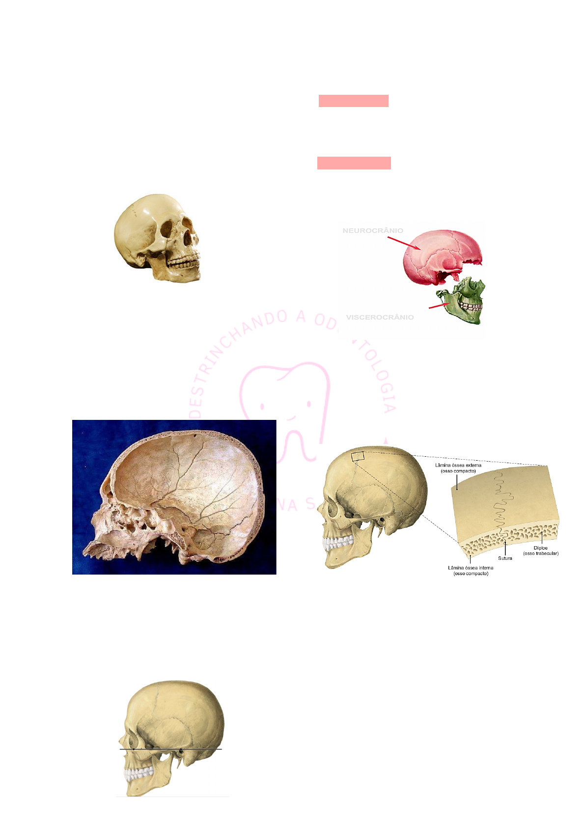 Crâni� @Destrinchando.a.odontologia ➔ Introduçã�: • Constituído por 22 ossos; • Unidos em sua maioria por tecido conjuntivo fibroso (junturas fibrosas ou articulações fibrosas), o que confere imobilidade a essas articulações. • Exceção - juntura (articulação) sinovial, uma estrutura móvel entre a mandíbula e o osso temporal. • Sua principal função é alojar e proteger o encéfalo. • Garante proteção às partes iniciais dos sistemas respiratório e digestório, e aos órgãos dos sentidos especiais (audição, visão, equilíbrio). • Tem ainda aberturas (forame mentual, por exemplo) para a passagem de vasos e nervos. • A maxila e a mandíbula apresentam estrutura óssea adequada para suporte dos dentes. ➔ P�içã� anatômic� par� estud�: • Plano orbitomeático ou orbitomeatal (plano de Frankfurt). • Paralelo à linha do solo e corresponde à posição natural do crânio com o indivíduo em posição anatômica. • O neurocrânio - 8 ossos (um frontal, dois temporais, um occipital, dois parietais, um esfenóide e um etmóide) os quais delimitam a cavidade do crânio que contém o encéfalo. • O viscerocrânio - 14 ossos (dois nasais, dois lacrimais, duas maxilas, dois zigomáticos, uma mandíbula, duas conchas nasais inferiores, dois palatinos, um vômer) que formam o esqueleto da face. ● Morfologicamente a maioria dos ossos do crânio apresenta uma camada média de osso esponjoso (ou trabecular), a díploe, que está localizada entre duas camadas de osso compacto (cortical): uma lâmina (tábua) óssea externa e uma lâmina óssea interna. • A díploe apresenta uma série de canais ósseos denominados canais diplóicos, que são ocupados em geral por veias diploicas. Eles podem perfurar as lâminas ósseas interna ou externa e, assim, estabelecer anastomoses entre veias internas e externas do crânio. • A parte superior do crânio, denominada calvária ou calota do crânio, apresenta a lâmina óssea externa mais espessa e convexa. • Os ossos do neurocrânio são revestidos externamente por periósteo, o pericrânio, que tem pouca capacidade osteogênica. • Internamente, o neurocrânio é forrado pelo folheto externo da dura-máter, o endocrânio, que não tem capacidade osteogênica. ➔ Acidente� �se�: • Alterações na superfície dos ossos, as quais podem ser saliências, reentrâncias e aberturas que se notam na superfície dos ossos. Os acidentes ósseos se associam às partes moles do nosso corpo, como músculos, fáscias, artérias, veias e nervos. • As saliências geralmente permitem a fixação de músculos, fáscias e ligamentos, e recebem nomes diversos, como: processos, margens, cristas, linhas, rugosidades, espinhas, côndilos etc. • As reentrâncias ou depressões ósseas geralmente alojam órgãos ou ainda músculos, vasos e nervos, e denominam-se: sulcos, fossas, fóveas, fovéolas, incisuras etc. • As aberturas no crânio podem ser arredondadas (forames) e geralmente permitem a passagem de vasos, nervos ou mesmo parte de órgãos; quando têm forma de fendas, são chamadas de fissuras; ➔ Diferença� entr� crâni� feminin� � masculin�: • Atualmente, é difícil distinguir se um crânio é masculino ou feminino, a tração mecânica dos músculos nos ossos tem diminuído consideravelmente, o que reduz seus relevos. ➔ Desenvolviment� � �sificaçã�: • Por estar em crescimento, o crânio neonatal apresenta áreas membranáceas temporárias entre os ossos da calvária do crânio, denominadas fontículos ou fontanelas (“moleiras”). • No recém-nascido praticamente todo o encéfalo, os olhos e as orelhas já estão formados e não irão crescer muito com o desenvolvimento normal. Assim, o neurocrânio apresenta uma dimensão praticamente definida. • O neurocrânio cresce até os 2 anos de idade aproximadamente, acompanhando o crescimento encefálico, e depois disso cresce relativamente pouco. • O viscerocrânio, por sua vez, cresce muito, em todas as fases até a adulta. As atividades respiratórias e digestivas exercem papel importante no crescimento inicial do viscerocrânio. • A expansão dos seios paranasais e o surgimento dos dentes provocam grandes surtos de crescimento na face. - 1º surto de crescimento deve-se à erupção dos dentes decíduos. - 2º surto é associado à erupção dos dentes permanentes. • A partir daí, o crescimento facial ocorre, sobretudo, na dependência de trações musculares. No adulto pode-se afirmar que o neurocrânio e o viscerocrânio estão proporcionais em dimensões, sendo o neurocrânio ainda ligeiramente maior. ➔ Vist� superior d� crâni�: • O crânio é bastante liso e uniforme, pois não há inserções musculares importantes nem passagem de vasos ou nervos significativos. • Formato ovóide, mais ampla posteriormente. - Osso parietal + parietal: sutura sagital; - Vértice: Ponto mais alto do crânio; - Osso parietal + osso frontal: Sutura coronal; - Bregma: É a união dos 2 parietais com o frontal; - Lâmina: 2 parietais com o occipital; - Sutura lambdóide: União das suturas; ● Osso Parietal: ➔ Vist� p�terior d� crâni�: • Esta vista inicialmente é lisa, mas, em direção inferior, ela se torna mais acidentada, por causa da fixação de músculos do pescoço que sustentam a cabeça. • A sutura occipitomastóidea une de cada lado o occipital e o processo mastóide do temporal, ao passo que a sutura parietomastóidea une o parietal com esse mesmo processo do temporal; • Denomina-se astério o ponto de encontro das suturas parietomastóidea e occipitomastóidea com a sutura lambdóidea. • A protuberância occipital externa é uma projeção mediana facilmente palpável in vivo. ➔ Vist� anterior d� crâni�: • Esta vista é bem mais complexa e irregular que as anteriores, pois apresenta uma série de cavidades nas quais se alojam estruturas que nos permitem relacionar com
