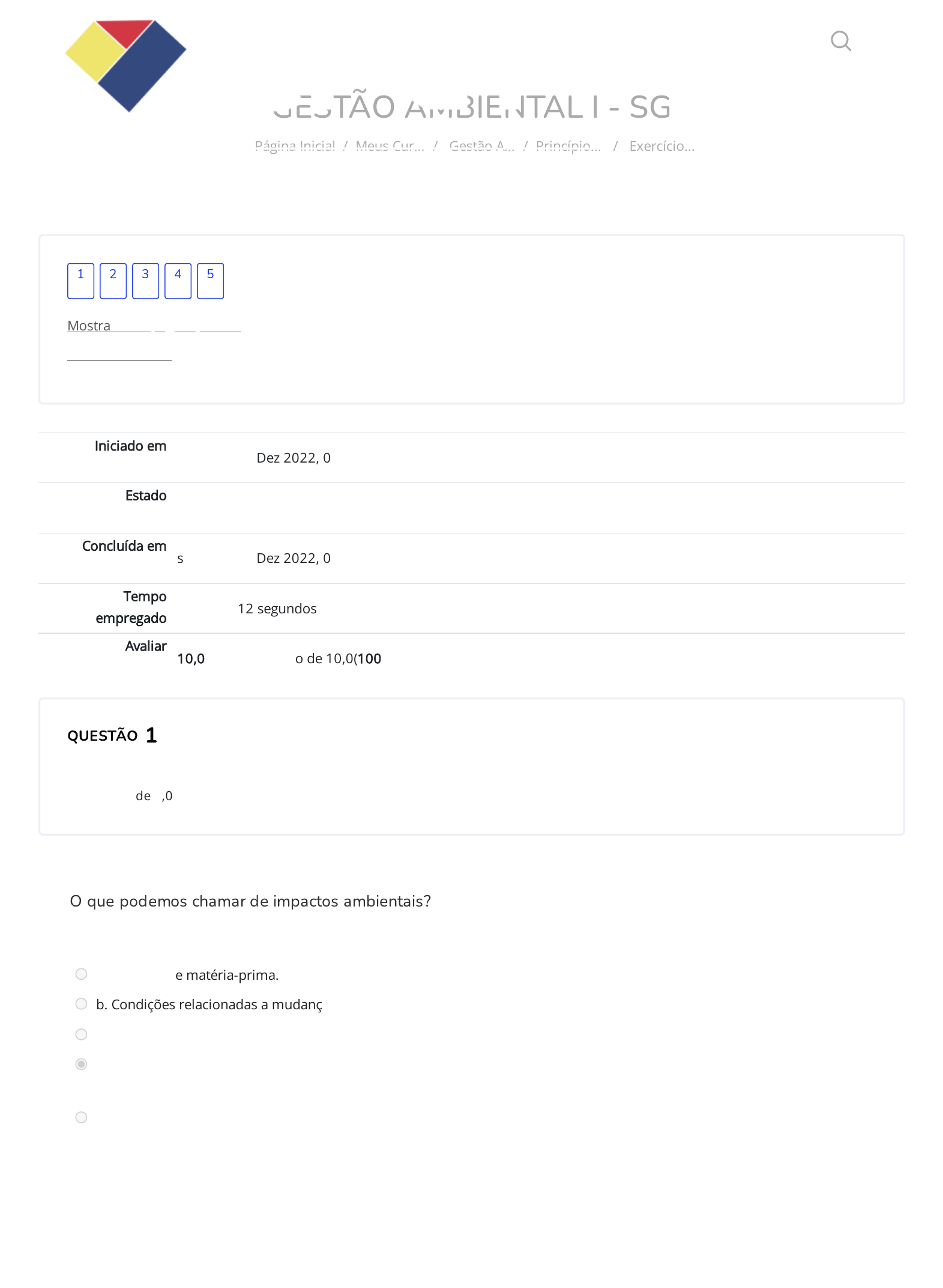19/12/2022 09:19 Exercício de Fixação - Princípios da responsabilidade socioambiental: Revisão da tentativa https://cpetead.com.br/mod/quiz/review.php?attempt=3350432&cmid=47844 1/4 GESTÃO AMBIENTAL I - SG Página Inicial / Meus Cur… / Gestão A… / Princípio… / Exercício… Iniciado em segunda, 19 Dez 2022, 09:18 Estado Finalizada Concluída em segunda, 19 Dez 2022, 09:19 Tempo empregado 1 minuto 12 segundos Avaliar 10,0 de um máximo de 10,0(100%) QUESTÃO Correto Atingiu 2,0 de 2,0 Mostrar uma página por vez Terminar revisão 1 2 3 4 5 1 O que podemos chamar de impactos ambientais? Escolha uma opção: a. Extração de matéria-prima. b. Condições relacionadas a mudanças climáticas e efeito estufa c. Impactos sociais, principalmente em países em desenvolvimento. d. Conjunto de componentes físicos, químicos, biológicos e sociais capazes de causar efeitos diretos ou indiretos no ambiente ou na sociedade. e. Alteração ou efeito ambiental considerado signi�cativo quando são detectados somente por meio da avaliação de projeto de um determinado empreendimento, podendo ser negativo ou positivo. Sua resposta está correta. A resposta correta é: Conjunto de componentes físicos, químicos, biológicos e sociais capazes de causar efeitos diretos ou indiretos no ambiente ou na sociedade. https://cpetead.com.br/ https://cpetead.com.br/course/view.php?id=2012 https://cpetead.com.br/mod/quiz/view.php?id=47844 https://cpetead.com.br/mod/quiz/review.php?attempt=3350432&cmid=47844&showall=0 https://cpetead.com.br/mod/quiz/view.php?id=47844 https://cpetead.com.br/ 19/12/2022 09:19 Exercício de Fixação - Princípios da responsabilidade socioambiental: Revisão da tentativa https://cpetead.com.br/mod/quiz/review.php?attempt=3350432&cmid=47844 2/4 QUESTÃO Correto Atingiu 2,0 de 2,0 QUESTÃO Correto Atingiu 2,0 de 2,0 2 Como opções de tecnologias sustentáveis podemos citar: Escolha uma opção: a. Ecodesign e neutralização de carbono. b. Motores a reação e energia eólica. c. Combustíveis fósseis e energia solar. d. Recursos renováveis e combustível à base de carvão. e. Eco design e motores carburantes. Sua resposta está correta. A resposta correta é: Ecodesign e neutralização de carbono. 3 A responsabilidade socioambiental procura aliar produtividade, qualidade, ética e bem-estar social e ambiental, e assim está baseada em três pilares, os mesmos pilares da sustentabilidade. Marque a alternativa que indica corretamente quais são esses “pilares”. Escolha uma opção: a. Social, Econômico e Mundial. b. Ambiental, Jurídico e Mundial. c. Econômico, Social e Político. d. Social, Ambiental e Econômico. e. Econômico, Ambiental e Jurídico. Sua resposta está correta. A resposta correta é: Social, Ambiental e Econômico. 19/12/2022 09:19 Exercício de Fixação - Princípios da responsabilidade socioambiental: Revisão da tentativa https://cpetead.com.br/mod/quiz/review.php?attempt=3350432&cmid=47844 3/4 QUESTÃO Correto Atingiu 2,0 de 2,0 4 "A �oresta virgem é o produto de muitos milhões de anos que passaram desde a origem do nosso planeta. Se for abatida, pode crescer uma nova �oresta, mas a continuidade é interrompida. A ruptura nos ciclos de vida natural de plantas e animais signi�ca que a �oresta nunca será aquilo que seria se as árvores não tivessem sido cortadas. A partir do momento em que a �oresta é abatida ou inundada, a ligação com o passado perde-se para sempre. Trata-se de um custo que será suportado por todas as gerações que nos sucederem no planeta. É por isso que os ambientalistas têm razão quando se referem ao meio natural como um "legado mundial". Mas, e as futuras gerações? Estarão elas preocupadas com essas questões amanhã? As crianças e os jovens, como indivíduos principais das futuras gerações, têm sido, cada vez mais, estimulados a apreciar ambientes fechados, onde podem relacionar-se com jogos de computadores, celulares e outros equipamentos interativos virtuais, desviando sua atenção de questões ambientais e do impacto disso em vidas no futuro, apesar dos esforços em contrário realizados por alguns setores. Observe- se que, se perguntarmos a uma criança ou a um jovem se eles desejam �car dentro dos seus quartos, com computadores e jogos eletrônicos, ou passear em uma praça, não é improvável que escolham a primeira opção. Essas posições de jovens e crianças preocupam tanto quanto o descaso com o desmatamento de �orestas hoje e seus efeitos amanhã." SINGER, P. Ética Prática. 2 ed. Lisboa: Gradiva, 2002, p. 292 (adaptado). Assinale a alternativa que melhor re�ete a realidade do texto Escolha uma opção: a. Engajamento de crianças e jovens na preservação do legado natural: uma necessidade imediata. b. Redução de investimentos no setor de comércio eletrônico: proteção das gerações futuras. c. Preferências atuais de lazer de jovens e crianças: preocupação dos ambientalistas. d. Computador: o legado mundial para as gerações futuras. e. A falta de Socialização dos jovens In�uenciando o contexto socioambiental. Sua resposta está correta. A resposta correta é: Engajamento de crianças e jovens na preservação do legado natural: uma necessidade imediata. 19/12/2022 09:19 Exercício de Fixação - Princípios da responsabilidade socioambiental: Revisão da tentativa https://cpetead.com.br/mod/quiz/review.php?attempt=3350432&cmid=47844 4/4 QUESTÃO Correto Atingiu 2,0 de 2,0 5 O homem ocasiona alterações no meio ambiente em geral, seja nos componentes físicos, biológicos ou sociais. Sua atividade provoca situações que afetaram a saúde humana. Analise os itens a seguir: I. Acidentes nucleares II. Tsunamis III. Epidemias, como a peste negra IV. Incêndios e vazamentos de gases em grandes indústrias V. Terremotos Tendo em vista os itens acima, assinale a alternativa que indica três problemas de responsabilidade humana que afetam o meio ambiente e 