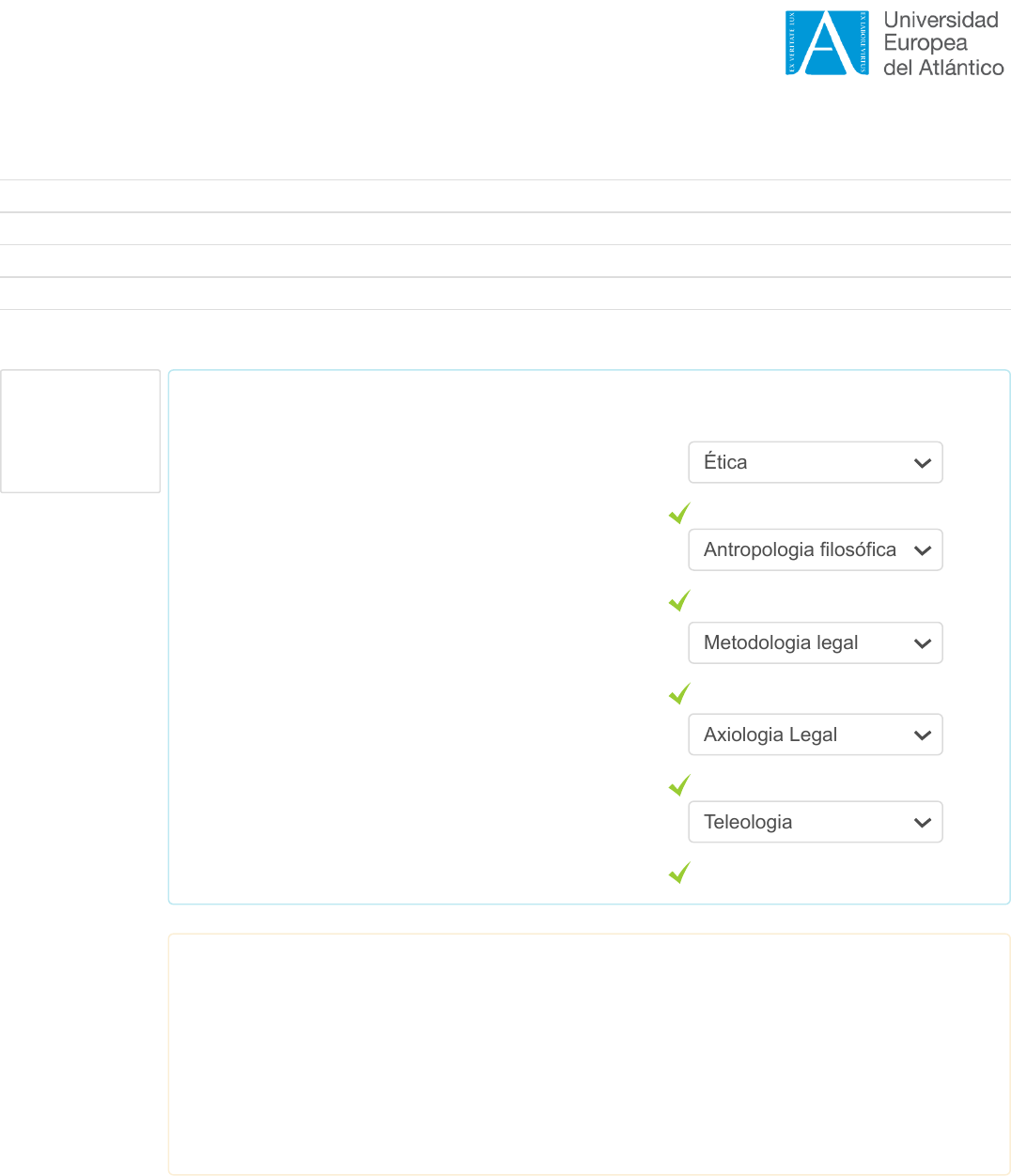 Página principal ► DEMDER###2021-TFC ► MD002 ► Tópico 3 ► Exame Pergunta 1 Correta Nota: 1,30 em 1,30 Iniciada Friday, 16 December 2022, 13:43 Estado Terminada Terminada Friday, 16 December 2022, 14:44 Tempo gasto 1 hora 1 minuto Nota 6,85 num máximo de 10,00 (69%) Relacione cada definição com suas características. - É a ciência que estuda a bondade ou a maldade dos atos humanos. - É o ramo da filosofia que lida com o estudo do ser humano. - É uma disciplina que estuda a aplicação dos métodos do conhecimento às diferentes áreas do direito. - Estuda os valores que regem as normas legais e sua aplicação. - É a doutrina das causas finais. Respuesta correcta A resposta correcta é: - É a ciência que estuda a bondade ou a maldade dos atos humanos. → Ética, - É o ramo da filosofia que lida com o estudo do ser humano. → Antropologia filosófica, - É uma disciplina que estuda a aplicação dos métodos do conhecimento às diferentes áreas do direito. → Metodologia legal, - Estuda os valores que regem as normas legais e sua aplicação. → Axiologia Legal, - É a doutrina das causas finais. → Teleologia Ética Antropologia filosófica Metodologia legal Axiologia Legal Teleologia https://campus2.funiber.org/ https://campus2.funiber.org/course/view.php?id=5266 https://campus2.funiber.org/course/view.php?id=4636 https://campus2.funiber.org/course/view.php?id=4636#section-3 https://campus2.funiber.org/mod/quiz/view.php?id=212724 Pergunta 2 Parcialmente correta Nota: 0,52 em 1,30 Assinale verdadeiro ou falso: - A sociologia jurídica de Radbruch e Pound, a pura teoria do direito de Hans Kelsen e a jurisprudência de Austen fazem parte das tendências do realismo jurídico. - Michel Foucault é um estudioso do poder, especialmente do Estado. - Noam Chomsky argumenta que o proletariado pode criar uma guerra para a busca do poder e não da justiça. - A teoria de H.L.A. Hart é juspositivista. - Os pontos relevantes da teoria de Ronald Dworkin podem ser encontrados em seu livro "O conceito de direito". Respuesta parcialmente correcta. Selecionou 2 respostas corretas. A resposta correcta é: - A sociologia jurídica de Radbruch e Pound, a pura teoria do direito de Hans Kelsen e a jurisprudência de Austen fazem parte das tendências do realismo jurídico. → VERDADEIRO., - Michel Foucault é um estudioso do poder, especialmente do Estado. → VERDADEIRO., - Noam Chomsky argumenta que o proletariado pode criar uma guerra para a busca do poder e não da justiça. → FALSO., - A teoria de H.L.A. Hart é juspositivista. → VERDADEIRO., - Os pontos relevantes da teoria de Ronald Dworkin podem ser encontrados em seu livro "O conceito de direito". → FALSO. FALSO. VERDADEIRO. FALSO. FALSO. VERDADEIRO. Pergunta 3 Parcialmente correta Nota: 0,50 em 1,00 Assinale verdadeiro ou falso: - A hipótese normativa é a circunstância condicionada e prevista na regra e na qual o caso específico deve ser aplicado. - A axiologia legal é a consideração do direito como mero produto sociológico, como manifestação da vida social. - Coerção é a possibilidade abstrata que o sistema legal tem de aplicar uma sanção a uma conduta ilegal. - No sistema jurídico, o direito interno privado é a lei entre particulares, sem a intervenção do Estado em seu vínculo jurídico. Respuesta parcialmente correcta. Selecionou 2 respostas corretas. A resposta correcta é: - A hipótese normativa é a circunstância condicionada e prevista na regra e na qual o caso específico deve ser aplicado. → VERDADEIRO., - A axiologia legal é a consideração do direito como mero produto sociológico, como manifestação da vida social. → FALSO., - Coerção é a possibilidade abstrata que o sistema legal tem de aplicar uma sanção a uma conduta ilegal. → FALSO., - No sistema jurídico, o direito interno privado é a lei entre particulares, sem a intervenção do Estado em seu vínculo jurídico. → VERDADEIRO. VERDADEIRO. FALSO. VERDADEIRO. FALSO. Pergunta 4 Parcialmente correta Nota: 0,75 em 1,00 Pergunta 5 Correta Nota: 0,27 em 0,27 Assinale verdadeiro ou falso: - A lei natural não é a mesma para todos os povos; ela varia de país para país, refletindo desta forma a vida social de cada lugar. - O direito natural é um conjunto de máximas baseadas na equidade, justiça e bom senso, que são impostas ao próprio legislador e surgem das exigências da natureza biológica, racional e social do homem. - Emil Durkheim (1858-1917) é o fundador da escola sociológica de direito. - A luta dos afro-americanos nos Estados Unidos da América é um exemplo da luta contra as estruturas. Respuesta parcialmente correcta. Selecionou 3 respostas corretas. A resposta correcta é: - A lei natural não é a mesma para todos os povos; ela varia de país para país, refletindo desta forma a vida social de cada lugar. → FALSO., - O direito natural é um conjunto de máximas baseadas na equidade, justiça e bom senso, que são impostas ao próprio legislador e surgem das exigências da natureza biológica, racional e social do homem. → VERDADEIRO., - Emil Durkheim (1858- 1917) é o fundador da escola sociológica de direito. → VERDADEIRO., - A luta dos afro-americanos nos Estados Unidos da América é um exemplo da luta contra as estruturas. → VERDADEIRO. Esta ciência leva em conta três aspectos: virtudes, normas e bens: Selecione uma opção de resposta: a. Metafísica. b. Teologia. c. Teleologia. d. Ética. Respuesta correcta A resposta correta é: Ética. FALSO. FALSO. VERDADEIRO. VERDADEIRO. Pergunta 6 Correta Nota: 0,27 em 0,27 Pergunta 7 Correta Nota: 0,27 em 0,27 Pergunta 8 Correta Nota: 0,27 em 0,27 A aplicação da regra pode ser comprometida pela questão de se ela pode ou não ser aplicada a eventos ou atos jurídicos que se originaram quando uma disposição legal anterior estava em vigor do que a vigente no momento do estudo: Selecione uma opção de resposta: a. Retroatividade. b. Vigê