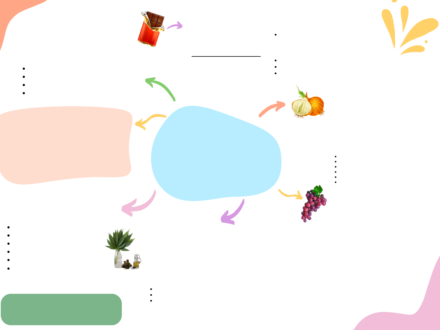 vômitos diarreia tremores apatia depressão dor abdominal. Intoxicações domésticas Uva Cebola Chocolate Maconha Estabilizar o paciente com medicamentos como diazepam, propanolol, atropina e lindocaína. Fluidoterapia. Indução de êmese. Lavagem gástrica O tratamento para intoxicação por chocolate consiste em: Itens que levam a taxas mais altas de intoxicações domésticas em cães e gatos. Uva Maconha Em geral, os sinais clínicos de intoxicação são: Mecanismos de toxicidade, métodos diagnósticos e aspectos histopatológicos, clínicos e terapêuticos da intoxicação alimentar variam com o tipo de alimento, quantidade ingerida e espécie. O chocolate é o exemplo mais clássico, por sua alta palatabilidade, ocorrendo a intoxicação devido a substancias que o compõe: teobromina e a metilxantina. Quanto mais escuro o chocolate maior o teor de teobromina presente no alimento. As cebolas podem causar distúrbios hematológicos porque são facilmente absorvidas e metabolizadas, oxidam a hemoglobina e reduzem a oxigenação de outros tecidos. Cebola Chocolate Além dos sintomas gerais já citados o animal intoxicado por cebola apresenta também mucosas pálidas a ictéricas, hemoglobinúria, taquicardia, taquipneia e cianose. Indução de êmese – até 2 horas Carvão ativado N-acetilcisteína Transfusão sanguínea para casos graves Hemoglobina bovina polimerizada Oxigenoterapia O tratamento inclui Os mecanismos de intoxicação são desconhecidos, mas estão relacionados à presença de taninos e monossacarídeos, que algumas espécies são tolerantes e não podem ser metabolizados. Além dos sintomas gerais já citados, os animais intoxicados pela uva apresentam oligúria e anúria, alterações bioquímicas da uréia e da creatinina, levando à insuficiência renal aguda. É uma planta frequentemente utilizada como droga recreativa, embora seja ilegal no Brasil, pode causar intoxicação em cães e gatos, pela ingestão de resíduo de cigarro ou qualquer parte da planta (raiz, caule, folhas ou flor), natural ou seco. O tratamento recomendado é a indução de êmese, administração de carvão ativado, fluidoterapia de suporte, furosemida e ranitidina como protetor de mucosa. O animal apresenta sinais neurológicos, cardiovasculares e gastrintestinais geralmente de 2 a 3 horas após ingestão. Fluido – Ringer – estabilizar e termorregular Diurético: furosemida Diazepam para animais agitados – baixa dose Tratamento recomendado para minimizar a absorção: A recuperação pode rápida, em até 24 horas, dependendo da severidade do caso. Aluna: Mariana Costa Moreira Cruz Disciplina: Toxicologia Veterinária - Unileão Turma: 305.5 Porfessor: Weibson Pinheiro