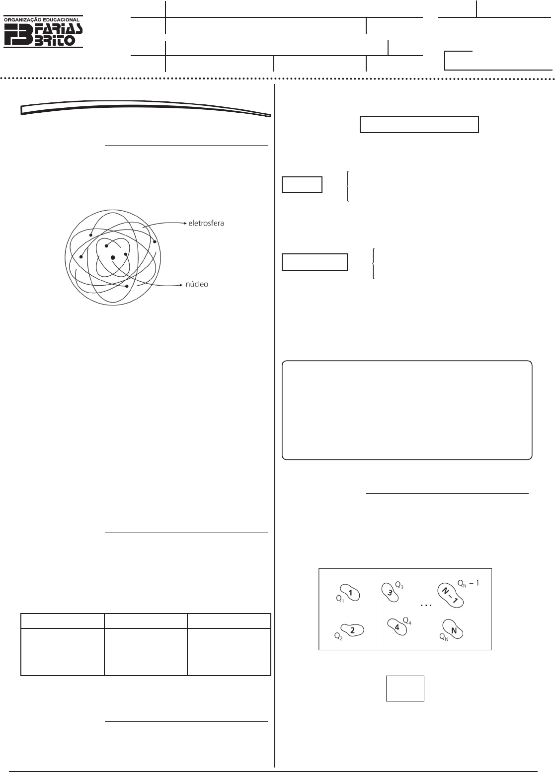 Série Ensino TC Pré-Universitário ____/____/____ rUmo ao ita marcos Haroldo Física Aluno(a) Turma Turno Data Sede Nº Professor(a) OSG.: 28356/10 Carga e Matéria / Lei de Coulomb Carga elétrica A partir do início deste século, várias experiências nos possibilitaram conhecer melhor a estrutura atômica da matéria. A representação clássica de um átomo, de acordo com o modelo de Rutherford-Bohr, é apresentada abaixo: Modelo atômico clássico. Neste modelo, os elétrons orbitam em torno do núcleo, numa região denominada eletrosfera. Os elétrons foram descobertos em 1897 por J. J. Thomson. Mais tarde foram descobertas as duas principais partículas existentes no núcleo: os prótons, correspondentes a um núcleo de hidrogênio e os nêutrons, cuja existência ficou comprovada com as experiências de J. Chadwick, em 1932. Conhecendo a estrutura atômica, podemos definir a carga elétrica pelas propriedades destas partículas. A carga elétrica pode ser conceituada como a propriedade de prótons e elétrons de interagirem eletricamente. Os nêutrons são desprovidos desta propriedade e portanto nâo têm carga elétrica. De acordo com a convenção anteriormente estabelecida por B. Franklin, os elétrons têm carga negativa e os prótons têm carga positiva. Unidades de carga elétrica No sistema MKS (SI) a unidade de carga é o Coulomb C, correspondente à carga elétrica que atravessa, em um segundo, a seção transversal de um condutor percorrido por uma corrente contínua de um ampére. Esta quantidade de carga é bastante grande, sendo mais utilizados os submúltiplos do Coulomb. SUBMÚLTIPLO SÍMBOLO VALOR miliCoulomb microCoulomb nanoCoulomb picoCoulomb mC mC nC pC 10–3C 10–6C 10–9C 10–12C Submúltiplos do Coulomb. Quantização da carga elétrica Todas as medidas experimentais têm mostrado que as cargas elétricas dos prótons e elétrons são iguais em valor absoluto. |q p | = |q e | = 1,602 × 10–19C = 4,80 × 10–10 sC Este valor de carga, denominada carga elementar, é uma constante universal, e simbolizado por: e = 1,602 × 10–19 Coulomb A conclusão que podemos tirar, já que a matéria é formada por partículas elementares, é que a carga é quantizada, e que a carga elétrica de todo corpo ou sistema pode ser escrita como: Q = ne onde Q = carga elétrica do corpo n = 0, ±1, ± 2, ... (número inteiro) e = carga elementar Como cada elétron contribui com – e para a carga total do corpo ou sistema e cada próton contribui com +e para a carga total, podemos concluir que a expressão acima pode ser reescrita como: Q = (n p – n e )e onde n p = número de prótons n e = número de elétrons Decorre, portanto que, se o número de prótons do corpo for maior que o número de elétrons, Q > 0 e o corpo está carregado (ou eletrizado) positivamente; se o número de prótons Q < 0 e o corpo está carregado (ou eletrizado) negativamente e se os números de prótons e elétrons forem iguais, Q = 0, o corpo é dito eletricamente neutro. Observação: A priori, um corpo eletricamente neutro poderia ficar eletrizado ganhando ou perdendo prótons ou elétrons. O que acontece, porém, é que os prótons são partículas bem mais pesadas (sua massa é cerca de 1836 vezes maior que a dos elétrons) e que estão fortemente ligadas ao núcleo, através de forças muito intensas e de curto alcance que ocorrem entre próton e próton, próton e nêutron, ou nêutron e nêutron. Conservação da carga A carga elétrica é uma grandeza conservada do Universo ou em qualquer sistema eletricamente isolado, ou seja, que não troca carga elétrica com sua vizinhança. Isto significa que a soma das cargas de um sistema isolado não se altera. Tomemos, por exemplo, o sistema abaixo, constituído de N corpos. A carga total do sistema é dada por: Q Qi I N = = ∑ 1 Onde Qi é a carga do i-ésimo corpo. Se por alguma razão os corpos interagem entre si, trocando cargas elétricas, o sistema adquire uma configuração diferente da inicial. OSG.: 28356/10 tC – físiCa 2 O princípio de conservação da carga prevê que a soma das cargas na configuração final, desde que o sistema isolado, é igual à inicial. Q Q Qi i NN ’ = = == ∑∑ 1 11 i onde Qi’ é a carga final do i-ésimo corpo. Princípio de atração e repulsão A interação entre cargas elétricas em repouso se dá na forma de forças atrativas ou repulsivas. O princípio de atração e repulsão reza que partículas carregadas com cargas de sinais iguais se repelem, enquanto que as carregadas com cargas de sinais opostos se atraem. Ou esquematicamente: + + Repulsão – – Repulsão + – Atração As características destas forças serão estudadas em detalhes na seção referente à Lei de Coulomb. Condutores e isolantes elétricos Condutores São meios em que as cargas elétricas se deslocam com facilidade, permitindo facilmente a passagem de corrente elétrica. Isto se deve à presença de portadores de carga com liberdade de movimento. Dentre vários exemplos, destacamos os metais, a grafite, os gases ionizados, as soluções iônicas eletrolíticas (como as soluções aquosas de ácidos, bases e sais), o plasma, o corpo humano e a Terra. Nos gases ionizados e nas soluções eletrolíticas os portadores de carga são íons, e a eficiência na condução de corrente elétrica depende do número de portadores. Tomemos os dois exemplos abaixo. Exemplo 1: Sejam duas soluções de NaCl em água destilada, sendo que a solução (1) tem concentração mais baixa que a solução (2). A montagem abaixo permite mostrar que a condução é mais eficiente na solução (2). e e Solução (1) Solução (2) Exemplo 2: Sejam duas soluções igualmente concentradas, uma de HCl (ácido clorídrico) e outra de CH 3 COOH (ácido acético) em água destilada. O primeiro é um ácido forte com alto grau de ionização, enquanto o segundo é um ácido fraco, que produz poucos íons. Como no exemplo anterior: e e Solução
