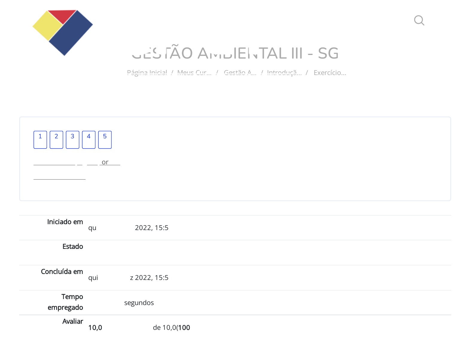 22/12/2022 15:59 Exercício de Fixação - Introdução à Educação ambiental: Revisão da tentativa https://cpetead.com.br/mod/quiz/review.php?attempt=3363903&cmid=48259 1/6 GESTÃO AMBIENTAL III - SG Página Inicial / Meus Cur… / Gestão A… / Introduçã… / Exercício… Iniciado em quinta, 22 Dez 2022, 15:58 Estado Finalizada Concluída em quinta, 22 Dez 2022, 15:59 Tempo empregado 1 minuto 2 segundos Avaliar 10,0 de um máximo de 10,0(100%) Mostrar uma página por vez Terminar revisão 1 2 3 4 5 https://cpetead.com.br/ https://cpetead.com.br/course/view.php?id=2041 https://cpetead.com.br/mod/quiz/view.php?id=48259 https://cpetead.com.br/mod/quiz/review.php?attempt=3363903&cmid=48259&showall=0 https://cpetead.com.br/mod/quiz/view.php?id=48259 https://cpetead.com.br/ 22/12/2022 15:59 Exercício de Fixação - Introdução à Educação ambiental: Revisão da tentativa https://cpetead.com.br/mod/quiz/review.php?attempt=3363903&cmid=48259 2/6 QUESTÃO Correto Atingiu 2,0 de 2,0 1 Atualmente o conceito de educação ambiental tem duas interpretações, de acordo com o contexto e conforme a in�uência e a vivência de cada indivíduo. Analise os itens a seguir: I. Trabalhar os aspectos físicos e químicos do ambiente. II. Levar em consideração a vida animal dentro dos ecossistemas. III. Desenvolver temas relacionados à natureza, ao lixo, às paisagens etc. IV. Buscar o equilíbrio entre o homem e o ambiente. V. Relacionar o homem e as paisagens. Quais dos itens acima estão implicados no conceito de educação ambiental? Escolha uma opção: a. III e IV. b. I e II. c. IV e V. d. I e III. e. II e IV. Sua resposta está correta. A resposta correta é: III e IV. 22/12/2022 15:59 Exercício de Fixação - Introdução à Educação ambiental: Revisão da tentativa https://cpetead.com.br/mod/quiz/review.php?attempt=3363903&cmid=48259 3/6 QUESTÃO Correto Atingiu 2,0 de 2,0 2 A Lei nº 9.795/99 dispõe sobre a educação ambiental e institui a Política Nacional de Educação Ambiental. O artigo 3º da referida lei informa que todos têm direito à educação ambiental e estabelece obrigações para algumas instituições. Nesse sentido assinale a alternativa CORRETA: Escolha uma opção: a. Os meios de comunicação de massa devem manter atenção permanente à formação de valores e atitudes que propiciem a solução de problemas ambientais. b. O Poder Público deve promover a educação ambiental de maneira integrada aos programas educacionais que desenvolvem. c. As instituições educativas devem de�nir políticas públicas que incorporem a dimensão ambiental. d. As empresas e entidades de classe devem capacitar os trabalhadores, visando ao controle sobre o ambiente de trabalho e sobre as repercussões da produção no meio ambiente. e. A sociedade como um todo deve colaborar para a disseminação de informações e práticas educativas sobre meio ambiente. Sua resposta está correta. A resposta correta é: As empresas e entidades de classe devem capacitar os trabalhadores, visando ao controle sobre o ambiente de trabalho e sobre as repercussões da produção no meio ambiente. 22/12/2022 15:59 Exercício de Fixação - Introdução à Educação ambiental: Revisão da tentativa https://cpetead.com.br/mod/quiz/review.php?attempt=3363903&cmid=48259 4/6 QUESTÃO Correto Atingiu 2,0 de 2,0 3 A educação ambiental nas organizações é muito importante. Geralmente muitas empresas elaboram projetos e programas de educação ambiental completamente formais, para cumprirem com uma "obrigação social". Nesse sentido, se a organização deve cortar gastos, seguramente um dos primeiros projetos a serem cortados serão os de educação ambiental. No entanto, um trabalho sério neste sentido pode trazer resultados positivos para a organização, basicamente por algumas razões básicas. Analise os itens a seguir: I. Obriga os empresários a desenvolverem ações de EA. II. Conduz aos pro�ssionais a uma mudança de atitude perante o meio ambiente. III. Estimula investimentos na área ambiental. IV. Desperta os funcionários para a ação e busca de soluções de problemas ambientais. V. Estabelece multas pelo descumprimento da política ambiental. Dos itens acima, quais poderiam ser considerados razões básicas para o trabalho de EA numa organização? Escolha uma opção: a. II, III e IV b. II, IV e V. c. III, IV e V d. I, II e III. e. I, III e IV. Sua resposta está correta. A resposta correta é: II, III e IV 22/12/2022 15:59 Exercício de Fixação - Introdução à Educação ambiental: Revisão da tentativa https://cpetead.com.br/mod/quiz/review.php?attempt=3363903&cmid=48259 5/6 QUESTÃO Correto Atingiu 2,0 de 2,0 QUESTÃO Correto Atingiu 2,0 de 2,0 4 Um programa de educação ambiental correto numa organização deve conter alguns aspectos básicos que farão com que a educação ambiental seja realmente uma ferramenta fundamental no sistema de gestão ambiental de uma empresa. Assinale a alternativa que NÃO apresenta um desses aspectos Escolha uma opção: a. Estar vinculado ao sistema de gestão ambiental da organização. b. Priorizar os interesses da empresa que o implanta. c. Conter atividades sistematizadas. d. Prever a participação do coletivo. e. Depender dos estudos de impacto ambientais Sua resposta está correta. A resposta correta é: Priorizar os interesses da empresa que o implanta. 5 Assinale a alternativa que apresenta CORRETAMENTE o objetivo fundamental de um programa de EA numa organização: Escolha uma opção: a. Cumprir com a legislação estabelecida. b. Melhorar os indicadores de performance da organização. c. Obter certi�cados. d. Melhorar a imagem da organização. e. Evitar multas e outras sanções à organização. Sua resposta está correta. A resposta correta é: Melhorar os indicadores de performance da organização. ◄ Conteúdo de Estudo - Introdução à Educação ambiental Seguir para... Conteúdo de Estudo - Sustentabilidade e 