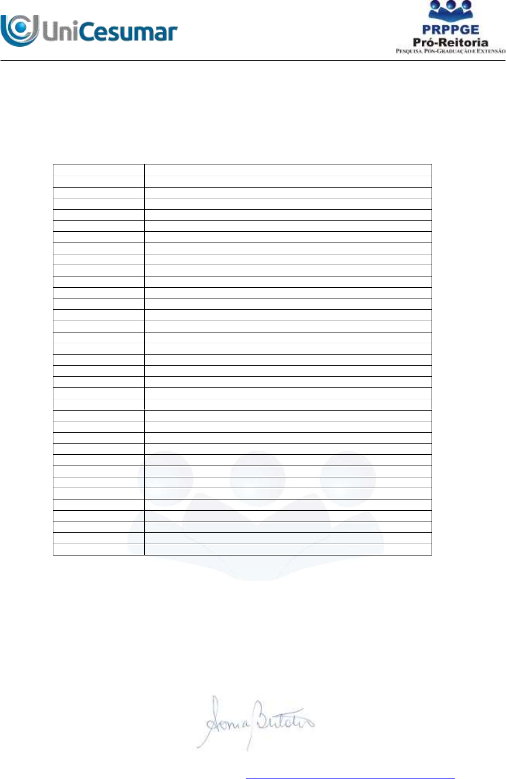 Av. Guedner, 1116 – Jardim Aclimação . Maringá – PR . CEP 87.050-900 Fone: (44)3027-6360 ramal 1178/21/53/1475/1598 site: http://www.unicesumar.edu.br/mestrado/promocaodasaude/ EDITAL N O 016 /2015 – RESULTADO FINAL DO PROCESSO SELETIVO PARA INGRESSO NO PROGRAMA DE PÓS- GRADUAÇÃO EM PROMOÇÃO DA SAÚDE – UNICESUMAR/2016 O colegiado do Programa de Pós-Graduação em Promoção da Saúde – PPGPS, nível mestrado, do Centro Universitário de Maringá - UNICESUMAR, no uso de suas atribuições legais e regimentais, atendendo ao disposto no EDITAL n o 013/2015, torna pública a relação dos CANDIDATOS APROVADOS no Processo de Seleção de vagas para ingresso no ano de 2016. CLASSIFICAÇÃO CANDIDATOS 1º MATEUS DIAS ANTUNES 2º FÁBIO RICARDO ACENCIO 3º RAQUEL COSTA MACHADO 4º GRAZIELA CLEMENTINA GALVANI VIEIRA 5º GLAUKUS REGIANI BUENO 6º GLAUCIA MAYRA DE FREITAS 7º RAQUEL LIMA DE BRIDA 8º PAULO DE ASSIS CHAVES FILHO 9º MARIA LAURA ICART NEME 10º KATIANE APARECIDA SOAIGHER 11º LETÍCIA COLEONI MARQUES 12º MAURÍCIO FERRAZ VIANA 13º MAYARA CAROLINA FORMIGONI 14º FLÁVIA CRISTINA BUSCH BOREGAS 15º WDSON DONIZETI DA SILVA COSTA 16º LILIAN CATARIM FABIANO 17º CARINA DE CARVALHO VIEIRA LIMA 18º AMANDA DE CARVALHO DUTRA 19º JEFERSON DE SOUZA SÁ 20º ELZA MARIA PANKA OLIVETI 21º THAIS FERNANDES KOGA 22º BRUNA GEOVANA GOBBO SANTI MAZETTI 23º FÁBIO FERREIRA MUNIZ 24º ANDRESSA FERREIRA 25º VANESSA JAQUELINE BAPTISTA 26º PATRICIA SANTANA RIBEIRO 27º PABLO GONÇALVES DE SOUZA 28º JÉSSICA DE ALMEIDA ONESKO 29º HELEN KATHARINE CHRISTOFEL 30º MARIANA VERRI CORNICELLI 31º GLAUCIA FERREIRA 32º RITA DE CASSIA MARTINS DA SILVA CARNEIRO 33º DANILO ANDRÉ MANIERO JACOMEL 34º ANA PATRICIA FERNÁNDEZ TURKOWSKI Período de matrícula: 16 a 18 de dezembro de 2015. Local: Secretaria dos Programas de Mestrado – UNICESUMAR. Av. Guedner, 1.610, Bloco 7 – Térreo. Horário: 8h00 às 12h00 e das 13h30 às 17h30. O candidato que não efetivar a matrícula dentro do prazo estabelecido perderá sua vaga. Maringá, 14 de dezembro de 2015. Profa. Dra. Sonia Maria Marques Gomes Bertolini Coordenadora do mestrado em Promoção da Saúde http://www.unicesumar.edu.br/mestrado/promocaodasaude/
