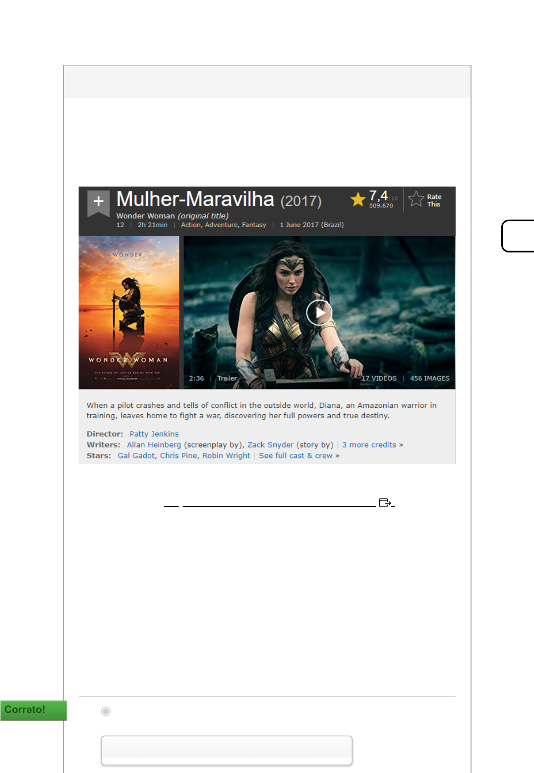 23/12/2022 13:19 Agora é você...: Nivelamento da Língua Inglesa https://famonline.instructure.com/courses/1671/quizzes/10949?module_item_id=45979 1/5 Pontuação desta tentativa: 4 de 4 Enviado 30 de dez de 2020 em 13:55 Esta tentativa levou 5 minutos. 1 / 1 ptsPergunta 1 No texto 2 apresentado nesta aula, percebemos verificar uma variação da sinopse que é a Ficha técnica, conforme verificamos a seguir: Disponível em: https://www.imdb.com/title/tt0451279/ Na ficha técnica, as informações disponibilizadas são sucintas e de leitura rápida. Associe os termos com suas respectivas traduções: 1 .Diretor ( ) Estrelas/Atores 2. Writers ( ) diretor 3. Stars ( ) escritores A sequencia da tradução é: 3-1-2 Correto!Correto! Correta. A sequencia correta da tradução é: 3-1-2 https://www.imdb.com/title/tt0451279/ 23/12/2022 13:19 Agora é você...: Nivelamento da Língua Inglesa https://famonline.instructure.com/courses/1671/quizzes/10949?module_item_id=45979 2/5 2-1-3 2-3-1 1-2-3 3-2-1 1 / 1 ptsPergunta 2 Nas fichas técnicas e nas sinopses é possível perceber o gênero/estilo que faz parte a obra. Veja o texto a seguir: Diponível em: https://www.imdb.com/title/tt0451279/ O filme é considerado como: suspense, terror, aventura suspense, terror, drama comédia, ação, aventura ação, aventura, fantasia Correto!Correto! https://www.imdb.com/title/tt0451279/ 23/12/2022 13:19 Agora é você...: Nivelamento da Língua Inglesa https://famonline.instructure.com/courses/1671/quizzes/10949?module_item_id=45979 3/5 policial, ação, fantasia Correta. No inicio do texto é apresentado as seguintes informações: action, adventure, fantasy. Assim, a alternativa correta é: ação, aventura, fantasia. 1 / 1 ptsPergunta 3 Nas fichas técnicas é possível perceber uma marca atemporal do texto. Mas o que isto quer dizer? Quer dizer que a escrita não possui uma marca do tempo, sendo sempre o presente/neste momento. Veja o texto abaixo: When a pilot crashes and tells of conflict in the outside world, Diana, an Amazonian warrior in training, leaves home to fight a war, discovering her full powers and true destiny. Os verbos crashes/tells/leaves estão no simple present. Os verbos quando estão no simple present, para as formas interrogativas e negativas, necessitam de auxiliar. O auxiliar no simple present é: will did going to do/does Correto!Correto! Correto. A alternativa correta é: do/does Did - é auxliar para verbos no passado Will - é auxiliar para verbos no futuro to - é auxiliar para verbos no infinitivo going to - verbo modal to 23/12/2022 13:19 Agora é você...: Nivelamento da Língua Inglesa https://famonline.instructure.com/courses/1671/quizzes/10949?module_item_id=45979 4/5 1 / 1 ptsPergunta 4 Leia o trecho a seguir: Wonder Woman is a 2017 American superhero film based on the DC Comics character of the same name, produced by DC Entertainment in association with RatPac Entertainment and Chinese company Tencent Pictures, and distributed by Warner Bros. A partir do excerto disponibilizado, qual das afirmações a seguir faz parte do trecho: Mulher Maravilha é um filme americano produzido pelo Warner Bros. Mulher Maravilha é um filme criado peça Warner Bros, e distribuído pela DC Entertainment. Mulher Maravilha é um filme de entretenimento produzido pela DC Entertainment. Mulher Maravilha é um filme de super-herói americano de 2017 baseado no personagem de mesmo nome da DC Comics. Correto!Correto! Correto. A tradução do trecho ficaria desta forma: Wonder Woman é um filme de super-herói americano de 2017 baseado no personagem de mesmo nome da DC Comics, produzido pela DC Entertainment em associação com a RatPac Entertainment e a empresa chinesa Tencent Pictures, e distribuído pela Warner Bros. Mulher Maravilha é um filme americano baseado na personagem de mesmo nome da DC Comics, distribuído pela DC Entertainment. Pontuação do teste: 4 de 4 23/12/2022 13:19 Agora é você...: Nivelamento da Língua Inglesa https://famonline.instructure.com/courses/1671/quizzes/10949?module_item_id=45979 5/5