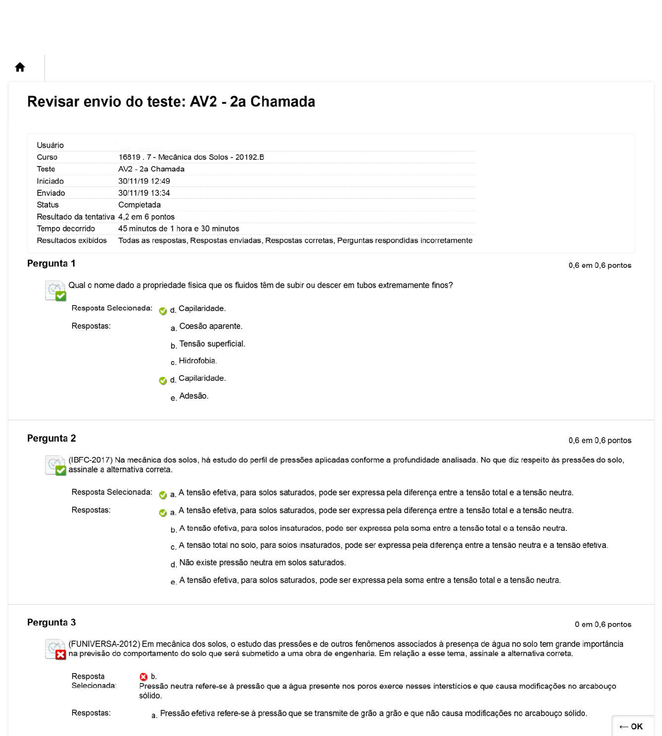 Avaliações Revisar envio do teste: AV2 - 2a Chamada Revisar envio do teste: AV2 - 2a Chamada – 16819 . 7 - ... 1 of 4 10/12/2019 08:10 Revisar envio do teste: AV2 - 2a Chamada Usuário Curso Teste Iniciado Enviado Status Thiago Silva Ferreira 16819 . 7 - Mecânica dos Solos - 20192.B AV2 - 2a Chamada 30/11 /19 12:49 30/11 /19 13:34 Completada Resultado da tentativa 4,2 em 6 pontos Tempo decorrido 45 minutos de 1 hora e 30 minutos Resultados exibidos Todas as respostas, Respostas enviadas, Respostas corretas, Perguntas respondidas incorretamente Pergunta 1 0,6 em 0,6 pontos ~ Qual o nome dado a propriedade flsica que os fluidos têm de subir ou descer em tubos extremamente finos? Resposta Selecionada: e, d. Capilaridade. Respostas: a. Coesão aparente. b. Tensão superficial. c. Hidrofobia. e, d. Capilaridade. e. Adesão. Pergunta 2 0,6 em 0,6 pontos (IBFC-2017) Na mecânica dos solos , há estudo do perfil de pressões aplicadas conforme a profundidade analisada. No que diz respeito ás pressões do solo, assinale a alternativa correta. Resposta Selecionada: e, a. A tensão efetiva, para solos saturados, pode ser expressa pela diferença entre a tensão total e a tensão neutra. Respostas: e, a. A tensão efetiva, para solos saturados, pode ser expressa pela diferença entre a tensão total e a tensão neutra. b. A tensão efetiva, para solos insaturados, pode ser expressa pela soma entre a tensão total e a tensão neutra. c. A tensão total no solo, para solos insaturados, pode ser expressa pela diferença entre a tensão neutra e a tensão efetiva. d. Não existe pressão neutra em solos saturados. e. A tensão efetiva, para solos saturados, pode ser expressa pela soma entre a tensão total e a tensão neutra. Pergunta 3 O em 0,6 pontos (FUNIVERSA-2012) Em mecânica dos solos, o estudo das pressões e de outros fenômenos associados à presença de água no solo tem grande importância _f3 na previsão do comportamento do solo que será submetido a uma obra de engenharia. Em relação a esse tema , assinale a alternativa correta. Resposta Selecionada: Respostas: Q b. Pressão neutra refere-se à pressão que a água presente nos poros exerce nesses interstícios e que causa modificações no arcabouço sólido. a. Pressão efetiva refere-se á pressão que se transmite de grão a grão e que não causa modificações no arcabouço sólido. - oK Revisar envio do teste: AV2 - 2a Chamada – 16819 . 7 - ... https://sereduc.blackboard.com/webapps/assessment/review/review.jsp?attempt_id=_... 2 of 4 10/12/2019 08:10 Pergunta 4 b. Pressão neutra refere-se à pressão que a àgua presente nos poros exerce nesses interstícios e que causa modificações no arcabouço sólido. & c. O fenômeno da areia movediça acontece quando a pressão efetiva anula-se, ocasionando a perda total da resistência da areia ao cisalhamento. Sendo assim, as forças de percolação da água no interior do solo ultrapassam as forças de sustentação do solo devido ao seu peso próprio. d. O processo de pipping é dependente das forças de percolação que são indiretamente proporcionais ao gradiente hidráulico. e. Na superfície freática, a pressão neutra Iguala-se à pressão efetiva, mas é o dobro da pressão atmosférica. 0,6 em 0,6 pontos De acordo com a classificação unificada dos solos (SUCS), assinale a alternativa correspondente a um solo do tipo fino. Resposta Selecionada: Solo fino: têm uma porcentagem maior ou igual a 50% de partículas que passam na peneira #200, ou seja, siltes e argilas. e. Respostas: a. Solo fino: apresenta mais de 90% de partículas retidas na peneira #200. b. Solo fino: têm uma porcentagem igual a 10% de partículas que passam na peneira #200, ou seja, siltes e argilas. Solo fino: têm uma porcentagem maior ou igual a 50% de partículas que passam na peneira #200, ou seja, siltes e argilas. & c. d. Solo fino: apresenta cerca de 85% de partículas retidas na peneira #200. e. Solo fino: não têm como caracterlstica a presença de siltes e argilas. Pergunta 5 0,6 em 0,6 pontos Assinale a alternativa correspondente ao nome do • Pai da mecânica dos solos", em referência ao compilador e fundador dos principais conceitos aplicados no ramo da mecânica dos solos. Resposta Selecionada: & b. Karl Terzaghi. Respostas: a. Peter Atkins. ~ b. Karl Terzaghi. c. Almir Cirilo. d. David Halliday. e. James Stewart. Pergunta 6 0,6 em 0,6 pontos Do ponto de vista da formação (gênese) dos solos, os solos podem ter possíveis classificações. Assinale a alternativa correspondente ao tipo de solo que em ~ algum momento foi erodido, transportado e depositado em locais afastados da sua rocha de origem. Resposta Selecionada: Respostas: Solo transportado. a. Solo aluvionar. Solo transportado. e. Solo argiloso. d. Solo mineral. Revisar envio do teste: AV2 - 2a Chamada – 16819 . 7 - ... https://sereduc.blackboard.com/webapps/assessment/review/review.jsp?attempt_id=_... 3 of 4 10/12/2019 08:10 e. Solo residual. Pergunta 7 0,6 em 0,6 pontos Quais ensaios deve-se realizar para determinar os índices de consistência de um solo? Assinale a alternativa correta . Resposta Selecionada: ~ c. Limite de liquidez e Limite de plasticidade. Respostas: a. Limite de liquidez e Granulometria. b. Coesão e Adesão. ~ c. Limite de liquidez e Limite de plasticidade. Curva granulométrica e Tensão superficial. d. e. Capilaridade e Ponto de Fulgor. Pergunta 8 O em 0,6 pontos (FGV -2018) O Ensaio de Penetração Dinâmica ou Standard Penetration Test (SPT) realizado durante a sondagem á percussão de simples reconhecimento é _f3 um dos ensaios mais utilizados no Brasil para a exploração do subsolo. Este ensaio consiste em: Resposta Selecionada: Respostas: Pergunta 9 º ª· Retirar uma amostra indeformada do solo, com tubo bi-partido, e realizar a cravação de um cone nesta amostra, onde são medidos os deslocamentos que são re lacionados a um lndice de resistência. a. Retirar uma amostra indeformad