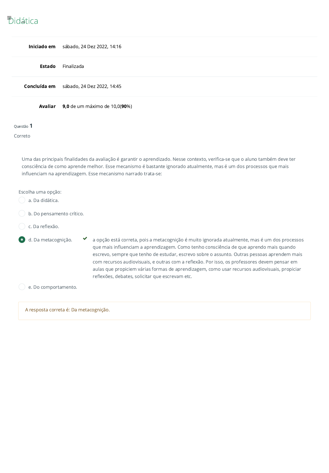 Didática Iniciado em sábado, 24 Dez 2022, 14:16 Estado Finalizada Concluída em sábado, 24 Dez 2022, 14:45 Avaliar 9,0 de um máximo de 10,0(90%) Questão 1 Correto Uma das principais �nalidades da avaliação é garantir o aprendizado. Nesse contexto, veri�ca-se que o aluno também deve ter consciência de como aprende melhor. Esse mecanismo é bastante ignorado atualmente, mas é um dos processos que mais in�uenciam na aprendizagem. Esse mecanismo narrado trata-se: Escolha uma opção: a. Da didática. b. Do pensamento crítico. c. Da re�exão. d. Da metacognição. a opção está correta, pois a metacognição é muito ignorada atualmente, mas é um dos processos que mais in�uenciam a aprendizagem. Como tenho consciência de que aprendo mais quando escrevo, sempre que tenho de estudar, escrevo sobre o assunto. Outras pessoas aprendem mais com recursos audiovisuais, e outras com a re�exão. Por isso, os professores devem pensar em aulas que propiciem várias formas de aprendizagem, como usar recursos audiovisuais, propiciar re�exões, debates, solicitar que escrevam etc. e. Do comportamento. A resposta correta é: Da metacognição. https://aula.fael.edu.br/ Questão 2 Correto Questão 3 Correto Na escola, o projeto objetiva o desenvolvimento de um conhecimento desejado, a formação de competências e habilidades ou, mesmo, a correção de encaminhamentos pedagógicos. Sobre a temática de projetos, leia as a�rmativas: I- Qualquer projeto precisa ter um objetivo. II- São fases dos projetos a iniciação e o planejamento apenas. III- Para iniciar um projeto, é importante que identi�car um foco importante. Estão corretas: Escolha uma opção: a. II e III. b. III. c. I. d. I e III. a opção está correta, pois somente as opções I e III estão corretas. No caso da primeira a�rmativa, qualquer projeto precisa ter um objetivo, ações previstas e períodos estabelecidos para atingir determinada meta. A segunda a�rmativa está incorreta, pois as fases dos projetos são inicialização, planejamento, execução, controle e encerramento. A terceira a�rmativa está correta, pois é preciso ter foco no processo. e. I, II e III. A resposta correta é: I e III. Na escola existem vários níveis de planejamento. São eles: planejamento educacional, planejamento escolar, planejamento curricular e planejamento de ensino. É correto a�rmar que um plano de aula está alicerçado pela legislação vigente. A sequência correta que orienta os planejamentos são: Escolha uma opção: a. LDB, BNCC, diretrizes regionais e plano educacional. a opção está correta, pois o planejamento educacional é o re�exo das políticas nacionais, sendo por meio da legislação que estão dispostos: LDB, BNCC, diretrizes regionais e plano educacional. b. Plano de curso, PPP e plano de aula. c. LDB, currículo e PCNs. d. Não existem sequências. e. BNCC, diretrizes, PCNs e LDB. A resposta correta é: LDB, BNCC, diretrizes regionais e plano educacional. https://aula.fael.edu.br/ Questão 4 Correto Questão 5 Correto A palavra avaliação, quando mencionada, é normalmente relacionada à palavra prova, que não traz nenhum conforto para os alunos. Desse modo, as avaliações são consideradas um prêmio ou uma punição. Essa é uma forma de adestramento, e a avaliação nos dias atuais não é vista dessa maneira. Essa forma tradicional, tão usada até os dias de hoje, foi amplamente defendida por: Escolha uma opção: a. Paulo Freire. b. Burrhus Frederic Skinner. a opção está correta, pois Skinner defendeu a educação com base na concepção comportamentalista, como é realizado com os animais. As crianças devem receber recompensas ou punições. A sensação é de que as provas são recompensas para quem atinge boas notas, e punições para quem não atinge as notas mínimas que demonstrem o aproveitamento. c. Lev Vygotsky. d. David Ausubel. e. Jean Piaget. A resposta correta é: Burrhus Frederic Skinner. A apresentação dos conteúdos deve conter inter-relação entre as sequências, de forma orgânica e dinâmica. Além disso, é preciso distinguir os conteúdos essenciais dos desnecessários e de�nir o necessário para preparar su�cientemente o aluno para ler, escrever, interpretar e resolver problemas. (Disponível em: https://educador.brasilescola.uol.com.br/trabalho-docente/conteudos- escolares.htm. Acesso em: 22 set. 2020.) Se houver uma forma disciplinar de organizar os conteúdos, é preciso observar: Escolha uma opção: a. Os conteúdos fundamentais e desnecessários para o desenvolvimento do conhecimento. b. A dinâmica da escola, o PPP e as exigências culturais. c. A relevância, a inter- relação com os demais conteúdos, o grau de complexidade ligada à idade do aluno e a sequência lógica. a opção está correta, pois a organização dos conteúdos se dará por relevância e, depois, será distribuída por séries, ciclos ou módulos, de acordo com cada escola, para que a aprendizagem seja mais simpli�cada. É preciso levar em conta a inter-relação entre os conteúdos, o grau de complexidade para o aluno, sua idade e os pré-requisitos que ele necessita para aprender e o tempo disponível em sala de aula para atingir seus objetivos. d. Todas as demais disciplinas e sua interdependência com a que trabalhamos. e. Apenas uma sequência lógica organizada para atingir os objetivos gerais do PPP. A resposta correta é: A relevância, a inter-relação com os demais conteúdos, o grau de complexidade ligada à idade do aluno e a sequência lógica. https://educador.brasilescola.uol.com.br/trabalho-docente/conteudos-escolares.htm https://aula.fael.edu.br/ Questão 6 Correto Questão 7 Correto “[…] O julgamento de valor, por sua constituição mesma, desemboca num posicionamento da não indiferença, o que signi�ca obrigatoriamente uma tomada de posição sobre o objeto avaliado e uma tomada de decisão quando se trata de um processo, como é o caso