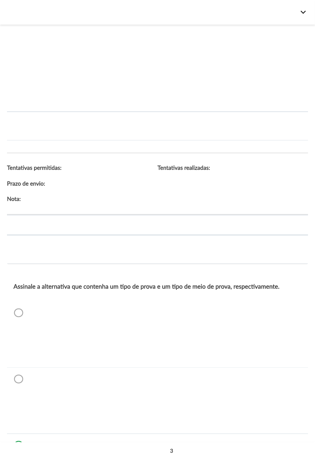 Exercícios O prazo para envio das respostas está encerrado. Prazo para envio: 31/10/22 23:59 Liberação do feedback: 01/11/22 00:00 Tenta�vas permi�das: 3 Tenta�vas realizadas: 1 Prazo de envio: 31/10/2022 Nota: Será considerada a tenta�va com mais acertos. Tentativa Acertos Nota Data de envio Tentativa 1 2/5 40% 31/10/2022 3. Assinale a alterna�va que contenha um �po de prova e um �po de meio de prova, respec�vamente. A. Adimplemento e quitação de um determinado valor. Provar o adimplemento é prova, e o meio de provar esse adimplemento poderá se documental, sendo, portanto, o documento o meio de prova. B. Adimplemento e boletos nunca recebidos para quitação. Provar o adimplemento é prova, e o meio de provar esse adimplemento poderá se documental, sendo, portanto, o documento o meio de prova. C. Adimplemento e documental. 3 de 5 perguntas Anterior Próximo GC Provar o adimplemento é prova, e o meio de provar esse adimplemento poderá se documental, sendo, portanto, o documento o meio de prova. D. Documental e documentos. Provar o adimplemento é prova, e o meio de provar esse adimplemento poderá se documental, sendo, portanto, o documento o meio de prova. E. Documental e testemunhal. Provar o adimplemento é prova, e o meio de provar esse adimplemento poderá se documental, sendo, portanto, o documento o meio de prova. Voltar Próximo 3 de 5 perguntas Anterior Próximo GC