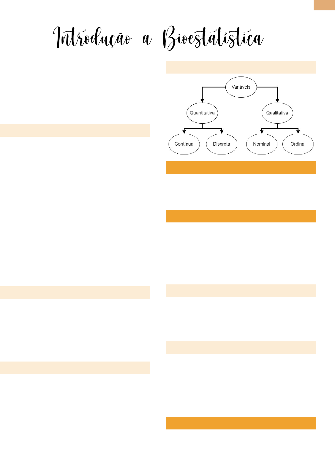 1 João Victor de Paula Freitas – S7 METODOLOGIA Estatística aplicada aos estudos dos fenômenos biológicos Estatística- ciências da saúde. Em ciências biológicas SUBJETIVIDADE (viés de observação). FUNDAMENTOS BÁSICOS → Observações LIMITADAS + Variabilidade da distribuição de eventos = Possibilidade de acontecimentos de um evento. → População(N): conjunto de todos os elementos ou resultados sob investigação. → Amostra (n): parte (SUBCONJUNTO) da população. → Confiança: valor numérico (%) que restringe a possibilidade do erro. (exemplo: 95%, existe 95% de confiança que esse intervalo inclua a média da população); → VALOR DE “P”: valor algébrico que define o ponto de corte entre a hipótese nula e alternativa: • Ex: 0.05 (confiança de 95%): p<0.05. ANÁLISE ESTATÍSTICA → TAMANHO DA AMOSTRA: representatividade a uma população. → HOMOGENEIDADE DA AMOSTRA: diminuir a dispersão. → Revisão de literatura. → Cálculo amostral. CONCEITOS BÁSICOS 1. Aferição: descrição de fenômenos que podem ser analisados estatisticamente. 2. O que vou medir? depende (objetivo e hipóteses do estudo). 3. A mensuração é realizada e definida pela revisão de literatura (METODOLOGIA JÁ DEFINIDA). Se não definida tenho que definir os meus critérios e validá-los. TIPOS DE VARIÁVEL QUALITATIVO - NOMINAL → Dados nos quais os valores são categorias ou classes sem uma ordem definida. → SEXO, PRESENÇA OU AUSÊNCIA, RAÇA. QUALITATIVO – ORDINAL → Dados nos quais a ordem entre as categorias se torna importante, entretanto a magnitude dos números não tem significado. → Traumatismo craniano: fatal=1, severo=2, moderado=3, leve=4; → Escolaridade, classe social. QUANTITATIVO – DISCRETO → São restritos a valores específicos (normalmente números inteiros); → Numero de partos, numero de acidentes de trânsito em um determinado ano; QUANTITATIVO – CONTÍNUO → Dados que representam quantidades mensuráveis, mas não restritas a valores específicos. → Valores fracionados são aceitos. → Volume de sangue, por exemplo. → Altura. MEDIDAS DE TENDÊNCIA CENTRAL → Média. → Moda. → Medidas de precisão ou medidas de tendência central; 2 João Victor de Paula Freitas – S7 METODOLOGIA → Refletem declarações quantitativas concisas que caracteriza, a distribuição de valores a uma amostra; → Mediana: medida de tendencia central que divide a amostra exatamente em duas metades, de forma que metade da amostra terá valores superiores e metade inferiores a mediana. MEDIDAS DE DISPERSÃO → Desvio-padrão; → Medida de dispersão dos valores de uma variável em torno da sua média. → Quanto < o desvio padrão, MENOR A FUGA MÉDIA E MAIS REPRESENTATIVA SERÁ NOSSA AMOSTRA. → Dados quantitativos (média, desvio padrão, erro padrão); → Escores (pontuação): dados semi- quantitativos; → Amplitude: distribuição entre os valores mínimos e máximos dentro dos intervalos de confiança. OUTROS PONTOS A SE CONSIDERAR • Testes estatísticos. • Natureza da variável (qualitativa ou quantitativa); • DISTRIBUIÇÃO DA VARIÁVEL: normal (testes paramétricos), se desconhecida ou não normal (testes não paramétricos); • Número de grupos incluídos no estudo; • Dependência ou independência das amostras.