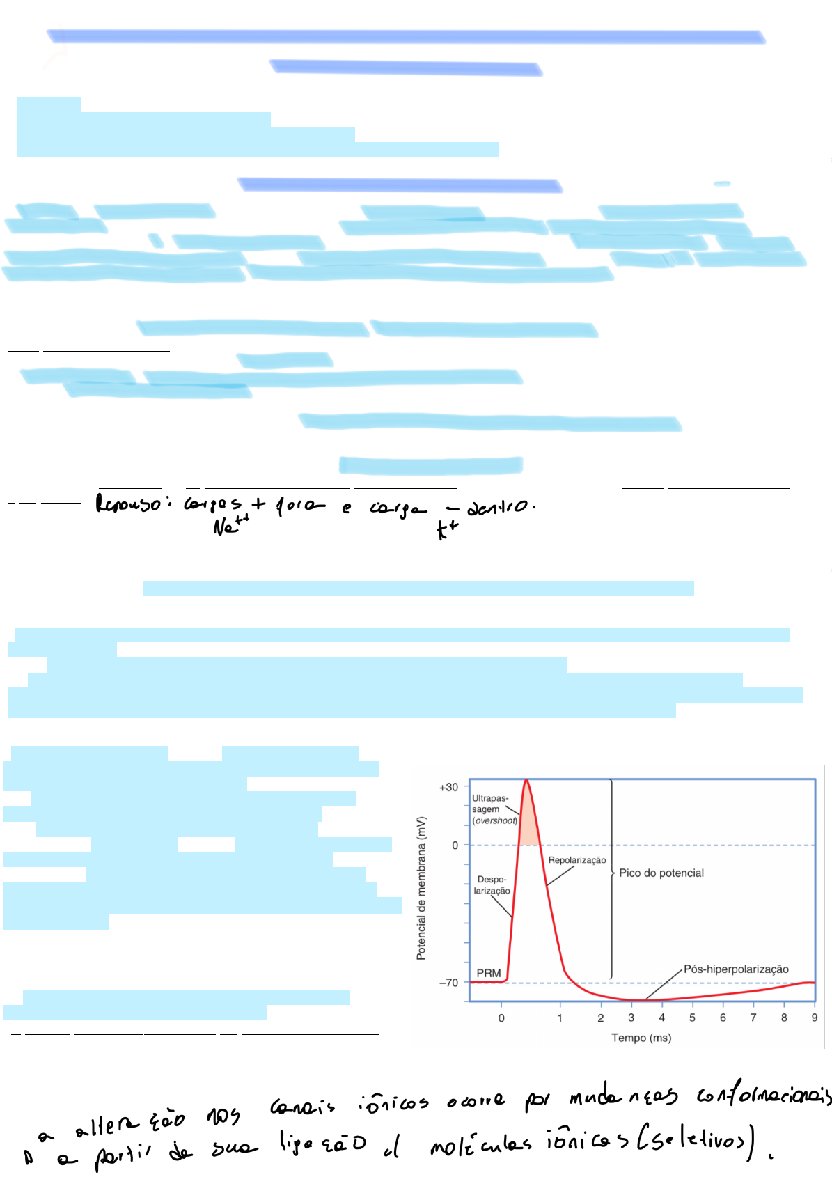 PROBLEMA 3: O SISTEMA NERVOSO PERCEBE, AGE E DEPOIS FUNCIONA Objetivos: 1) Compreender a fisiologia do neurônio; 2) Elucidar as vias de sensibilidade e nocioreceptores; 3) Entender a transdução sensorial e mecanismo de mensageiro secundário. Compreender a fisiologia do neurônio O neuronio é a unidade funcional do sistema nervoso e os circuitos neuronais sao formados por neuromios conectados sinapticamente. A atividade neuronal é realizada por sequencias de potenciais de acao propagados ao longo dos axonios nos circuitos neuronais -> a informacao é transportada de um neuronio para outro por meio da transmissao sinaptica: potencial de acao chega à terminacao pré-sinaptica e gera a liberacao de neurotransmissor quimico, que pode excitar a celula pós-sinaptica a descarregar mais potenciais de acao, a inibir, ou influenciar acao de outras terminacoes axonicas. GERAÇÃO E CONDUÇÃO DOS POTENCIAIS DE AÇÃO Potencial de acao é a alteracao do potencial de membrana, de acordo com a lei do tudo-ou-nada, seguido do retorno ao potencial de repouso da membrana. - A base dos potenciais de acao sao os canais ionicos, controlados por voltagem, na membrana plasmatica. - O potencial de acao é propagado com mesma forma e amplitude por todo o axonio. - Eles sao iniciados no segmento inicial do axonio. - O potencial é a base da capacidade de transportar sinais das celulas nervosas. - Os padroes dos potenciais de acao conduzidos traduzem a informacao transmitida pelas celulas nervosas. POTENCIAIS DE MEMBRANA Todas as celulas, mesmo os neuronios, possuem um potencial de repouso -> -70mV aproximadamente. Uma das caracteristicas principais dos neuronios é a capacidade de alterar seu potencial de acao de maneira muito rapida, em resposta a um estimulo apropriado. Resposta Passiva - Pulsos retangulares de despolarizacao ou hiperpolarizacao; -> -70mV para -60mV: houve incremento de carga positiva -> despolarizacao; -> -70mV para -80mV: incremento de carga negativa -> hiperpolarizacao; - Pulsos retangulares nao alteram a resistencia da membrana, nao interferindo na abertura de canais ionicos. Resposta local (subliminar) - Corrente maior aplicada -> muda potencial -> abre canais de sodio sensiveis a voltagem -> altera resistencia da membrana -> entra sodio (Na+); - Essa entrada de cargas positivas aumenta a despolarizacao -> resposta local/subliminar; - A resposta local ocorre por conta de variacoes nas propriedades da membrana (principalmente resistencia), o que a diferencia da resposta passiva. Apesar disso, ela nao é autorregenartiva e nem se propaga pelo axonio -> sua amplitude diminui com a distancia. A variacao das propriedades da membrana nao é suficiente para geraro potencial de acao. Resposta supraliminar: o potencial de acao - Respostas locais maiores causam correntes maiores de despolarizacao ate que o potencial de membrana limiar seja atingido, o que gera o potencial de acao; -> A polaridade do potencial de membrana é invertida: o interior passa a ser positivo em relacao ao exterior; -> Se propaga por toda a extensao da fibra nervosa; -> Se propaga sem alteracao, ou seja, mantem sua amplitude e sua forma conforme é regenerado ao longo do axonio; - Além disso, quando há um estímulo maior que o limiar, o potencial de acao nao se altera, ou seja, nao aumenta com a intensidade maior do estimulo. Por isso, ele é descrito com a lei do tudo-ou-nada, pois um estimulo produz um potencial de acao, ou nao; - Potenciais de ação podem ser gerados em outras partes da membrana da célula nervosa, mas sua principal função é a condução do sinal ao longo do axônio; - O pico do potencial de acao é cerca de +50mV, entao, o potencial retorna ao seu valor de repouso; - Apos a repolarizacao, ocorre a hiperpolarizacao variavel -> pós-hiperpolarizacao; - A despolarização do potencial de ação dura de 1 a 2 ms, mas a hiperpolarização pode persistir de alguns milissegundos até 100 ms em algumas células. Type your text Type your text Base iônica dos potenciais de ação - O potencial de acao resulta de alteracoes na conducao da membrana plasmatica de ions de socio e potassio; -> O aumento de potassio iria hiperpolariar a membrana (incremento de carga negativa) e a reducao de potassia tende a despolarizar a membrana (diminuicao de carga negativa); -> O aumento de sódio -> despolarizacao (aumenta carga positiva) e, se aumentar muito, causa a inversao de polaridade da membrana; - O potencial de acao comeca com aumento da conducao do Na+ por conta da abertura dos canais de Na+ em resposta à despolarizacao. Os canais de sodio permitem a entrada de ions de Na+, o que despolariza ainda mais a membrana -> feedback positivo; - A fase de diminuicao do potencial de acao acontece como consequencia de 2 processos: reducao de sodio e aumento de potassio; -> A reducao de sodio ocorre por conta da repolarizacao de membrana, devido a dependencia da voltagem do canal de Na+. Isso ocorre pois os canais de sodio possuem uma comporta de inativacao, em que a chance de fechamento aumenta conforme a membrana é despolarizada. Período Refratário - Durante a maior parte do potencial de ação, a célula fica totalmente refratária a novos estímulos; - Quando a célula está refratária, ela é incapaz de gerar um segundo potencial de ação, independente da intensidade do estímulo; - Esse estado de ausencia de resposta é chamado período refratário absoluto. A célula fica refratária pois grande parte de seus canais de sódio está inativada pela voltagem, nao podendo ser reaberta até que a membraan se repolarize. Nesse estado, não se pode recrutar o número crítico de canais de Na+ necessário para produzir o potencial de ação; - No período final do potencial de acao, a celula é capaz de gerar outro potencial de acao, mas isso requer um estimulo mais forte que o normal. Esse período é chamado de período refratário relativo; -> Na fase inicial, antes que o potencial de membrana tenha retornado ao