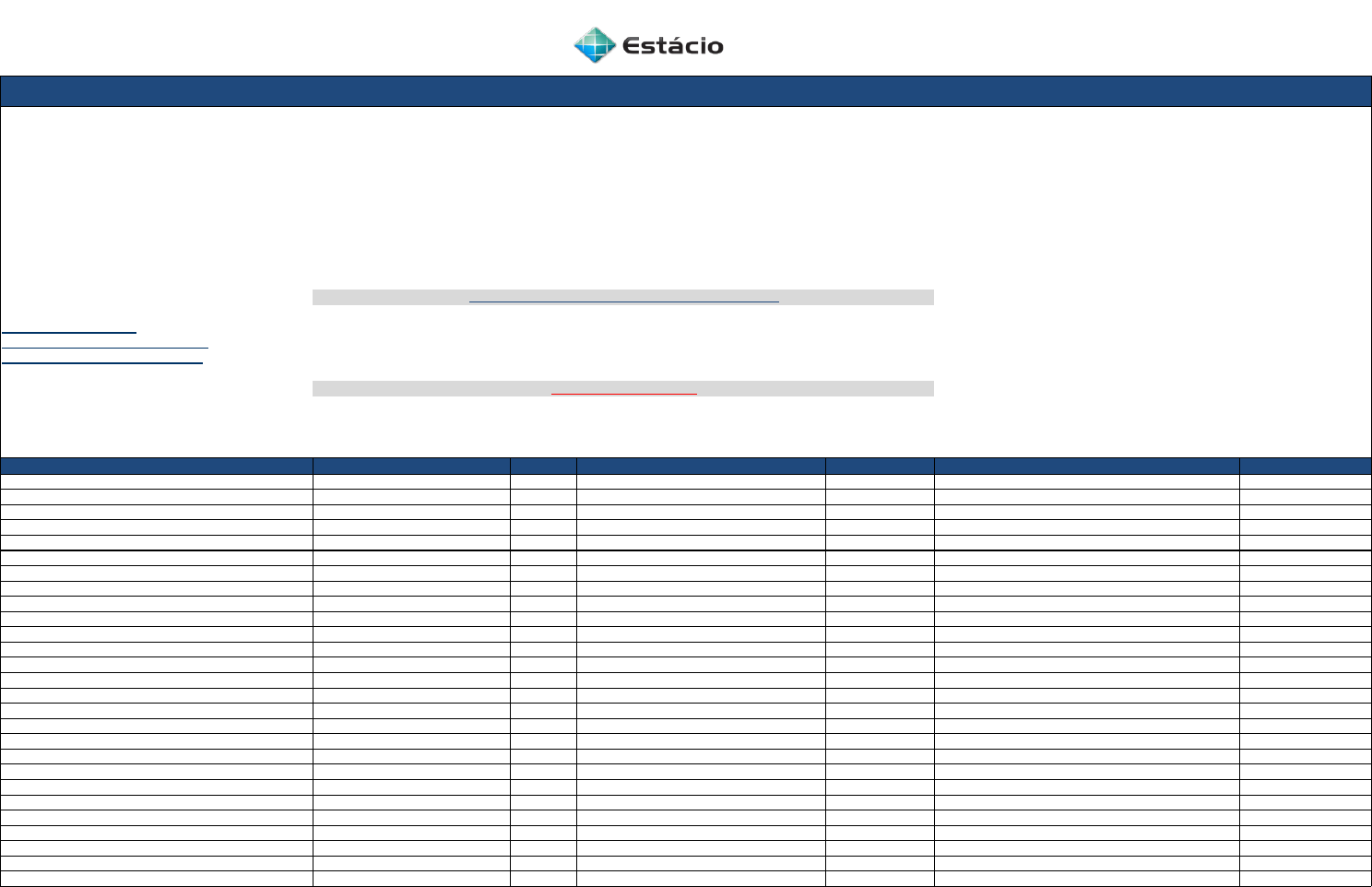 INSTITUICAO CAMPUS COD CURSO MATRICULA ALUNO HORAS OBTIDAS CENTRO UNIVERSITÁRIO ESTÁCIO DA BAHIA GILBERTO GIL 35 SISTEMAS DE INFORMAÇÃO 200602279235 ABEL CASTRO PEREIRA 5 UNIVERSIDADE ESTÁCIO DE SÁ EAD MADUREIRA RJ 4366 GESTÃO FINANCEIRA 201101454954 ABEL JESUS DE SOUZA FERREIRA JUNIOR 0 UNIVERSIDADE ESTÁCIO DE SÁ RECREIO 1 DIREITO 200801303748 ABILIO PAULO FIGUEIREDO LOPES 281 UNIVERSIDADE ESTÁCIO DE SÁ CENTRO I - PRESIDENTE VARGAS 4346 GESTÃO DE SEGURANÇA PRIVADA 201101402857 ABIR SEGURANÇA E VIGILÂNCIA./ LUCIO DO ESPIRITO SANTO 87 UNIVERSIDADE ESTÁCIO DE SÁ NITERÓI 2 ADMINISTRAÇÃO 200201300543 ABISAEL LEITE DE LUCENA 204 UNIVERSIDADE ESTÁCIO DE SÁ EAD FORTALEZA - ALDEOTA CE 4334 GESTÃO DA TECNOLOGIA DA INFORMAÇÃO 201007041791 ABNER SIQUEIRA TORRES 1680 FACULDADE ESTACIO DE SERGIPE SERGIPE 4054 REDES DE COMPUTADORES 201007002476 ABRAÃO SILVA DE LIMA 44 FACULDADE ESTACIO DE SERGIPE SERGIPE 166 ENFERMAGEM 200901435794 ACÁCIA DA COSTA ALMEIDA 171 UNIVERSIDADE ESTÁCIO DE SÁ CAMPOS DOS GOYTACAZES 372 ENGENHARIA CIVIL 200802172116 ACHYLLES MESQUITA VIANA 190 UNIVERSIDADE ESTÁCIO DE SÁ NOVA AMÉRICA 4339 LOGÍSTICA 200907044797 ACIDIA DO CARMO PITANGA MASSENA 26 CENTRO UNIVERSITÁRIO ESTACIO RADIAL DE SÃO PAULO JABAQUARA 2 ADMINISTRAÇÃO 200801358399 ADAGNOLIA BONFIM DE SOUZA 255 CENTRO UNIVERSITÁRIO ESTACIO RADIAL DE SÃO PAULO JABAQUARA 22 CIÊNCIAS CONTÁBEIS 200901170863 ADAILSON ROCHA DE CARVALHO 255 FACULDADE ESTÁCIO DE SÁ DE OURINHOS OURINHOS 166 ENFERMAGEM 200902193379 ADAILTON MARCELINO DE FREITAS 246 FACULDADE ESTÁCIO DE SÁ DE GOIÁS GOIÁS 30 EDUCAÇÃO FÍSICA 200901359257 ADAIR GOMES DE SOUZA 0 FACULDADE ESTÁCIO DE SÁ DE BELO HORIZONTE PRADO 30 EDUCAÇÃO FÍSICA 200802269276 ADALBERTO BORGES 27 CENTRO UNIVERSITÁRIO ESTACIO RADIAL DE SÃO PAULO JABAQUARA 4340 ANÁLISE E DESENVOLVIMENTO DE SISTEMAS 201001356421 ADALBERTO FERNANDES DA SILVA 20 UNIVERSIDADE ESTÁCIO DE SÁ SÃO GONÇALO 4339 LOGÍSTICA 201001340434 ADALBERTO FLIESS AREZES 28 CENTRO UNIVERSITÁRIO ESTACIO RADIAL DE SÃO PAULO VILA DOS REMÉDIOS 774 ENGENHARIA AMBIENTAL E SANITÁRIA 201001129156 ADALBERTO PEREIRA DE JESUS 77 CENTRO UNIVERSITÁRIO ESTACIO RADIAL DE SÃO PAULO SANTO AMARO 4070 GESTÃO DE RECURSOS HUMANOS 201007081031 ADALBERTO RODRIGUES DE LIMA 12 CENTRO UNIVERSITÁRIO ESTÁCIO DA BAHIA GILBERTO GIL 166 ENFERMAGEM 200901403019 ADALMIR RIBEIRO DE CARVALHO 271 UNIVERSIDADE ESTÁCIO DE SÁ EAD NOVA AMÉRICA RJ 4070 GESTÃO DE RECURSOS HUMANOS 201007080647 ADALTO PEREIRA RIGOR 10 UNIVERSIDADE ESTÁCIO DE SÁ PETRÓPOLIS 35 SISTEMAS DE INFORMAÇÃO 200501019556 ADAM HENRIQUE QUEIROZ CARIUS 199 FACULDADE ESTÁCIO DO RECIFE RECIFE 29 FISIOTERAPIA 200802258819 ÁDAMO LUCENA BRANDT 360 FACULDADE ESTÁCIO DO RECIFE RECIFE 1 DIREITO 200801435695 ADAUCTO RAFAEL MOTTA PEREIRA DE MELLO 7 FACULDADE ESTÁCIO DO RIO GRANDE DO NORTE FATERN 2 ADMINISTRAÇÃO 200901598596 ADEAN IURI DANTAS 0 UNIVERSIDADE ESTÁCIO DE SÁ MACAÉ 2 ADMINISTRAÇÃO 200602174794 ADECIR FREIRE DE SOUZA 320 CENTRO UNIVERSITÁRIO ESTÁCIO DA BAHIA GILBERTO GIL 4339 LOGÍSTICA 201001218078 ADEILSON CAVALCANTE SOUSA 10 TER REALIZADO ESTÁGIO, TCC, MONOGRAFIA,ESAG,OFICINA DE LEITURA, DE ACORDO COM O CURSO/CURRÍCULO, ESTA LISTAGEM NÃO SERÁ ATUALIZADA, SERVE PARA INFORMAR QUANTO AS HORAS AAC PENDENTES, FALTA NO ENADE E DOCUMENTAÇÃO NECESSÁRIA PARA COLAÇÃO DE GRAU. O ENADE É UM COMPONENTE CURRICULAR OBRIGATÓRIO, PORTANTO, OS ALUNOS QUE FALTAREM AO ENADE, SÓ PODERÃO COLAR GRAU APÓS SUA REGULARIZAÇÃO. INGRESSO POR MSV (Portador de Diploma): CÓPIA (CERTIDÃO DE NASCIMENTO OU CASAMENTO / IDENTIDADE / DIPLOMA DE NÍVEL SUPERIOR REGISTRADO (FRENTE E VERSO) /HISTÓRICO DO CURSO NÍVEL SUPERIOR INGRESSO POR TRANSFERÊNCIA EXTERNA: CÓPIA (CERTIDÃO DE NASCIMENTO OU CASAMENTO / IDENTIDADE /CERTIFICADO DO ENSINO MÉDIO (FRENTE E VERSO) / HISTÓRICO DA INSTITUIÇÃO DE ORIGEM) ATENÇÃO FALTOSO ENADE LISTAGEM PROVÁVEIS FORMANDOS 2012.2 NÃO POSSUIR PENDÊNCIA NA DOCUMENTAÇÃO ACADÊMICA EXIGIDA. O PRAZO PARA REGULARIZAÇÃO ACADÊMICA SERÁ ATÉ O FINAL DESTE SEMESTRE LETIVO. DOCUMENTAÇÃO NECESSÁRIA PARA COLAÇÃO DE GRAU: INGRESSO POR VESTIBULAR: CÓPIA (CERTIDÃO DE NASCIMENTO OU CASAMENTO / IDENTIDADE / CERTIFICADO DO ENSINO MÉDIO (FRENTE E VERSO) SE VOCÊ É UM POSSÍVEL CONCLUINTE DO PERÍODO ACADÊMICO 2012.2 E SEU NOME NÃO CONSTA NESTA LISTAGEM, DEVERÁ INFORMAR A SECRETARIA DO SEU CAMPUS. ESTAMOS INFORMANDO A QUANTIDADE DE HORAS DE ATIVIDADES COMPLEMENTARES REALIZADAS ATÉ O MOMENTO, PORTANTO, VERIFIQUE A QUANTIDADE DE HORAS NECESSÁRIAS DE ACORDO COM SEU CURSO/CURRÍCULO, CASO AINDA TENHA HORAS A CUMPRIR, DEVERÁ PROVIDENCIAR A REGULARIZAÇÃO. SOMENTE PODERÁ PARTICIPAR DA SOLENIDADE OFICIAL E COLAR GRAU OS ALUNOS QUE TIVEREM CUMPRIDO TODAS AS EXIGÊNCIAS ACADÊMICAS: TER CUMPRIDO COM APROVAÇÃO TODAS AS DISCIPLINAS DO SEU CURSO/CURRÍCULO, TER REALIZADO O MÍNIMO NECESSÁRIO DE HORAS PTP/AAC, ESTAR EM SITUAÇÃO REGULAR JUNTO AO ENADE, UNIVERSIDADE ESTÁCIO DE SÁ CENTRO I - PRESIDENTE VARGAS 4344 PETRÓLEO E GÁS 200901340599 ADEILTON BARCELLOS MONÇÃO 54 CENTRO UNIVERSITÁRIO ESTÁCIO DA BAHIA GILBERTO GIL 4 COMUNICAÇÃO SOCIAL 201101480701 ADELAIDE DA COSTA OLIVEIRA 0 UNIVERSIDADE ESTÁCIO DE SÁ SULACAP 4346 GESTÃO DE SEGURANÇA PRIVADA 201101330821 ADELAIDO GONÇALVES DE OLIVEIRA 70 UNIVERSIDADE ESTÁCIO DE SÁ CAMPOS DOS GOYTACAZES 21 PSICOLOGIA 200701019622 ADELANI GONCALVES LOPES 135 UNIVERSIDADE ESTÁCIO DE SÁ EAD PRESIDENTE VARGAS RJ 4334 GESTÃO DA TECNOLOGIA DA INFORMAÇÃO 201004005016 ADELIA ALMEIDA SCHMIDT 100 CENTRO UNIVERSITÁRIO ESTÁCIO DA BAHIA GILBERTO GIL 166 ENFERMAGEM 200802276264 ADELIA ALVES FIGUEIREDO SANTOS 11 CENTRO UNIVERSITÁRIO ESTÁCIO DO CEARÁ MOREIRA CAMPOS 4070 GESTÃO DE RECURSOS HUMANOS 201007031506 ADELIANA DA COSTA BRITO 30 UNIVERSIDADE ESTÁCIO DE SÁ REBOUÇAS 4 COMUNICAÇÃO SOCIAL 200301792804 ADELINA VERAS DA COSTA 44 UNIVERSIDADE ESTÁCIO 