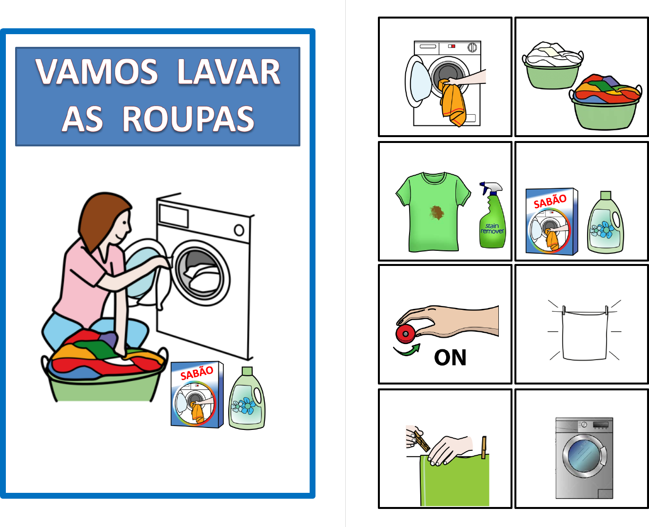 MATERIAIS ADAPTADOS FABI tirada. sabão e amaciante. ligar a lavadora. limpas. lavar as roupas. separadas. secadora. pendurá-las no varal. AMACIANTE O cesto de roupas sujas está cheio. Temos que Roupas claras, coloridas e escuras devem ser lavadas, Se uma roupa estiver manchada, a mancha deve ser temos que colocar Antes de lavar as roupas, Depois de colocar sabão, é hora de Quando a lavadora desligar, as roupas estão Depois de tirar as roupas da lavadora, temos que Ou colocá-las na Número do slide 1 Número do slide 2 Número do slide 3 Número do slide 4 Número do slide 5 Número do slide 6