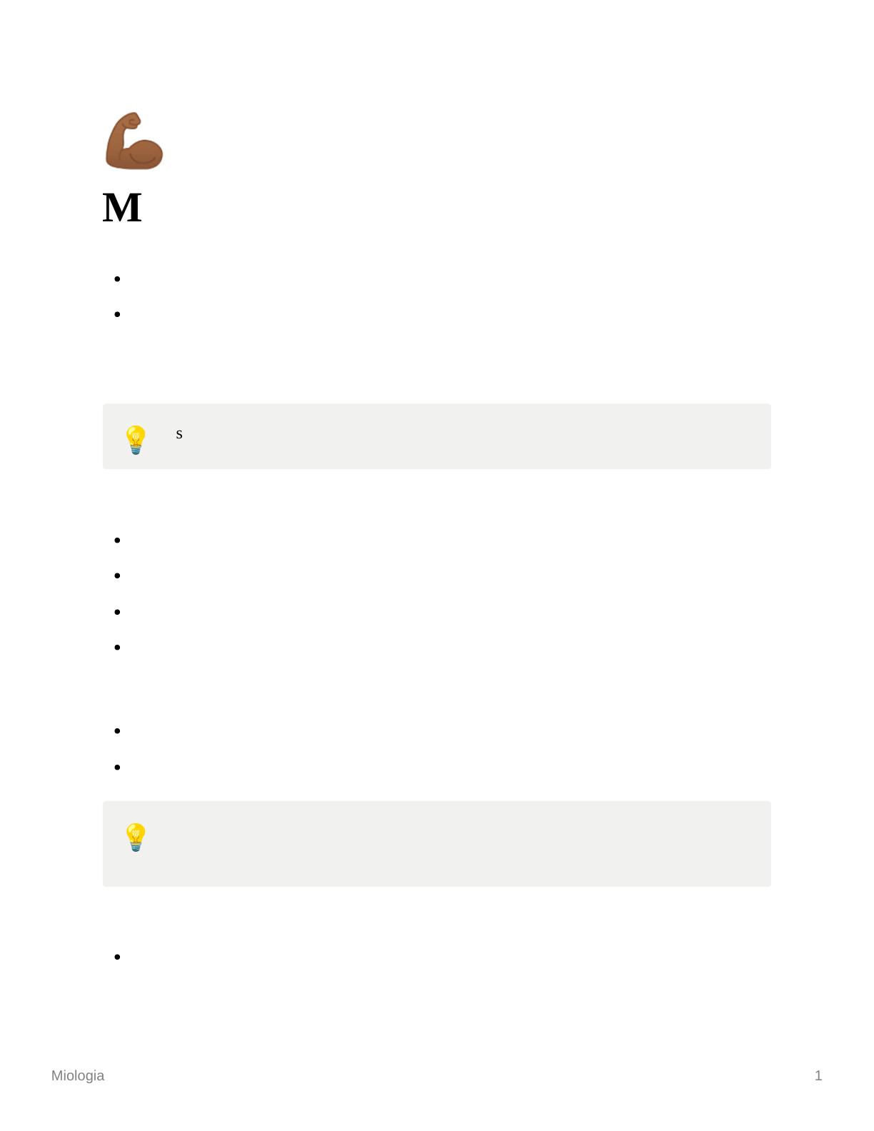 Miologia 1 � Miologia Estudo dos músculos Os músculos possuem a capacidade básica de contratilidade Tipos de músculos 💡 Os nomes são dados devido a histologia e a morfologia das células 1.Liso Vísceras: estômago, intestino, esôfago, útero Movimento mais lento Não é possível controlar voluntariamente essa musculatura Movimentos involuntários, controlados pelo sistema nervoso 2.Estriado cardíaco Encontrado no coração Apesar de ser estriado não é possível ter o controle voluntário desse músculo 💡 Os batimentos são controlados pelo próprio coração, por meio do nódulo sinoatrial, mas podem ser influenciados pelo sistema nervoso 3.Estriado esquelético Podem de fato ser controlados Miologia 2 Arquitetura do músculo estriado esquelético Ventre muscular porção carnosa do músculo formado por: fascículo > fibra muscular > miofibrila > miofilamento (proteínas actina e miosina) 💡 O encurtamento da miofibrila,por meio da ligação entre as proteínas com auxílio do cálcio, resulta na contração do músculo e a força muscular tecido conjuntivo: endomísio (entre as fibras musculares), perimísio (entre fascículos), epimísio (tecido fino que reveste a porção carnosa) Miologia 3 💡 Quanto menos tecido conjuntivo, mais macia será a carne e consequentemente mais nobre É comum a presença de tecido adiposo vascularizado, principalmente nas regiões proximais 2.Tendão Estrutura de tecido conjuntivo e elástico, que ligam o ventre muscular aos ossos Estrutura longa, estará acompanhado com músculos longos Tendão proximal: mais curto, de origem, onde o músculo começa Tendão distal: mais longo, de inserção, onde o músculo termina Miologia 4 3.Aponeurose Estrutura larga, vários pontos de origem e inserção O tecido conjuntivo acompanha o formato do músculo, também sendo largo Encontrados principalmente na região do tronco, mas podem ser encontrados na cabeça e no pescoço A parede do abdome é formada por: músculo oblíquo externo do abdome, oblíquo interno, transverso Intersecção tendínea: ligação entre músculos Linha alba: linha mediana do abdome, junção das aponeuroses dos antímeros Classificações 1.Número de origens 💡 A maioria possui uma origem. A nomenclatura na literatura é moníceps, porém é pouco utiizada Duas origens: bíceps (braquial e femoral) Três origens: tríceps (braquial e femoral) Quatro origens(máximo): quadríceps (femoral) Miologia 5 💡 O sufixo -ceps significa origem 2.Número de inserções 💡 A maioria possui apenas uma inserção Bicaudado: bifurcação do tendão. Encontrado nos pés e mãos dos bovinos, que possuem dois dedos funcionais Policaudado: um tendão que se subdivide mais de duas vezes. Encontrado nas mãos e pés dos carnívoros 3.Numero de ventres Poligástrico: mais de dois ventres , encontrados no reto do abdome (’’tanquinho’’) Miologia 6 Digástrico: dois ventres musculares unidos entre si por intersecção tendínea Miologia 7 4.Função Agonista: desenvolve ação primária do músculo (flexão, extensão) Antagonista: a ação primária será a contrária de outro músculo Sinergista: músculos que facilitam a ação primária, fazem funções semelhantes e estão ligados a mesma articulação 💡 As ações e funções vão variar de acordo com a articulação analisada Anexos musculares 💡 Estruturas associadas aos músculos Miologia 8 1.Fáscia muscular Tecido conjuntivo mais espesso, podendo ser derivado do periósteo Recobre o músculo de forma muito direta Fáscia superficial: mais próxima da pele, relacionada com o músculo cutâneo Fáscia profunda: recobre os músculos 2.Bainha fibrosa Tecido conjuntivo que lembra uma ‘’braçadeira’’ Envolve os tendões, para que eles fiquem mais próximos e na mesma posição Encontrado nas mãos e pés dos carnívoros Miologia 9 3.Bainha sinovial Formada por duas camadas: uma superficial, mais fibrosa, e outra mais interna, preenchida por líquido sinovial Recobre o tendão, evitando que ele tenha contato direto com a bainha fibrosa e diminuindo o atrito 4.Bolsa sinovial Localizado entre o osso e tendão Independe da bainha sinovial Formada por duas camadas: uma superficial, mais fibrosa, e outra mais interna, preenchida por líquido sinovial Miologia 10 Miologia 11