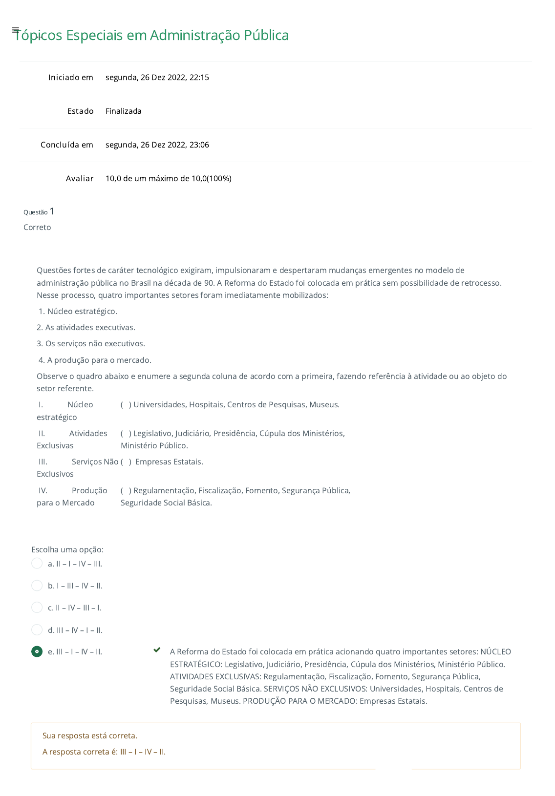 Tópicos Especiais em Administração Pública Iniciado em segunda, 26 Dez 2022, 22:15 Estado Finalizada Concluída em segunda, 26 Dez 2022, 23:06 Avaliar 10,0 de um máximo de 10,0(100%) Questão 1 Correto Questões fortes de caráter tecnológico exigiram, impulsionaram e despertaram mudanças emergentes no modelo de administração pública no Brasil na década de 90. A Reforma do Estado foi colocada em prática sem possibilidade de retrocesso. Nesse processo, quatro importantes setores foram imediatamente mobilizados: 1. Núcleo estratégico. 2. As atividades executivas. 3. Os serviços não executivos. 4. A produção para o mercado. Observe o quadro abaixo e enumere a segunda coluna de acordo com a primeira, fazendo referência à atividade ou ao objeto do setor referente. I. Núcleo estratégico ( ) Universidades, Hospitais, Centros de Pesquisas, Museus. II. Atividades Exclusivas ( ) Legislativo, Judiciário, Presidência, Cúpula dos Ministérios, Ministério Público. III. Serviços Não Exclusivos ( ) Empresas Estatais. IV. Produção para o Mercado ( ) Regulamentação, Fiscalização, Fomento, Segurança Pública, Seguridade Social Básica. Escolha uma opção: a. II – I – IV – III. b. I – III – IV – II. c. II – IV – III – I. d. III – IV – I – II. e. III – I – IV – II. A Reforma do Estado foi colocada em prática acionando quatro importantes setores: NÚCLEO ESTRATÉGICO: Legislativo, Judiciário, Presidência, Cúpula dos Ministérios, Ministério Público. ATIVIDADES EXCLUSIVAS: Regulamentação, Fiscalização, Fomento, Segurança Pública, Seguridade Social Básica. SERVIÇOS NÃO EXCLUSIVOS: Universidades, Hospitais, Centros de Pesquisas, Museus. PRODUÇÃO PARA O MERCADO: Empresas Estatais. Sua resposta está correta. A resposta correta é: III – I – IV – II. https://aula.fael.edu.br/ Questão 2 Correto “No patrimonialismo, o aparelho do Estado funciona como uma extensão do poder do soberano, e os seus auxiliares, servidores, possuem status de nobreza real. Os cargos são considerados prebendas. A res publica não é diferenciada das res principis. Em consequência, a corrupção e o nepotismo são inerentes a esse tipo de administração”. (PDRAE, 1995, p. 15) Esse modelo de Administração imperou no Brasil até meados de 1889 e foi in�uente instrumento que deu essência à cultura gerencial burocrática. Outro importante fator que referencia e marca o modelo patrimonialista é: Escolha uma opção: a. É também característico desse modelo, a aplicação de ferramentas administrativas usuais na administração privada adaptadas aos setores públicos, principalmente pelas metas de e�ciência e qualidade nos serviços. b. Presença constante das interferências do nepotismo e da corrupção. Entre os diversos fatores que marcaram a administração Patrimonialista está a não diferenciação do que é patrimônio público ou o que é patrimônio privado o que favorece as interferências do nepotismo e da corrupção. (TEIXEIRA e RIBEIRO, 2017). c. Esse modelo �rmou-se como um modelo básico entre a maioria das organizações no século XX. d. É nesse modelo que identi�camos as primeiras estratégias administrativas. e. Suas principais características são: Separação entre propriedade e administração, caráter legal das normas e regulamentos das instituições. Sua resposta está correta. A resposta correta é: Presença constante das interferências do nepotismo e da corrupção. https://aula.fael.edu.br/ Questão 3 Correto Entenda o escândalo de uso político de dados que derrubou valor do Facebook e o colocou na mira de autoridades: Vazamento sem precedentes expôs dados de 50 milhões de usuários e mergulhou empresa em nova crise, pouco tempo depois de comoção sobre disseminação de notícias falsas: O Facebook sofreu um forte abalo no último sábado com a revelação de que as informações de mais de 50 milhões de pessoas foram utilizadas sem o consentimento delas pela empresa americana Cambridge Analytica para fazer propaganda política”. (Fonte: https://www.bbc.com). Notícias como essa são dadas a publicidade todos os dias. Afetam empresas privadas como o Facebook e ainda mais empresa públicas, já que deveriam ser administradas a partir dos princípios da administração pública que organizam e orientam seus processos a �m de não permitir ações contrárias ao interesse da sociedade. Fato que as redes sociais trouxeram à luz da informação as ações da sociedade e, com ela, principalmente, as ações dos agentes públicos. Mas, como sabemos quem cobrar? Sabemos que a estrutura administrativa da gestão pública está dividida em duas partes: A Administração Direta e a Administração Indireta. Enumere as opções abaixo utilizando: 1. Administração Direta 2. Administração Indireta ( ) Presidência da República e Ministérios. ( ) Instituições com personalidade jurídica própria. ( ) Poderes da União. ( ) Estados e Municípios. Agora, assinale a opção que apresenta a sequência correta. Escolha uma opção: a. 2 – 1 – 2 – 2. b. 1 – 1 – 2 – 2. c. 2 – 2 – 1 – 1. d. 1 – 1 – 2 – 1. e. 1 – 2 – 1 – 1. A estrutura administrativa da gestão pública está dividida em duas partes: 1. ADMINISTRAÇÃO DIRETA: Conjunto de instituições e unidades organizacionais de cada um dos Poderes da União, Estados e Municípios e 2. ADMINISTRAÇÃO INDIRETA: Criadas para realizar atividades governamentais de forma descentralizadas. Sua resposta está correta. A resposta correta é: 1 – 2 – 1 – 1. https://www.bbc.com/ https://aula.fael.edu.br/ Questão 4 Correto “Prestar serviço público e sob esse aspecto serão Pessoas Jurídicas de Direito Privado com regime jurídico muito mais público do que privado, sem, contudo, passarem a ser titulares do serviço prestado, pois recebem somente pela descentralização a execução do serviço. Outra �nalidade está