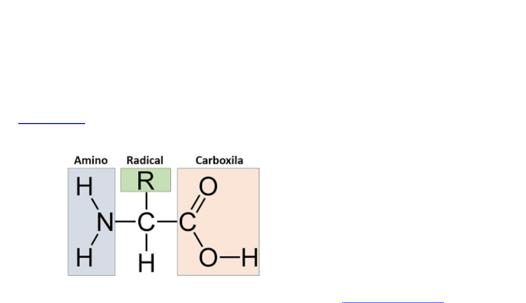 PROTEÍNAS As proteínas são as macromoléculas orgânicas mais abundantes das células, fundamentais para a estrutura e função celular. Elas são encontradas em todos os tipos de células e nos vírus. Elas são formadas por aminoácidos ligados entre si e unidos através de ligações peptídicas. Aminoácidos Os aminoácidos são moléculas orgânicas que possuem, pelo menos, um grupo amina - NH2 e um grupo carboxila - COOH em sua estrutura. As proteínas são polímeros de aminoácidos ligados entre si por ligações peptídicas. Uma ligação peptídica é a união do grupo amino (-NH2) de um aminoácido com o grupo carboxila (-COOH) de outro aminoácido. Eles são as unidades fundamentais das proteínas. Todas as proteínas são formadas a partir da ligação sequencial de 20 aminoácidos. Alguns aminoácidos especiais podem estar presentes em alguns tipos de proteínas. Composição das Proteínas De peso molecular extremamente elevado, as proteínas são compostas por carbono, hidrogênio, nitrogênio e oxigênio, sendo que praticamente todas elas possuem enxofre. Elementos como ferro, zinco e cobre também podem estar presentes. Todas as proteínas são formadas por um conjunto de 20 aminoácidos, arranjados em sequências específicas variadas. Tipos de Proteínas Dependendo da sua função no organismo, as proteínas são classificadas em dois grandes grupos: Proteínas Dinâmicas: Esse tipo de proteína realiza funções como defesa do organismo, transporte de substâncias, catálise de reações, controle do metabolismo; Proteínas Estruturais: Como o próprio nome indica, sua função principal é a estruturação das células e dos tecidos no corpo humano. O colágeno e a elastina são exemplos desse tipo de proteína. Classificação das Proteínas As proteínas podem ser classificadas das seguintes formas: Quanto à Composição · Proteínas Simples: Liberam apenas aminoácidos durante a hidrólise; · Proteínas Conjugadas: Por hidrólise, liberam aminoácidos e um radical não peptídico, denominado grupo prostético. Quanto ao Número de Cadeias Polipeptídicas · Proteínas Monoméricas: Formadas apenas por uma cadeia polipeptídica; · Proteínas Oligoméricas: De estrutura e função mais complexas, são formadas por mais de uma cadeia polipeptídica. Quanto à Forma · Proteínas Fibrosas: A maioria das proteínas fibrosas são insolúveis em meio aquosos e possuem pesos moleculares bastante elevados. Normalmente são formadas por longas moléculas de formato quase retilíneo e paralelas ao eixo da fibra. Fazem parte deste grupo as proteínas estruturais como o colágeno do tecido conjuntivo, a queratina do cabelo, a miosina dos músculos, entre outras; · Proteínas Globulares: Possuem estrutura espacial mais complexa e são esféricas. Geralmente são solúveis em meio aquoso. São exemplos de proteínas globulares as proteínas ativas, como as enzimas, e as transportadoras, como a hemoglobina. Função das Proteínas · Fornecimento de energia; · Estruturação da célula; · Catalisador de funções biológicas, na forma de enzimas; · Regulação de processo metabólicos; · Armazenamento de substâncias; · Transporte de substâncias; · Construção e reparação dos tecidos e músculos; · Defesa do organismo, na forma de anticorpos; · Produção de hormônios e neurotransmissores. Os alimentos ricos em proteínas são os de origem animal e em menor quantidade de origem vegetal: · Alimentos de origem animal: Carnes em geral, peixes, ovos, leite e derivados; · Alimentos de origem vegetal: Feijão, lentilha, soja, quinoa, trigo, ervilhas. As proteínas são classificadas segundo a forma e a função, agindo em sistemas e órgãos do corpo humano, sendo: Cromoproteínas → proteínas que conferem características pigmentares. Glicoproteínas → proteínas associadas a grupamentos glicídicos, comum no glicocalix. Lipoproteínas → proteínas associadas a grupamentos lipídicos. Nucleoproteínas → proteínas com funções voltadas especificamente para as atividades que ocorrem no núcleo. Endocrinoproteínas → proteínas com atividade hormonal, por exemplo, a insulina, que participa na redução do nível de açúcar no sangue." Globina → proteína que compõe a molécula de hemoglobina. Albumina → proteína importante na nutrição do embrião. Fibrinogênio → proteína componente do plasma sanguíneo, participando do processo de coagulação. Queratina → proteína que participa da estruturação das unhas e pelos. Colágeno → proteína encontrada na pele humana e cartilagens, conferindo elasticidade."