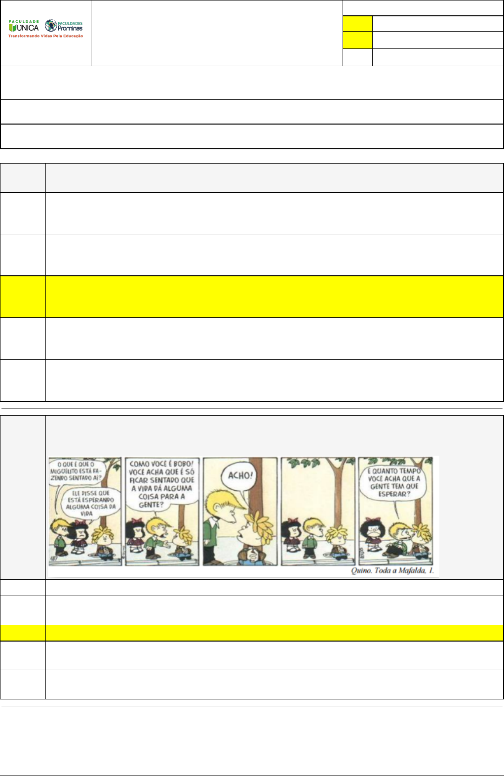 Pincel Atômico - 27/12/2022 13:41:30 1/3 JARDIEL JOSÉ DE LIMA CAMINHO DO CONHECIMENTO Atividade finalizada em 27/12/2022 13:29:11 (tentativa: 2) LEGENDA Resposta correta na questão # Resposta correta - Questão Anulada X Resposta selecionada pelo Aluno Disciplina: PRÁTICA PEDAGÓGICA INTERDISCIPLINAR: ATENDIMENTO EDUCACIONAL ESPECIALIZADO NA SALA DE RECURSOS MULTIFUNCIONAIS [capítulos - 4] - Avaliação com questões, com o peso total de 1,11 pontos Turma: Segunda Graduação: Segunda Graduação 6 Meses - Licenciatura em Educação Especial - Grupo: FPD-FEV2022 - SGegu0A181222 [80112] Aluno(a): 91386855 - JARDIEL JOSÉ DE LIMA - Respondeu 3 questões corretas, obtendo um total de 0,42 pontos como nota Questão 001 A Lei de Diretrizes e Bases (Lei nº 9.394/ 96) tem como princípios e fins da Educação nacional um dos aspectos apresentados abaixo. Assinale-o. A) Garante o ensino gratuito e obrigatório para crianças e adolescentes em ensino regular, não estabelecendo diretrizes para aqueles indivíduos que apresentam defasagem entre ano escolar e faixa etária. X B) Compreende a Educação e seu processo de formação como livre, democrática e para todos em todo o território nacional apresentando uma unicidade de vozes de atores sociais e contextos históricos locais e nacionais. C) Apresenta um processo formativo abrangente envolvendo família, convivência humana, trabalho, instituições de ensino e pesquisa, além da influência dos movimentos sociais, organizações da sociedade civil e manifestações culturais. D) Oferece educação infantil com o objetivo de acompanhamento educacional e registro de desenvolvimento cognitivo das crianças para determinar a promoção das mesmas para o acesso ao ensino fundamental. E) Regula o processo formativo permanente das crianças e adolescentes através exclusivamente da família, vinculando-o não só ao mundo familiar como também às práticas sociais comunitárias de empoderamento identitário. Questão 002 A tirinha acima da Mafalda, criada por Quino, nos remete à noção de como as crianças pensam o tempo. Piaget escreveu sobre a noção de tempo nas crianças tentando entender como ela ocorre e afirmando que tal noção é A) inata e humana, pois não concebemos nenhum indivíduo sem ela quer na escola ou fora dela. B) inata e independente, já que cada ser humano nasce com uma capacidade neuronal e intelectiva determinada. X C) aprendida e construída, pois vai se ampliando pelas vivências sociais e pessoais do indivíduo. D) hereditária e natural, porque a herança genética é algo inerente à carga biológica da natureza do indivíduo. E) histórica e adquirida, porque desenvolve-se gradualmente à medida que o indivíduo entra na escola. Pincel Atômico - 27/12/2022 13:41:30 2/3 Questão 003 Existem diferentes abordagens teóricas para a compreensão dos processos de seleção e legitimação de propostas curriculares, conforme o quadro abaixo indica: X A) I - teorias pedagógicas; II - teorias sociológicas; III - teorias culturalistas. B) I - abordagem didática; II - abordagem global; III - abordagem integral. C) I - teorias críticas; II - teorias pós-críticas; III - teorias sócio-críticas. D) I - teorias tradicionais; II - teorias críticas; III - teorias pós-críticas. E) I - teorias instrucionais; II - teorias sociais; III - teorias diferencialistas. Questão 004 Avalie as afirmações a seguir. I. A família representa a maior parte do ambiente da criança. II. O ambiente escolar também afeta o desenvolvimento da criança. III. A escola, ao fornecer experiências de grupo, expande a consciência social e contribui para o desenvolvimento de atitudes e valores sociais. A) I, III X B) I e II. C) II, III. D) I, II, III. E) II. Questão 005 Avalie as asserções a seguir e a relação proposta entre elas. I. Em relação aos métodos de ensino, eles não podem ser pensados antes do currículo. PORQUE II. o currículo precisa ser inflexível pensado para um aluno com deficiência e que contemple a diversidade. . A) As asserções I e II são proposições verdadeiras, mas a II não é uma justificativa correta da I. B) A asserção I é uma proposição falsa, e a II é uma proposição verdadeira. X C) As asserções I e II são proposições falsas. D) A asserção I é uma proposição verdadeira, e a II é uma proposição falsa. E) As asserções I e II são proposições verdadeiras, e II é uma justificativa correta da I. Questão 006 Avalie as asserções a seguir e a relação proposta entre elas. I. Em se tratando das atividades lúdicas, elas exigem a participação ativa dos estudantes em um movimento permanente de ação e reflexão. PORQUE II. As aulas devem ser ativas, onde os alunos entendam o mundo tecnológico através de sua própria experiência, com uma intervenção de ensino que facilita e orienta o processo de aprendizagem que está ocorrendo e com o uso de material didático apropriado às circunstâncias. X A) As asserções I e II são proposições verdadeiras, e II é uma justificativa correta da I. B) A asserção I é uma proposição verdadeira, e a II é uma proposição falsa. C) As asserções I e II são proposições verdadeiras, mas a II não é uma justificativa correta da I. D) A asserção I é uma proposição falsa, e a II é uma proposição verdadeira. E) As asserções I e II são proposições falsas. Pincel Atômico - 27/12/2022 13:41:30 3/3 Questão 007 Assinale a alternativa correta: X A) Devemos pensar a aprendizagem associada a tecnologia no seu aspecto mais tradicional. B) As estratégias pedagógicas que estão no âmbito micro do contexto escolar e ias estratégias didáticas, que compõe o âmbito macro. C) As estratégias pedagógicas são as ações e processos realizados com o objetivo de que o aluno alcance uma aprendizagem significativa. D) À medida que a tecnologia adentrou as salas de aula, as estratégias pedagógicas não foram modificadas. E)