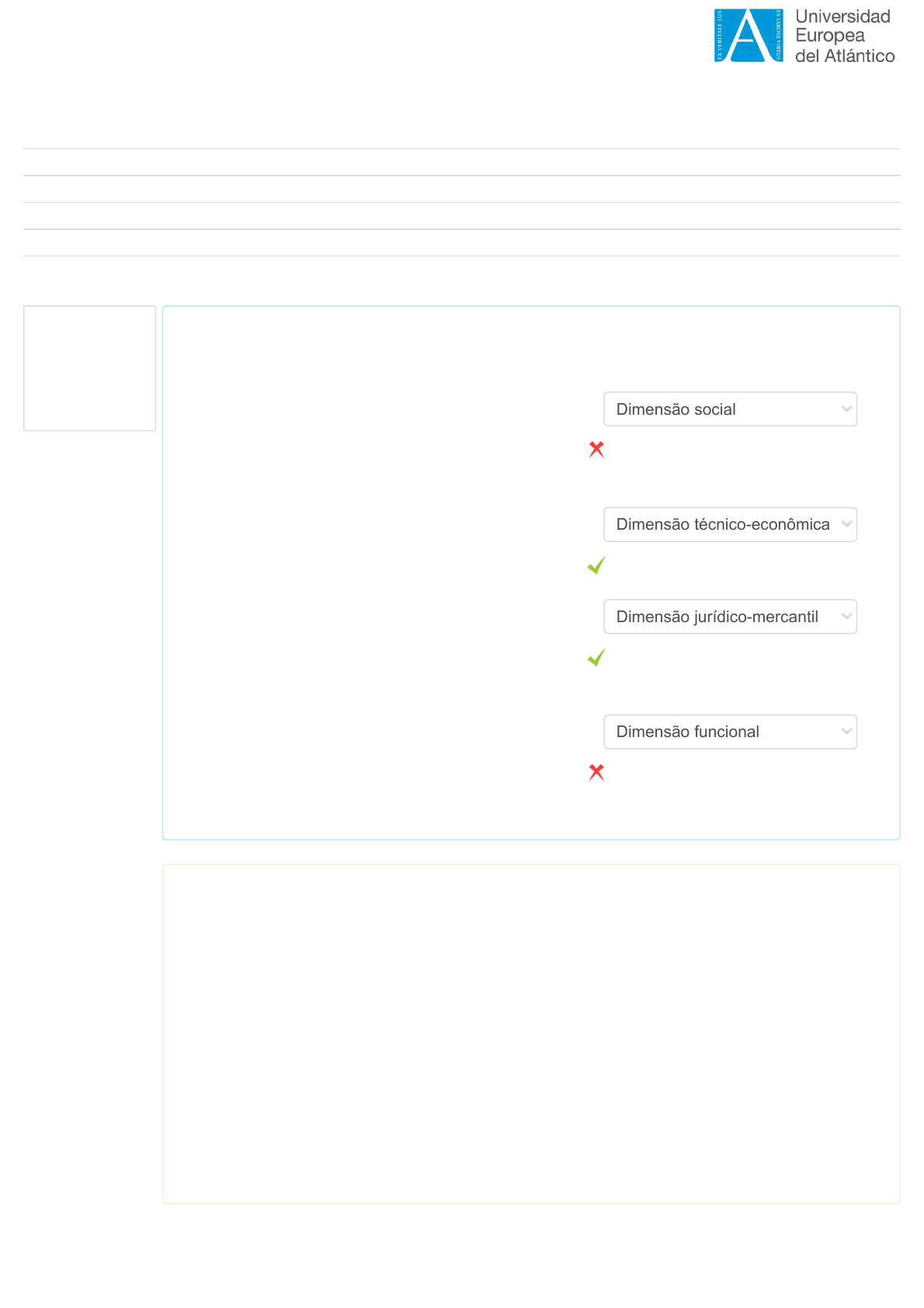 Página principal ► MMMDBD###2020-vEA-TFC ► TR026 ► Tópico 3 ► Exame Pergunta 1 Parcialmente correta Nota: 0,40 em 0,80 Iniciada Wednesday, 28 December 2022, 19:25 Estado Terminada Terminada Wednesday, 28 December 2022, 20:03 Tempo gasto 38 minutos 33 segundos Nota 9,52 num máximo de 10,00 (95%) Relacione as seguintes definições: É uma atividade organizada e alternativa ao mercado e com intenção de lucro. Representa a justificação do papel que a empresa desempenha na economia de mercado, destacando-se a figura do empresário. Considera a empresa como uma organização. Atividade produtiva de bens e serviços. Concentra-se na transformação produtiva, explicada por certas funções de produção e custo. Considera a empresa como uma unidade de produção. Atividade geradora de atividades contratuais entre os fatores. Considera a empresa como uma unidade de decisão. Atividade composta por relações humanas e de poder. É a atividade mais importante e à qual, ultimamente, tem-se dado mais atenção. Constitui um complexo desenho de comunicações e relações existentes dentro de um grupo de pessoas. Considera a empresa como um sistema social. Respuesta parcialmente correcta. Selecionou 2 respostas corretas. A resposta correcta é: É uma atividade organizada e alternativa ao mercado e com intenção de lucro. Representa a justificação do papel que a empresa desempenha na economia de mercado, destacando-se a figura do empresário. Considera a empresa como uma organização. → Dimensão funcional, Atividade produtiva de bens e serviços. Concentra-se na transformação produtiva, explicada por certas funções de produção e custo. Considera a empresa como uma unidade de produção. → Dimensão técnico-econômica, Atividade geradora de atividades contratuais entre os fatores. Considera a empresa como uma unidade de decisão. → Dimensão jurídico-mercantil, Atividade composta por relações humanas e de poder. É a atividade mais importante e à qual, ultimamente, tem-se dado mais atenção. Constitui um complexo desenho de comunicações e relações existentes dentro de um grupo de pessoas. Considera a empresa como um sistema social. → Dimensão social Dimensão social Dimensão técnico-econômica Dimensão jurídico-mercantil Dimensão funcional https://campus2.funiber.org/ https://campus2.funiber.org/course/view.php?id=5185 https://campus2.funiber.org/course/view.php?id=3006 https://campus2.funiber.org/course/view.php?id=3006#section-3 https://campus2.funiber.org/mod/quiz/view.php?id=211651 Pergunta 2 Correta Nota: 0,80 em 0,80 Relacione as seguintes definições: As estratégias competitivas contemplam como passo prévio seu próprio estabelecimento, a posição e o comportamento das empresas concorrentes mais significativas com as quais a empresa tem que se confrontar. São aquelas que se caracterizam por se situarem em mercados de débil crescimento, contando a empresa, ao mesmo tempo, com uma reduzida participação relativa; o que faz com que estas atividades se tornem pouco desejáveis, devendo abandoná-las. Esta última fase do processo de planejamento tem como objetivo a realização de um acompanhamento da implantação dos programas e das estratégias, assim como dos outros aspectos que podem alterá-los, como é o caso das forças externas. As estratégias de desenvolvimento assentam na existência de uma vantagem competitiva para a empresa que é consequência de uma vantagem ligada aos custos ou da diferenciação dos produtos da empresa (Porter, 1980). São aquelas que se caracterizam por se situarem em um mercado de crescimento reduzido, tendo a empresa uma elevada participação relativa. Essas atividades são muito rentáveis a curto prazo para a empresa, pois conferem a ela uma vantagem competitiva que lhe proporciona boas receitas, sem que para isso precise efetuar grandes investimentos de modo a manter essa situação. Estas atividades permitem à empresa financiar seus eventuais investimentos em pesquisa ou diversificação. Respuesta correcta A resposta correcta é: As estratégias competitivas contemplam como passo prévio seu próprio estabelecimento, a posição e o comportamento das empresas concorrentes mais significativas com as quais a empresa tem que se confrontar. → Estratégias competitivas, São aquelas que se caracterizam por se situarem em mercados de débil crescimento, contando a empresa, ao mesmo tempo, com uma reduzida participação relativa; o que faz com que estas atividades se tornem pouco desejáveis, devendo abandoná-las. → Atividades ou produtos “pesos mortos”, Esta última fase do processo de planejamento tem como objetivo a realização de um acompanhamento da implantação dos programas e das estratégias, assim como dos outros aspectos que podem alterá-los, como é o caso das forças externas. → Acompanhament o e controle, As estratégias de desenvolvimento assentam na existência de uma vantagem competitiva para a empresa que é consequência de uma vantagem ligada aos custos ou da diferenciação dos produtos da empresa (Porter, 1980). → Estratégias de desenvolvimento, São aquelas que se caracterizam por se situarem em um mercado de crescimento reduzido, tendo a empresa uma elevada participação relativa. Essas atividades são muito rentáveis a curto prazo para a empresa, pois conferem a ela uma vantagem competitiva que lhe proporciona boas receitas, sem que para isso precise efetuar grandes investimentos de modo a manter essa situação. Estas atividades permitem à Estratégias competitivas Atividades ou produtos “pesos Acompanhament o e controle Estratégias de desenvolvimen Atividades ou produtos “vacas Pergunta 3 Correta Nota: 0,80 em 0,80 Pergunta 4 Correta Nota: 0,80 em 0,80 empresa financiar seus eventuais investimentos em pesquisa ou diversificação. → Atividades ou produtos “vacas leiteiras” Toda empresa compete em dois mundos: Selecione uma opção de resposta: a