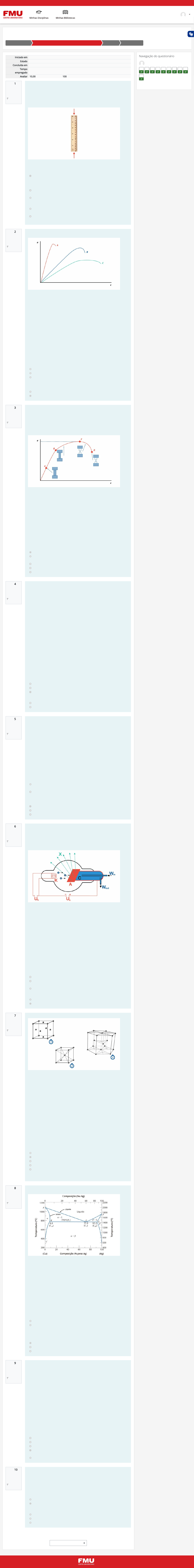 Copyright 2022 222RGR2961A - QUÍMICA GERAL E CIÊNCIAS DOS MATERIAIS Minhas Disciplinas 222RGR2961A - QUÍMICA GERAL E CIÊNCIAS DOS MATERIAIS UNIDADE 2 Atividade 2 (A2) Questão 1 Correto Atingiu 1,00 de 1,00 Marcar questão Questão 2 Correto Atingiu 1,00 de 1,00 Marcar questão Questão 3 Correto Atingiu 1,00 de 1,00 Marcar questão Questão 4 Correto Atingiu 1,00 de 1,00 Marcar questão Questão 5 Correto Atingiu 1,00 de 1,00 Marcar questão Questão 6 Correto Atingiu 1,00 de 1,00 Marcar questão Questão 7 Correto Atingiu 1,00 de 1,00 Marcar questão Questão 8 Correto Atingiu 1,00 de 1,00 Marcar questão Questão 9 Correto Atingiu 1,00 de 1,00 Marcar questão Questão 10 Correto Atingiu 1,00 de 1,00 Marcar questão Iniciado em segunda, 14 nov 2022, 00:41 Estado Finalizada Concluída em segunda, 14 nov 2022, 00:57 Tempo empregado 15 minutos 49 segundos Avaliar 10,00 de um máximo de 10,00(100%) Terminar revisão Em projetos de engenharia, ao se deparar com uma situação em que pilares são submetidos a esforços de compressão, faz-se necessário que o engenheiro avalie a flambagem. A flambagem ocorre quando a peça sofre uma flexão transversalmente em decorrência de uma compressão axial. Esta, por sua vez, é considerada uma instabilidade elástica. Se pegarmos uma régua, por exemplo, e submetermos a tensões de compressão, a depender da régua ela poderá flambar apresentando uma encurvadura. Fonte: Adaptada de Olga Popova / 123RF. Acerca desse ponto, assinale a alternativa correta: a. A tensão crítica para a ocorrência da �ambagem não depende da tensão de escoamento do material, mas sim do seu módulo de Young e do seu comprimento. b. A �ambagem depende de três principais fatores: ductilidade, tenacidade e do módulo de Young. c. A falta de homogeneidade e retilineidade da peça pode in�uenciar signi�cativamente na �ambagem, mas esses fatores não decorrem do processo de fabricação da mesma. d. Os parâmetros mais importantes para a �ambagem são a tensão no ponto de proporcionalidade e o limite de ruptura do material. e. A �ambagem pode ocorrer não somente em ensaios de compressão, mas também em ensaios de tração. Analise o gráfico a seguir: Fonte: Autoria própria (2019). É um dever do engenheiro familiarizar-se com as diferentes propriedades mecânicas, saber as dimensões e o significados dessas propriedades. Desse modo, esse conhecimento será necessário para o projeto de estruturas e componentes que utilizem materiais previamente determinados, a fim de que não ocorram níveis inaceitáveis de deformação e/ou falhas. Considerando o gráfico tensão deformação, analise as afirmativas a seguir e assinale V para a(s) Verdadeira(s) e F para a(s) Falsa(s). I. ( ) O material C possui uma maior tensão de ruptura do que o material B. II. ( ) O eixo das abscissas é adimensional, ao passo que o eixo das ordenadas representa-se por MPa. III. ( ) A lei de Hooke é válida para todos os três materiais até o limite de proporcionalidade; IV. ( ) O módulo de elasticidade do material A é maior do que o módulo de elasticidade do material C. A, então, poderia ser um material cerâmico, enquanto que C poderia ser um alumínio (metálico). Assinale a alternativa que apresenta a sequência correta: a. V, V, V, F. b. F, V, F, V. c. F, V, V, F d. V, V, F, F. e. F, V, V, V. A maioria das estruturas é projetada para certificar que ocorra apenas deformação elástica quando uma tensão for submetida. Uma estrutura ou componente que tenha sido deformado plasticamente, ou que tenha sofrido mudança permanente em sua forma, pode não ser capaz de funcionar como planejado pela equipe de engenharia. Torna-se, por conseguinte, desejável conhecer o nível de tensão no qual tem início a deformação plástica, ou no qual ocorre o fenômeno chamado escoamento. Fonte: Autoria própria A respeito do ensaio de tração mostrado no gráfico tensão-deformação, analise as afirmativas a seguir e assinale V para a(s) Verdadeira(s) e F para a(s) Falsa(s). I. ( ) O ponto A é conhecido como o escoamento do material e há diferença física entre o corpo de prova com relação ao ponto B. II. ( ) O ponto C corresponde ao limite de resistência à tração.Se essa tensão for aplicada e mantida, ocorrerá a fratura do corpo de prova. III. ( ) O ponto C apresenta constrição ou empescoçamento e a lei de Hooke é válida apenas até esse ponto, conhecido como “ponto máximo”. IV. ( ) Entende-se por resistência à fratura o correspondente à tensão no ponto D, isto é, ponto em que ocorrerá a ruptura do corpo de prova. Assinale a alternativa que apresenta a sequência correta: a. F, V, F, V. b. F, V, V, F c. V, V, F, F. d. F, V, V, V. e. V, V, V, F. A transformação de fase é bem útil desde tempos remotos. Sabe-se que o imperador romano Júlio César já afirmava, em 55 a.C, que os guerreiros se defrontavam com um problema em seus armamentos. Decorrido um tempo de uso, as espadas entortaram e eles precisavam interromper as lutas para consertar suas armas de ferro. Os romanos, por outro lado, já haviam descoberto que o ferro se tornava mais duro quando aquecido durante longo tempo e resfriado, logo em seguida, em uma salmoura. Com relação a transformação de fase de uma liga de ferro com 0,4% de carbono, analise as afirmativas a seguir e assinale V para a(s) Verdadeira(s) e F para a(s) Falsa(s). I. ( ) Com o auxílio de um microscópio metalográfico, é possível identificar dois constituintes da estrutura do aço: grãos claros, chamados perlita (CCC), e grãos escuros, chamados ferrita. II. ( ) O aço, ao ser aquecido, pode passar por diversas transformações, no qual a região denominada zona crítica gráfica é a área em que as células unitárias de CCC são transformadas em CFC. III. ( ) A austenita se forma na estrutura do aço submetido a temperaturas elevadas. Encontra- se na região acima da zona crítica, zona de austenização. Esta, po