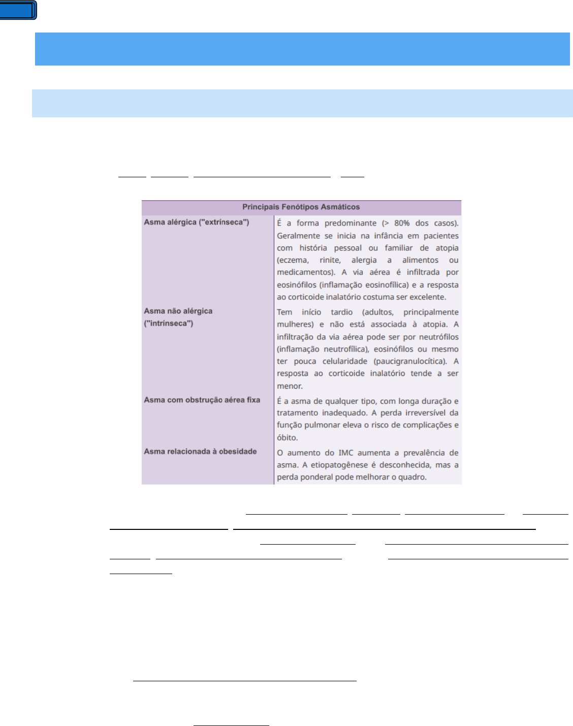Asma Acd. Paulo Roberto T30 1 Asma Acd. Paulo Roberto T30 Aspectos Gerais • Conceito: ➢ Doença heterogênea (diversos fenótipos e endótipos), caracterizada por inflamação crônica das vias aéreas com limitação episódica ao fluxo aéreo – pelo menos parcialmente reversível – com hiperresponsividade, levando a sibilos, dispneia, opressão torácica retroesternal e tosse, os quais varia com o tempo e na intensidade; o Fenótipos: o Endótipos: ▪ Inflamação tipo 2 (T2) alta – asma de início precoce, mais grave, associada à atopia/IgE e à eosinofilia nas vias aéreas e sistêmica; responsivos aos corticoides e às drogas que inibem a inflamação T2; ▪ Inflamação tipo 2 (T2) baixa – asma de início tardio, com ausência de eosinofilia nas vias aéreas e sistêmica; responsividade diminuída aos corticoides; também não respondem às drogas que inibem a inflamação T2; • Epidemiologia: ➢ Prevalência, no Brasil, de 20% entre adolescentes – uma das mais altas do mundo; ➢ 300 milhões no mundo e 20 milhões no Brasil; ➢ No ano de 2019, segundo a OMS, um estudo entre adultos de 18 a 45 anos evidenciou que 23% dos brasileiros tiveram sintomas de asma, porém apenas 12% tinham diagnóstico prévio; ➢ Em 2013, houveram cerca de 129.728 internações e 2.047 mortes no País; ➢ Felizmente, a mortalidade e as hospitalizações estão diminuindo, ao passo que há maior acesso aos tratamentos; ➢ A asma não controlada compromete ¼ da renda familiar entre usuários do SUS. E, infelizmente, apenas 12,3% dos asmáticos tem bom controle da doença; ➢ O pico de incidência é aos três anos de vida; ➢ Infância – mais comum em meninos; ➢ Puberdade – mais comum em meninas; ➢ Adultos – mesma proporção; Asma Acd. Paulo Roberto T30 2 • Controle x gravidade da asma: ➢ Controle da asma expressa a intensidade com que as manifestações são supridas pelo tratamento, apresentando variações em dias ou semanas, e compreende: ▪ Controle das limitações clínicas atuais – sintomas mínimos durante o dia, ausência dos sintomas à noite, necessidade reduzida de medicação de alívio dos sintomas, ausência de limitação das atividades físicas; ▪ Redução dos riscos futuros – exacerbações, perda acelerada da função pulmonar e efeitos adversos do tratamento; ➢ A avaliação do controle, em geral, é feita em relação às últimas 4 semanas. É o principal parâmetro para ajustar ou não o plano terapêutico; OBS – A espirometria, apesar de não fazer parte da avaliação de controle da GINA e do ACT, quando disponível, a avaliação funcional deve ser feita a cada 3-6 meses para estimar o risco futuro de exacerbações e de perda acelerada da função pulmonar; ➢ Gravidade – refere-se à quantidade de medicamentos para atingir o controle, refletindo uma característica intrínseca da doença, e que pode ser alterada lentamente com o tempo; ▪ Asma leve – step 1 ou 2; ▪ Asma moderada – step 3; ▪ Asma grave – step 4 ou 5 ou refratária a estes; Fisiopatologia ▪ Se dá por uma inflamação crônica nas vias aéreas inferiores (sobretudo brônquios de médio e de pequeno calibre, excetuando-se os alvéolos), que gera hipersensibilidade a diferentes estímulos, os quais desencadeiam broncoespasmo; ▪ Nos pacientes que não recebem tratamento apropriado, a persistência da inflamação leva ao remodelamento brônquico, que resulta em alterações irreversíveis, como estreitamento luminal por fibrose, hipertrofia/hiperplasia da camada muscular e das glândulas submucosas, que passam a hipersecretar muco; • Resposta inflamatória T2 alta: ▪ Resulta da interação das imunidades adaptativa e inata; ▪ Caracterizado pelo aumento de biomarcadores, como EosEI, EosS e FeNO, correspondendo a 50-75% dos casos de asma grave; ▪ Th2 – IL-4, IL-5 e IL-13: ✓ IL-4 – maturação de linfócitos naive para linfócitos Th2 e mudança de linfócitos B em produtores de IgE; ✓ IL-5 – recrutamento, maturação, ativação e sobrevida dos eosinófilos; Asma Acd. Paulo Roberto T30 3 ✓ IL-13 – fibrose e remodelamento da musculatura lisa e, em conjunto com a IL-4, regula a produção de IgE e induz a hiperplasia das células caliciformes, com consequente aumento da produção de muco; ▪ ILC2 – IL-5 e IL-13: ✓ Estimuladas pela IL-33 e IL-25 devido ao dano do epitélio das vias aéreas; ▪ Linfócitos B – IgE, eosinófilos, mastócitos e basófilos; ▪ Alarminas – citocinas epiteliais, mediadoras frente a estímulos externos (alérgenos, vírus, bactérias, fumaça e poluentes, etc); • Resposta inflamatória T2 baixa: ▪ Possivelmente associada à ativação das imunidades inata e adquirida; ▪ Produção de alarminas (IL-33 e TSLP), que estimulam Th17 a produzirem IL-6, IL-8 e IL-17 – papel importante na atração e estimulação de neutrófilos; ▪ Adicionalmente pode haver ativação de Th1, que produz TNF-alfa e INF-gama, os quais também estimulam a inflamação neutrofílica; ASMA EOSINOFÍLICA – alérgica ou não alérgica (predomina no sexo feminino e em asmáticos com rinossinusite crônica com ou sem polipose nasal e /ou obesidade, menor resposta aos corticoides e exacerbações frequentes); ASMA NEUTROFÍLICA – comumente associado a infecções respiratórias frequentes, tabagismo, exposição a poluentes ambientais ou ocupacionais e, em alguns casos, ao tratamento crônico com corticoides; ASMA PACIGRANULOCÍTICA – infrequente, feito pela ausência de eosinofilia e neutrofilia; Quadro clínico ▪ Dispneia + tosse (predomínio noturno) + sibilos – achado mais comum; ▪ Secreção costuma ser hialina, caráter mucoide (“baba branca”); ▪ Podem melhorar espontaneamente; ▪ Melhora parcial ou total com tratamento; ▪ Opressão/desconforto torácico – pode estar presente; ▪ Piora com exposição a alérgenos; ▪ Sintomas pioram à noite e durante as primeiras horas do dia – 