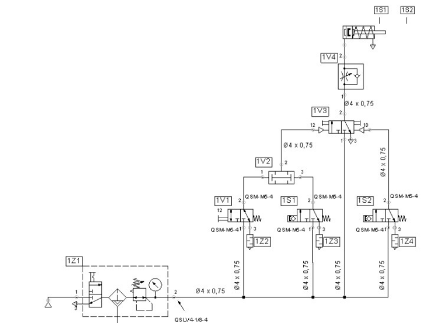 IDENTIFICAÇÃO DE CIRCUITOS PNEUMÁTICOS: - Elementos de trabalho: número seqüencial + letra A (1A, 2A, 3A, ...) -Elementos de tratamento e distribuição do ar comprimido: número seqüencial + letra P ou Z (1P/1Z, 2P/2Z, 3P/3Z, ...) - Elemento de comando e válvulas: número do atuador + letra V + número seqüencial (1V1, 1V2, ... 2V1, 2V2, ...) - Elementos de sinais (fins de curso): número do atuador + letra S +1 para recuado ou 2 para avançado (1S1, 1S2, ... 2S1, ...) - Outros componentes: número do atuador + letra Z + número seqüencial (1Z1, 1Z2, ... 2Z1, ...) O diagrama adiante exemplifica tal sistema de identificação: Fonte: USP – Universidade de São Paulo – Disciplina SEL406. https://edisciplinas.usp.br/pluginfile.php/2854501/mod_resource/content/1/Notas%20de%20Aula_SEL406_2017_Parte1_Pneum%C3%A1tica.pdf