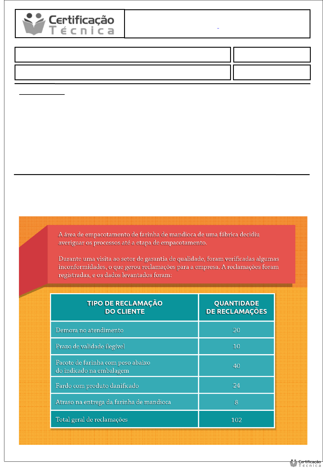 Gestão da Qualidade Total Data: 28/12/2022 Aluno (a): Jéssica Nascimento de Sousa Avaliação Pratica Final INSTRUÇÕES: · Esta Avaliação contém 1 (uma) questão, totalizando 10 (dez) pontos; · Baixe o arquivo disponível com a Atividade Pratica; · Você deve preencher dos dados no Cabeçalho para sua identificação: · Nome / Data de entrega. · As respostas devem ser digitadas abaixo de cada pergunta; · Ao terminar grave o arquivo com o nome Atividade Prática; · Quando solicitado · Envio o arquivo pelo sistema no local indicado; · Em caso de dúvidas consulte o seu Tutor. Para garantir a qualidade de produtos e processos, é plausível que se visite o setor de garantia de qualidade, a fim de averiguar quais são as não conformidades registradas. Suponha que você é o responsável por tomar providências relacionadas aos problemas prioritários, ou seja, aqueles que ocorrem com maior frequência. Sendo assim, resolva as seguintes questões: A) Qual ferramenta de qualidade pode auxiliar no diagnóstico de reclamações com maior ocorrência, a fim de priorizar os problemas? Resposta: Diagrama de Pareto é a ferramenta utilizada para fazer planejamento e melhoria de processos. As folhas de verificação ferramenta permitem uma rápida percepção da realidade e uma breve interpretação da situação, o que auxilia na redução de erros e/ou preveni novos problemas. B) Demonstre como você elaboraria o Diagrama de Pareto a partir dos dados fornecidos para a verificação das percentagens de reclamações acumuladas. Resposta: Primeiramente, deve-se ordenar as reclamações em ordem decrescente, ou seja, as de maior ocorrência para as de menor ocorrência. Posteriormente, para calcular as porcentagens acumuladas, basta dividir o valor de cada reclamação pelo total de reclamações e multiplicar por 100 – isso para a primeira reclamação. Nas demais, é só dividir o total da reclamação pelo total de reclamações, somar com o valor da reclamação anterior e multiplicar por 100, obtendo, assim, os percentuais acumulados. Organizando em ordem crescente ficaria da seguinte maneira: Pacote de farinha com peso abaixo do indicado na embalagem 40 Fardo com produto danificado 24 Demora no atendimento 20 Prazo de validade ilegível 10 Atraso na entrega da farinha de mandioca 8 Total 102 Após isso, descobriria o percentual de cada reclamação ao relacionar suas frequências com o número de casos totais. O cálculo se dá por dividir o número de ocorrências de cada reclamação pelo número total de casos, e multiplicar por 100. Além disso, criar uma coluna com a somatória das porcentagens é necessário, como mostra a tabela abaixo: Pacote de farinha com peso abaixo do indicado na embalagem 39,22% 39,22% Fardo com produto danificado 23,53% 62,75% Demora no atendimento 19,61% 82,36% Prazo de validade ilegível 9,80% 92,16% Atraso na entrega da farinha de mandioca 7,84% 100% Total 100% 100% Com isso feito, basicamente me resta criar 2 gráfico e sobrepor eles, o primeiro será com o número de casos totais, em barras verticais. O segundo será em linhas 2D, e constará as porcentagens acumuladas. Sobrepondo-os teremos o diagrama de Pareto, que esclarecerá quais os problemas devem ser focados como prioridade Com isso feito, basicamente resta criar 2 gráficos e sobrepor eles. O 1° será com número total, em barras verticais. O 2° será em linhas 2D, e constará as porcentagens acumuladas. Sobrepondo-os teremos o diagrama de Pareto, que esclarecerá quais os problemas devem ser focados como prioridade. Gestão da Qualidade Total Gestão da Qualidade Total