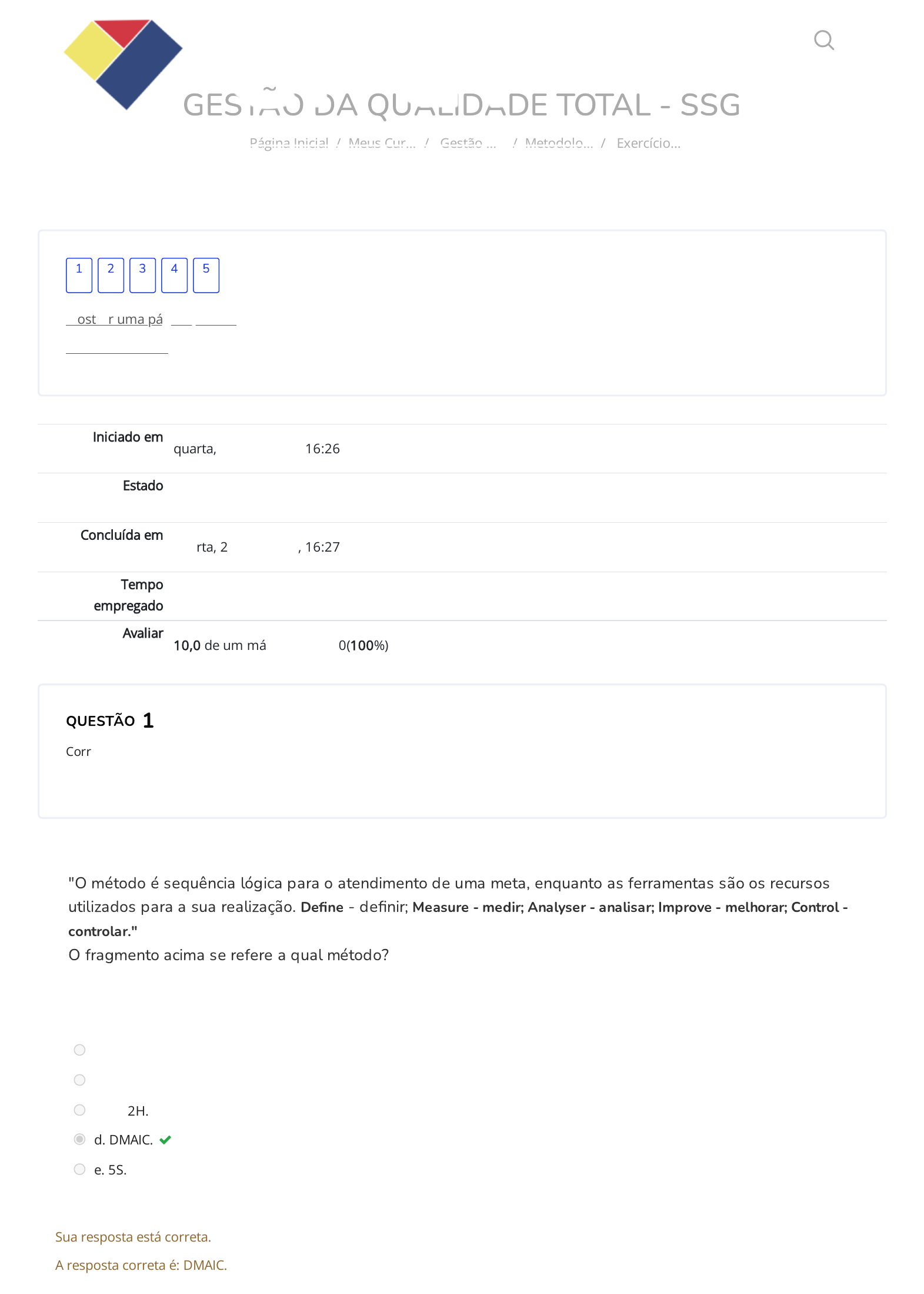 28/12/2022 16:28 Exercício de Fixação - Metodologia e Ferramentas de Qualidade: Revisão da tentativa https://cpetead.com.br/mod/quiz/review.php?attempt=3382313&cmid=41522 1/4 GESTÃO DA QUALIDADE TOTAL - SSG Página Inicial / Meus Cur… / Gestão … / Metodolo… / Exercício… Iniciado em quarta, 28 Dez 2022, 16:26 Estado Finalizada Concluída em quarta, 28 Dez 2022, 16:27 Tempo empregado 53 segundos Avaliar 10,0 de um máximo de 10,0(100%) QUESTÃO Correto Atingiu 2,0 de 2,0 Mostrar uma página por vez Terminar revisão 1 2 3 4 5 1 "O método é sequência lógica para o atendimento de uma meta, enquanto as ferramentas são os recursos utilizados para a sua realização. De�ne - de�nir; Measure - medir; Analyser - analisar; Improve - melhorar; Control - controlar." O fragmento acima se refere a qual método? Escolha uma opção: a. PDCA. b. MASP. c. 5W2H. d. DMAIC. e. 5S. Sua resposta está correta. A resposta correta é: DMAIC. https://cpetead.com.br/ https://cpetead.com.br/course/view.php?id=272 https://cpetead.com.br/mod/quiz/view.php?id=41522 https://cpetead.com.br/mod/quiz/review.php?attempt=3382313&cmid=41522&showall=0 https://cpetead.com.br/mod/quiz/view.php?id=41522 https://cpetead.com.br/ 28/12/2022 16:28 Exercício de Fixação - Metodologia e Ferramentas de Qualidade: Revisão da tentativa https://cpetead.com.br/mod/quiz/review.php?attempt=3382313&cmid=41522 2/4 QUESTÃO Correto Atingiu 2,0 de 2,0 QUESTÃO Correto Atingiu 2,0 de 2,0 2 Cinco palavras japonesas deram origem ao 5S's. "Identi�cação, classi�cação e remanejamento dos recursos que não são úteis ao �m desejado, além da eliminação de tarefas desnecessárias." O fragmento acima se refere a qual delas? Escolha uma opção: a. Seiton (senso de ordenação). b. Shitsuke (senso da autodisciplina). c. Seiketsu (senso da saúde). d. Seisou (senso da limpeza). e. Seiri (senso da utilização). Sua resposta está correta. A resposta correta é: Seiri (senso da utilização). 3 "Metodologia sistêmica para abordar casos que exigem tomada de decisão devido a situações insatisfatórias, desvio de padrão de desempenho esperado ou de um objetivo estabelecido, reconhecendo a necessidade de correção e seguindo alternativas de ação." A que se refere o fragmento acima? Escolha uma opção: a. CQQ'S. b. DMAIC. c. 5W2H. d. PDCA. e. MASP. Sua resposta está correta. A resposta correta é: MASP. 28/12/2022 16:28 Exercício de Fixação - Metodologia e Ferramentas de Qualidade: Revisão da tentativa https://cpetead.com.br/mod/quiz/review.php?attempt=3382313&cmid=41522 3/4 QUESTÃO Correto Atingiu 2,0 de 2,0 QUESTÃO Correto Atingiu 2,0 de 2,0 4 A MASP é formada por alguns passos que podem ajudar a organizar as ferramentos de forma produtiva, a �m de otimizar a análise e a solução de problemas. Dentre os passos, podemos citar: Escolha uma opção: a. Who (Quem?): Quem realizará as tarefas (responsabilidade), Why (Por que?): Por que deve ser executada a tarefa (justi�cativa), When (Quando?): Quando cada uma das tarefas deverá ser executada (tempo). b. "D" De�nir, "M" Medir ", A" Analisar, "I" Implementar e "C" Controlar. c. Seiton (senso da ordenação), Seiri (senso da utilização), Seisou (senso da limpeza), Seiketsu (senso da saúde), Shitsuke (senso da autodisciplina), diz respeito aos 5 S's. d. Plan (planejar), Do (fazer), Check (checar)e Act (agir). e. Identi�cação do problema, Observação, Análise para descobrir causas, Plano de ação, Ação para eliminar as causas, Veri�cação da e�cácia da ação, Padronização, Conclusão. Sua resposta está correta. A resposta correta é: Identi�cação do problema, Observação, Análise para descobrir causas, Plano de ação, Ação para eliminar as causas, Veri�cação da e�cácia da ação, Padronização, Conclusão. 5 O método Plan-Do-Check-Act (PDCA) é uma das mais famosas ferramentas da gestão da qualidade total. Assinale a alternativa que diz respeito ao signi�cado de plan. Escolha uma opção: a. De�nir. b. Agir. c. Planejar. d. Fazer. e. Checar. Sua resposta está correta. A resposta correta é: Planejar. ◄ Saiba + Seguir para... Atividade Prática I ► https://cpetead.com.br/mod/url/view.php?id=78943&forceview=1 https://cpetead.com.br/mod/assign/view.php?id=44722&forceview=1 28/12/2022 16:28 Exercício de Fixação - Metodologia e Ferramentas de Qualidade: Revisão da tentativa https://cpetead.com.br/mod/quiz/review.php?attempt=3382313&cmid=41522 4/4 Quem somos Cursos Certi�cação Unidades Contato Copyright © 2021 CPET - Centro de Pro�ssionalização e Educação Técnica https://www.cpet.com.br/quem-somos-cpet-cursos-tecnicos-a-distancia-ead/ https://www.cpet.com.br/course-cat/cursos/cursos-online/ https://www.cpet.com.br/certificacao-cpet/ https://www.cpet.com.br/unidades-cpet/ https://www.cpet.com.br/contato/ https://www.facebook.com/CPET-Centro-de-Profissionaliza%C3%A7%C3%A3o-e-Educa%C3%A7%C3%A3o-T%C3%A9cnica-1039179026236475/ https://twitter.com/soucpet/ https://www.instagram.com/soucpet/
