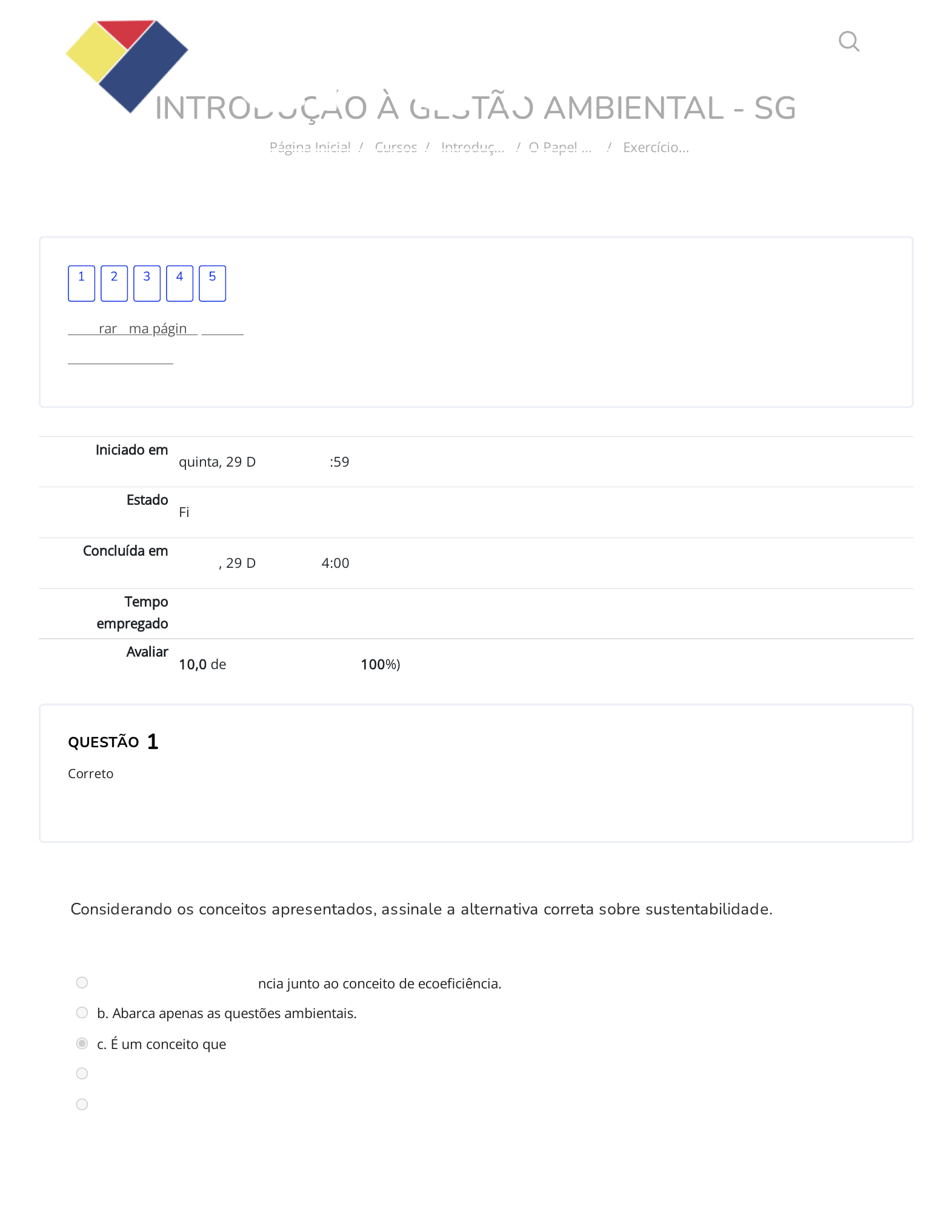 29/12/2022 14:00 Exercício de Fixação - O papel do profissional: Revisão da tentativa https://cpetead.com.br/mod/quiz/review.php?attempt=3385461&cmid=48082 1/4 INTRODUÇÃO À GESTÃO AMBIENTAL - SG Página Inicial / Cursos / Introduç… / O Papel … / Exercício… Iniciado em quinta, 29 Dez 2022, 13:59 Estado Finalizada Concluída em quinta, 29 Dez 2022, 14:00 Tempo empregado 1 minuto 7 segundos Avaliar 10,0 de um máximo de 10,0(100%) QUESTÃO Correto Atingiu 2,0 de 2,0 Mostrar uma página por vez Terminar revisão 1 2 3 4 5 1 Considerando os conceitos apresentados, assinale a alternativa correta sobre sustentabilidade. Escolha uma opção: a. Surgiu em uma conferência junto ao conceito de ecoe�ciência. b. Abarca apenas as questões ambientais. c. É um conceito que engloba a parte econômica, a social e a ambiental. d. Apresenta o conceito do tripé da sustentabilidade, em que estão incluídas a parte social, a ambiental e a empresarial. e. Está relacionada exclusivamente à área da saúde. Sua resposta está correta. A resposta correta é: É um conceito que engloba a parte econômica, a social e a ambiental. https://cpetead.com.br/ https://cpetead.com.br/course/index.php https://cpetead.com.br/course/view.php?id=2036 https://cpetead.com.br/mod/quiz/view.php?id=48082 https://cpetead.com.br/mod/quiz/review.php?attempt=3385461&cmid=48082&showall=0 https://cpetead.com.br/mod/quiz/view.php?id=48082 https://cpetead.com.br/ 29/12/2022 14:00 Exercício de Fixação - O papel do profissional: Revisão da tentativa https://cpetead.com.br/mod/quiz/review.php?attempt=3385461&cmid=48082 2/4 QUESTÃO Correto Atingiu 2,0 de 2,0 QUESTÃO Correto Atingiu 2,0 de 2,0 2 Com relação à educação ambiental, assinale a alternativa correta. Escolha uma opção: a. A Lei nº 12.305 trata das diretrizes para a educação ambiental. b. As práticas em educação ambiental não são su�cientes como ferramenta para o desenvolvimento da consciência ecológica. c. Os 5Rs tratam de reduzir, repensar, reaproveitar, reciclar e reorganizar. d. Com a educação ambiental, as pessoas desenvolvem uma consciência ecológica e se inserem no meio ambiente, o que gera maior preocupação com a preservação da natureza. e. São práticas ligadas à educação ambiental: criação de composteira, destinação de resíduos para o aterro, montagem de hortas e reciclagem. Sua resposta está correta. A resposta correta é: Com a educação ambiental, as pessoas desenvolvem uma consciência ecológica e se inserem no meio ambiente, o que gera maior preocupação com a preservação da natureza. 3 Assinale a alternativa que contém uma prática sustentável. Escolha uma opção: a. Envio de resíduos orgânicos para o aterro. b. Utilizar recursos não renováveis como matéria-prima. c. Descarte de materiais recicláveis. d. Misturar resíduos orgânicos com recicláveis. e. Reaproveitamento de resíduo como matéria-prima. Sua resposta está correta. A resposta correta é: Reaproveitamento de resíduo como matéria-prima. 29/12/2022 14:00 Exercício de Fixação - O papel do profissional: Revisão da tentativa https://cpetead.com.br/mod/quiz/review.php?attempt=3385461&cmid=48082 3/4 QUESTÃO Correto Atingiu 2,0 de 2,0 QUESTÃO Correto Atingiu 2,0 de 2,0 4 Considerando os conceitos apresentados, assinale a alternativa correta sobre ecoe�ciência. Escolha uma opção: a. Não embasa sua prática nas questões ambientais e sociais. b. Abarca apenas o cuidado com o meio ambiente. c. Busca a prestação de serviços e a venda de produtos de maneira e�ciente, reduzindo o consumo dos recursos naturais. d. É sinônimo exclusivo de sustentabilidade. e. É uma prática relacionada principalmente aos cidadãos. Sua resposta está correta. A resposta correta é: Busca a prestação de serviços e a venda de produtos de maneira e�ciente, reduzindo o consumo dos recursos naturais. 5 A responsabilidade social (RS) se apresenta como um tema cada vez mais importante no comportamento das organizações. Referente a ela, escolha a alternativa correta. Escolha uma opção: a. A RS traz melhorias apenas na organização onde é implantada. b. Na RS empresarial, estão relacionados dois eixos, o vínculo com a comunidade e a qualidade de vida na empresa. c. RS signi�ca seguir corretamente a legislação ambiental e social, ajudando, desta forma, a preservar o meio ambiente e as relações sociais. d. A RS está relacionada à norma ISO 14001, que se trata de uma norma para a certi�cação empresarial em responsabilidade social. e. A RS vai além de seguir a legislação, ela se trata de ações voluntárias que bene�ciam tanto a organização quanto a comunidade e o meio ambiente. Sua resposta está correta. A resposta correta é: A RS vai além de seguir a legislação, ela se trata de ações voluntárias que bene�ciam tanto a organização quanto a comunidade e o meio ambiente. ◄ Conteúdo de Estudo - O papel do pro�ssional Seguir para... Conteúdo de Estudo - Atividades autônomas ► https://cpetead.com.br/mod/lti/view.php?id=48081&forceview=1 https://cpetead.com.br/mod/lti/view.php?id=48083&forceview=1 29/12/2022 14:00 Exercício de Fixação - O papel do profissional: Revisão da tentativa https://cpetead.com.br/mod/quiz/review.php?attempt=3385461&cmid=48082 4/4 Quem somos Cursos Certi�cação Unidades Contato Copyright © 2021 CPET - Centro de Pro�ssionalização e Educação Técnica https://www.cpet.com.br/quem-somos-cpet-cursos-tecnicos-a-distancia-ead/ https://www.cpet.com.br/course-cat/cursos/cursos-online/ https://www.cpet.com.br/certificacao-cpet/ https://www.cpet.com.br/unidades-cpet/ https://www.cpet.com.br/contato/ https://www.facebook.com/CPET-Centro-de-Profissionaliza%C3%A7%C3%A3o-e-Educa%C3%A7%C3%A3o-T%C3%A9cnica-1039179026236475/ https://twitter.com/soucpet/ https://www.instagram.com/soucpet/