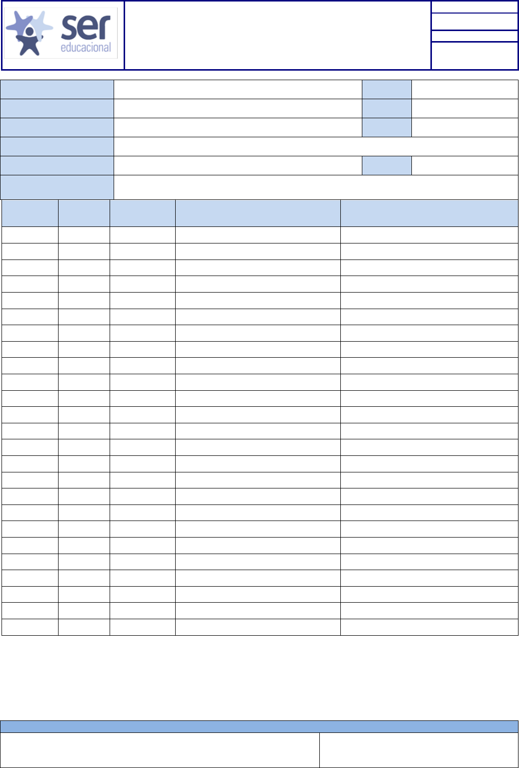 FICHA DE FREQUÊNCIA INDIVIDUAL DE ESTÁGIO SUPERVISIONADO - LICENCIATURAS Número: GES-FOR Aprovação: GERÊNCIA DE ESTÁGIO REVISÃO:00 OBSERVAÇÕES: 1. Esta avaliação será válida apenas com assinatura e carimbo do (a) professor supervisor(a) e ou gestor(a), não sendo permitido rasuras ou uso de corretivo. 2. Obrigatória a assinatura ou rubrica do (a) aluno (a) nesta ficha de frequência. 1/1 Nome do Aluno: Matrícula: Disciplina: Curso: Período: Turma: Professor Supervisor: Escola Concedente: Setor: Período do Estágio: / / A / / Data Hora de Entrada Hora de Saída Descrição da atividade Assinatura do (a) Professor Supervisor da escola / : : / : : / : : / : : / : : / : : / : : / : : / : : / : : / : : / : : / : : / : : / : : / : : / : : / : : / : : / : : / : : / : : / : : / : : / : : _________________________________ Assinatura do Professor Supervisor(a) da escola _______________________________ Assinatura do Aluno