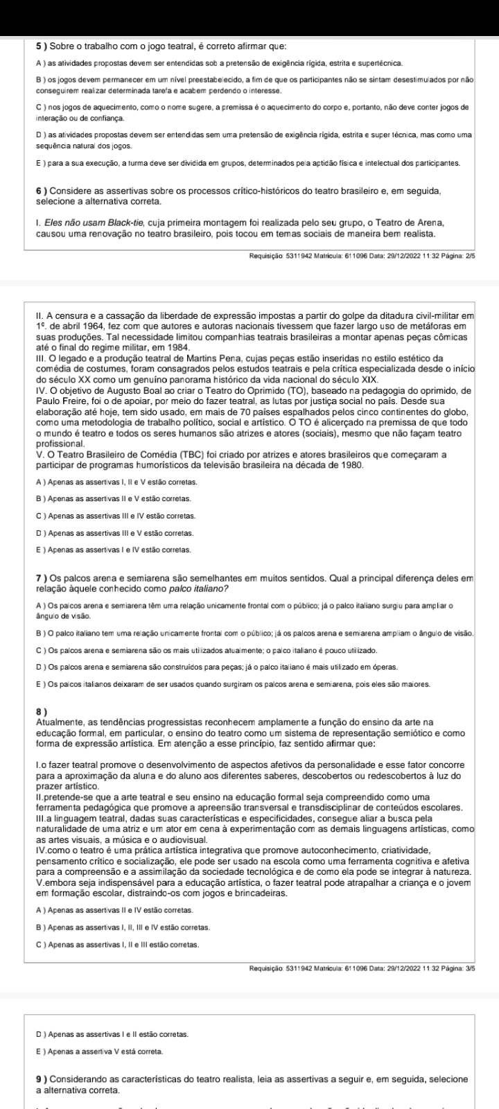 Atualmente, as tendências progressistas reconhecem amplamente a função do ensino da arte na educação formal, em particular, ensino do teatro como um sistema de representação semiótico e como forma de expressão. Em atenção a esse faz sentido afirmar que: I. fazer teatral promove o desenvolvimento de aspectos afetivos da personalidade e esse fator concorre para a aproximação da aluna e do aluno aos diferentes saberes, descobertos ou redescobertos à luz do prazer que a arte teatral e seu ensino na educação formal seja compreendido como uma que promove a apreensão transversal e transdisciplinar de conteúdos escolares. II. linguagem teatral, dadas suas características e especificidades, consegue aliar a busca pela naturalidade de uma atriz e um ator em cena à experimentação com as demais linguagens como as artes visuais. III. como teatro é uma prática artística integrativa que promove pensamento crítico e socialização, ele pode ser usado na escola como uma ferramenta cognitiva e afetiva para a compreensão e a assimilação da sociedade tecnológica e de como ela pode se integrar à. IV. embora seja indispensável para a educação fazer teatral pode atrapalhar a criança e jovem em formação escolar, distraindo-os com jogos e. A) Apenas as assertivas II e IV estão B) Apenas as assertivas I, III e IV estão C) Apenas as assertivas I e III estão D) Apenas as assertivas I e II estão E) Apenas a assertiva está correta.