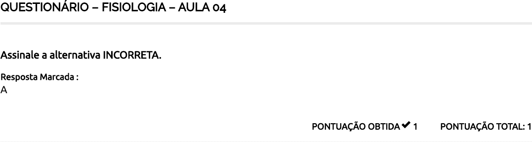 02/01/2023 12:23 Course Status – AVA Saúde Unifaveni https://ava.saude.unifaveni.com.br/course-status/ 1/4 QUESTIONÁRIO – FISIOLOGIA – AULA 04 PONTUAÇÃO TOTAL: 1PONTUAÇÃO OBTIDA 1 Assinale a alternativa INCORRETA. Resposta Marcada : A difusão facilitada utiliza proteínas carreadoras para o transporte através de membrana, constituindo, por essa razão, um processo de transporte ativo. 02/01/2023 12:23 Course Status – AVA Saúde Unifaveni https://ava.saude.unifaveni.com.br/course-status/ 2/4 Dentre os vários mecanismos de transporte em nível de membrana celular, podemos citar a osmose. De maneira simpli�cada, a �gura esquematiza as condições para a ocorrência da osmose. Com relação a esse processo, marque a alternativa correta: 02/01/2023 12:23 Course Status – AVA Saúde Unifaveni https://ava.saude.unifaveni.com.br/course-status/ 3/4 PONTUAÇÃO TOTAL: 1PONTUAÇÃO OBTIDA 1 Resposta Marcada : Passagem de solvente do meio menos concentrado para o meio mais concentrado. A proteína descrita assinalada na �gura faz parte do sistema de transporte de substância através da membrana sem gasto de energia. Assinale a alternativa que representa esse transporte: 02/01/2023 12:23 Course Status – AVA Saúde Unifaveni https://ava.saude.unifaveni.com.br/course-status/ 4/4 5 / 5 PONTUAÇÃO TOTAL: 1PONTUAÇÃO OBTIDA 1 Resposta Marcada : Difusão facilitada. PONTUAÇÃO TOTAL: 1PONTUAÇÃO OBTIDA 1 Um cotransportador é uma proteína que move mais de uma molécula simultaneamente. Se as moléculas são movidas na mesma direção, os cotransportadores são chamados de carreadores de ___________ . Resposta Marcada : Simporte. PONTUAÇÃO TOTAL: 1PONTUAÇÃO OBTIDA 1 A água é considerada o principal solvente do nosso organismo. Geralmente, ela se move de um meio a outro por osmose. Se ela passar de um meio a outro por osmose, ela irá se mover do compartimento ________ concentrado para o compartimento _________ concentrado. Esse processo será ___________ gasto de energia. Resposta Marcada : Menos / mais / sem. Total de Pontos