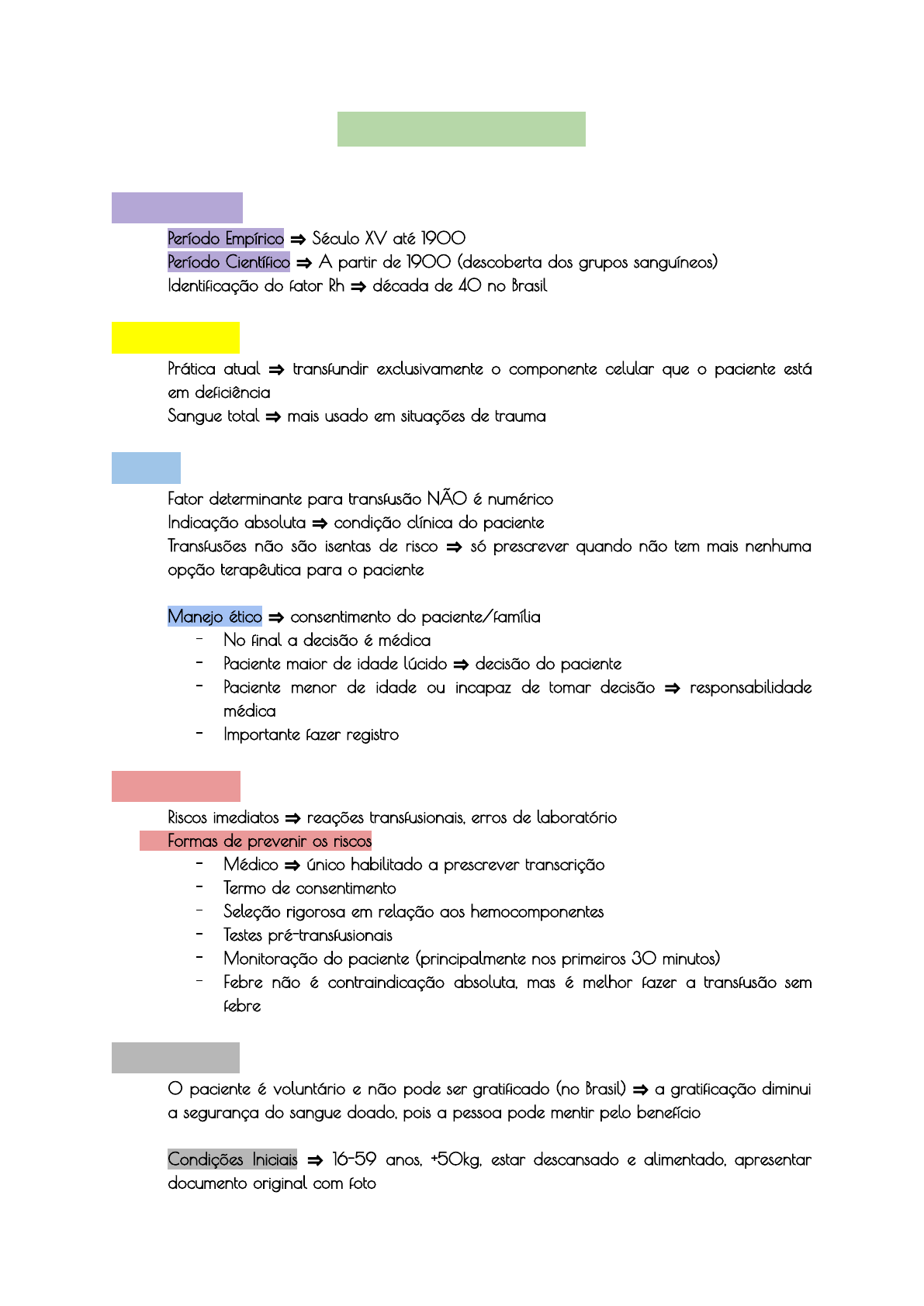 Trans�sã� Sanguíne� contexto histórico ● Período Empírico ⇒ Século XV até 1900 ● Período Científico ⇒ A partir de 1900 (descoberta dos grupos sanguíneos) ● Identificação do fator Rh ⇒ década de 40 no Brasil ato transfusional ● Prática atual ⇒ transfundir exclusivamente o componente celular que o paciente está em deficiência ● Sangue total ⇒ mais usado em situações de trauma indicação ● Fator determinante para transfusão NÃO é numérico ● Indicação absoluta ⇒ condição clínica do paciente ● Transfusões não são isentas de risco ⇒ só prescrever quando não tem mais nenhuma opção terapêutica para o paciente ● Manejo ético ⇒ consentimento do paciente/família - No final a decisão é médica - Paciente maior de idade lúcido ⇒ decisão do paciente - Paciente menor de idade ou incapaz de tomar decisão ⇒ responsabilidade médica - Importante fazer registro benefícios x riscos ● Riscos imediatos ⇒ reações transfusionais, erros de laboratório ● Formas de prevenir os riscos - Médico ⇒ único habilitado a prescrever transcrição - Termo de consentimento - Seleção rigorosa em relação aos hemocomponentes - Testes pré-transfusionais - Monitoração do paciente (principalmente nos primeiros 30 minutos) - Febre não é contraindicação absoluta, mas é melhor fazer a transfusão sem febre doação sanguínea ● O paciente é voluntário e não pode ser gratificado (no Brasil) ⇒ a gratificação diminui a segurança do sangue doado, pois a pessoa pode mentir pelo benefício ● Condições Iniciais ⇒ 16-59 anos, +50kg, estar descansado e alimentado, apresentar documento original com foto - Homens podem doar a cada 60 dias ou 4x ao ano - Mulheres: a cada 90 dias ou 3x ao ano ● Inaptidão Definitiva ⇒ hepatite, quimioterapia, etc. ● Inaptidão temporária ⇒ gestante, algumas medicações ● Bancos privados podem cobrar reposição de quem utilizou etapas do ciclo do sangue ● Cadastro ● Triagem (perguntas e sinais vitais) ● Coleta ⇒ agulha de grosso calibre - Coleta simples (tira o sangue total) - Aférese (seleciona só um componente, o sangue sai por um acesso e retorna para o paciente em outro) → limitação: custo 1. O doador pode doar mais vezes 2. Precisa ter plaqueta alta no hemograma 3. Também existe aférese terapêutica ● Processamento: o sangue coletado na bolsa é colocado na centrífuga (separa os elementos) - Em baixo ficam as hemácias, no meio a camada de leucócito (buffy coat) e acima o plasma rico em plaquetas ● Fracionamento (separa uma fração para os testes) - Concentrado de hemácias ⇒ pronto para ser utilizado ou congelado 1. Do plasma congelado pode ser tirado o crioprecipitado (concentrado de albumina, globulina e fatores de coagulação) - Parte rica em plaquetas ⇒ pode ser fracionado novamente ● Testes sorológicos e imunohematológicos ● Armazenamento ● Transfusão hemocomponentes ● Hemácias: podem ser transfundidas até 4 horas (após o concentrado estar conectado) ● Plasma: 1 hora (depois as plaquetas agregam) ● compatibilidade sanguínea ● Antígenos ABO e Rh (principais) ● Existem mais de 300 antígenos ● A tipagem sanguínea precisa ser feita toda vez que o paciente precisa de transfusão concentrado de hemácias (ch) ● Eritrócitos que permanecem na bolsa apó a centrifugação ● Transfusão de hemácias: prevenção de hipóxia (anemias agudas hipovolêmicas, anemias hemolíticas crônicas, insuficiência renal, câncer) ● Anemia aguda hipovolêmica - Tabela de Baskett ⇒ transfusão recomendada em perdas entre 25 e 30% (estimativa baseada em sinais clínicos) 1. Pressão arterial: marcador de choque hipovolêmico, só fica baixa no choque grau 3 (pode ser tarde) 2. Parâmetros para transfusão: taquicardia, retardo de enchimento capilar., redução do fluxo urinário, alteração do estado mental - O hematócrito pode demorar para cair ● Anemias Normovolêmicas - Limite de tolerância varia (crianças toleram mais, anemias de instalação crônica também apresentam tolerância maior) ● Existem algoritmos para transfusão, mas os dados clínicos que definem - Nunca transfundir com Hb acima de 10 - Entre 8 e 10: só transfundir se tiver instabilidade hemodinâmica ● Anemias Normovolêmicas- Situações Especiais - Transfundir com Hb entre 7-10 ⇒ pós-operatório (não deixar Hb menor que 8), cardiopatia isquêmica aguda, +65 anos (não deixar Hb menor que 9), choque séptico, urêmicos (Hb menor que 10) - Não transfundir: anemia por perda crônica compensada (ex: alguns casos de anemia ferropriva), anemia por insuficiência renal (usar EPO), anemia hemolítica hereditária (Hb basal já é baixo), anemia hemolítica autoimune, profilaticamente, como expansor de volume vascular ● Dose: 1 unidade EV em 2 horas - No adulto, cada unidade eleva a Hb em 1-2d/dL (paciente com 70kg) ● Criança: dose de 10-15 mL-kg ⇒ aumenta Hb em 2-3mg/dL ● Controle de Hemoglobina: 1 hora após cada transfusão ● Componentes de concentrado de hemácias - FIltrados: pode ser filtrado no laboratório (mais efetivo), banco de sangue ou na beira de leito. Retirar leucócitos para prevenir reações alérgica e transmissão de infecções (ex: citomegalovírus) 1. Indicado para imunossuprimidos - Lavados: leucócitos retirados e o plasma previne reações alérgicas graves - Irradiados: situações de transplante, quimioterapia, prematuros - Fenotipados: pesquisa de antígenos eritrocitários estendida (sangue super compatível com o doador) 1. mais usado em pacientes que recebem sangue com frequência concentrado de plaquetas ● Plaquetas randômicas: advindas do sangue total ⇒ 1 sangue total dá 1 unidade de plaqueta randômica ⇒ para transfundir é 1 unidade a cada 10kg ● Plaquetas por aférese - A quantidade de 1 doador de aférese equivale de 6 a 8 unidades de plaqueta randômica - Crianças: 10 mL/kg ● Indicaç