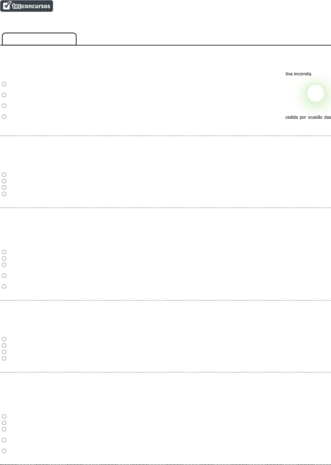 Resolvidas: Direito Constitucional para Oficial do Ministério Público (MPE MG) 2023 ( https://www.tecconcursos.com.br/s/Q2ScTf ) Ordenação: Por Matéria Direito Constitucional Questão 1: IBFC - Tec (DETRAN AM)/DETRAN AM/Administrativo/2022 Assunto: Direito Constitucional: conceito e fontes. Estado, povo, território etc O Estado é constituído de três elementos originários e indissociáveis: o povo, o território e o governo soberano. Sobre este tema, assinale a alternativa incorreta. a) O povo caracteriza-se como o elemento soberano do Estado b) O território caracteriza-se pela base física do Estado c) O governo é soberano no elemento condutor do Estado d) O governo exerce o poder absoluto de autodeterminação e auto-organização emanado do povo, mediante a delegação de poderes concedida por ocasião das eleições Esta questão possui comentário do professor no site. www.tecconcursos.com.br/questoes/2074138 Questão 2: CEV UECE - GCM (Pref Sobral)/Pref Sobral/2022 Assunto: Direito Constitucional: conceito e fontes. Estado, povo, território etc Os elementos fundamentais do Estado são a) as administrações direta e indireta. b) povo, território e governo. c) os poderes independentes e harmônicos. d) soberania, autonomia e independência. Esta questão possui comentário do professor no site. www.tecconcursos.com.br/questoes/1960573 Questão 3: CONSULPLAN - AJ TRE RS/TRE RS/Administrativa/2008 Assunto: Eficácia das Normas Constitucionais “As normas constitucionais de ____________________________ têm aplicabilidade direta e imediata, mas possivelmente não integral.” Assinale a alternativa que completa corretamente a afirmativa anterior: a) eficácia plena. b) eficácia contida ou prospectiva. c) eficácia limitada. d) eficácia exaurida. e) eficácia absoluta. Esta questão possui comentário do professor no site. www.tecconcursos.com.br/questoes/304937 Questão 4: CONSULPLAN - Adm (Pref Sabará)/Pref Sabará/2017 Assunto: Dos Princípios Fundamentais da Constituição (arts. 1º a 4º da CF/1988) Em relação aos princípios fundamentais da República Federativa do Brasil, previstos na Constituição Federal, é correto afirmar que a) nas relações internacionais é prescindível a defesa da paz. b) o fundamento da soberania prevalece sobre o da cidadania. c) é objetivo fundamental a erradicação das desigualdades regionais. d) construir uma sociedade livre, justa e solidária é um objetivo fundamental. Esta questão possui comentário do professor no site. www.tecconcursos.com.br/questoes/679281 Questão 5: CONSULPLAN - Moto (Cascavel)/Pref Cascavel/2016 Assunto: Dos Princípios Fundamentais da Constituição (arts. 1º a 4º da CF/1988) São fundamentos da República Federativa do Brasil, formada pela união indissolúvel dos Estados e Municípios e do Distrito Federal, constituindo-se em Estado Democrático de Direito, com EXCEÇÃO: a) Da cidadania. b) Da soberania. c) Do partidarismo político. d) Da dignidade da pessoa humana. e) Dos valores sociais do trabalho e da livre iniciativa. Esta questão possui comentário do professor no site. www.tecconcursos.com.br/questoes/382070 Questão 6: Instituto Consulplan - Cuid (Pref Caeté)/Pref Caeté/2022 Assunto: Dos Direitos e Deveres Individuais e Coletivos (art. 5º da CF/1988) Considerando os direitos individuais e coletivos estabelecidos em Lei, assinale a afirmativa correta. a) A manifestação do pensamento é livre, assim como o anonimato. b) Nenhuma Lei pode obrigar ninguém a fazer ou deixar de fazer alguma coisa. c) Não são asseguradas condições para que as mulheres presas possam permanecer com seus filhos durante o período de amamentação. d) É assegurado a todos a obtenção de certidões em repartições públicas para defesa de direitos e esclarecimento de situações de interesse pessoal, independente do pagamento de taxas. Esta questão possui comentário do professor no site. www.tecconcursos.com.br/questoes/2118062 Questão 7: VUNESP - GCM (P Itanhaém)/Pref Itanhaém/2019 Assunto: Dos Direitos e Deveres Individuais e Coletivos (art. 5º da CF/1988) É correto afirmar que a Constituição Federal assegura a) o direito de cumprir a pena em estabelecimentos prisionais sediados a, no máximo, cem quilômetros de seu domicílio. b) que nenhum brasileiro será extraditado, mesmo aquele naturalizado, em caso de crime comum, praticado antes da naturalização. c) que será concedida extradição de estrangeiro por crime político ou de opinião. d) que a pena será cumprida em estabelecimentos distintos, de acordo com o idioma, a raça, a idade e o sexo do apenado. e) às presidiárias condições para que possam permanecer com seus filhos durante o período de amamentação. Esta questão possui comentário do professor no site. www.tecconcursos.com.br/questoes/1422826 Questão 8: CONSULPLAN - TJ TRE MG/TRE MG/Administrativa/"Sem Especialidade"/2015 Assunto: Dos Direitos e Deveres Individuais e Coletivos (art. 5º da CF/1988) “Mercedes é cidadã da Moldávia e está em trânsito pelo Brasil, tendo ficado retida no aeroporto internacional sediado no município Y, sem data provável de liberação para o seu destino final. Dada a sua condição de estrangeira, o serviço local suscita dúvidas quanto à aplicabilidade dos direitos fundamentais à sua situação.” Nos termos da Constituição Federal, os direitos e garantias fundamentais são garantidos quanto à sua inviolabilidade expressamente aos estrangeiros a) visitantes do Brasil. b) residentes no Brasil. c) investidores no Brasil. d) em missão eventual no Brasil. Esta questão possui comentário do professor no site. www.tecconcursos.com.br/questoes/296186 Questão 9: CONSULPLAN - Estag (TRT 13)/TRT 13/Direito/2012 Assunto: Dos Direitos e Deveres Individuais e Coletivos (art. 5º da CF/1988) Descreve o Art. 5º da Constituição Federal de 1988 (CF/88) que “todos são iguais perante a lei, sem distinção de qualquer natureza,