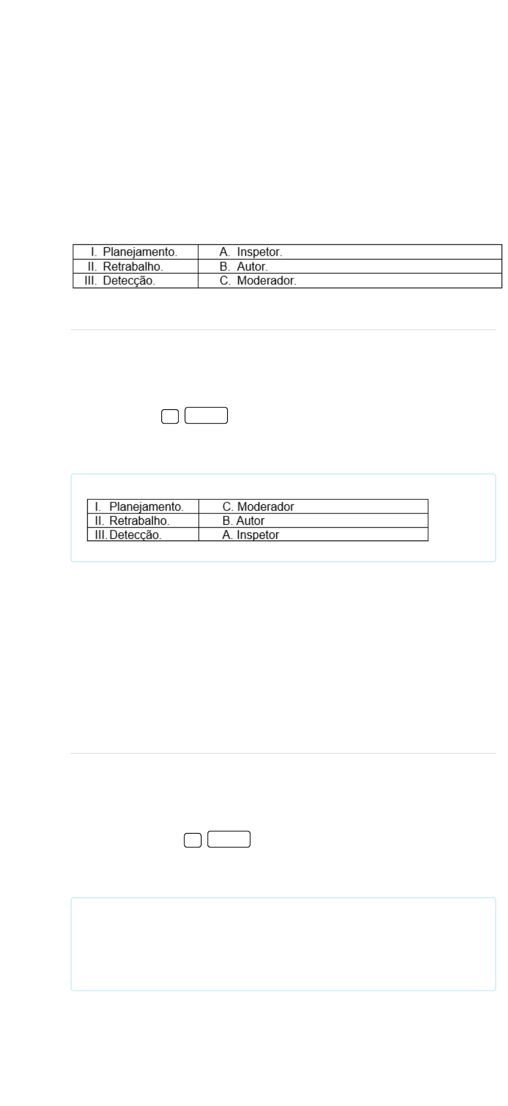 Teste e inspeção de software: técnicas e automatização Professor(a): Stella Marys Dornelas Lamounier (Mestrado acadêmico) 1) 2) Prepare-se! Chegou a hora de você testar o conhecimento adquirido nesta disciplina. A Avaliação Virtual (AV) é composta por questões objetivas e corresponde a 100% da média final. Você tem até cinco tentativas para “Enviar” as questões, que são automaticamente corrigidas. Você pode responder as questões consultando o material de estudos, mas lembre-se de cumprir o prazo estabelecido. Boa prova! Durante as etapas de inspeção de software, são necessários vários papéis para a sua concepção, tendo cada um uma finalidade. Leia e associe as duas colunas conforme o papel de cada profissional nas etapas de inspeção de software. Assinale a alternativa que traz a associação correta entre as duas colunas: Alternativas: I – C; II – A; III – B. I – A; II – C; III – B. I – C; II – B; III – A. CORRETO I – B; II – A; III – C. I – B; II – C; III – A. Código da questão: 64228 Teste funcional ou de caixa preta é uma técnica muito comum aplicada em testes de software. Sua funcionalidade é testar se os requisitos do sistema foram atingidos. Nesse modelo, podemos destacar a técnica de valor limite. Em um sistema computacional, a tela de cadastro possui como campo de entrada de dados a data de nascimento, que aceita valores de ano de nascimento de 1990 a 2021. Nesse caso, usando a técnica de valor limite, assinale a alternativa com os valores que o testador usaria. Alternativas: 0, 1998, 1999, 2021. 1989, 0, 2020, 2021. 1989, 1990, 2020, 2021. CORRETO 1989, 1991, 2021, 0. 1989, 1990, 2020, 0. Código da questão: 64223 Resolução comentada: Resolução comentada: A técnica de análise de valor limite faz uso dos valores: mínimo inválido, mínimo válido, máximo válido e máximo inválido, onde 1989 é o valor mínimo inválido, 1990 o valor mínimo válido, 2020 o valor máximo válido e 2021 o valor máximo inválido. 3) 4) 5) Dentre inúmeras técnicas utilizadas para diagnosticar possíveis erros em um software, algumas se destacam por sua facilidade de uso, já que algumas delas podem ser utilizadas de forma manual. Leia e associe as duas colunas conforme os métodos utilizados em técnicas de testes de software. Assinale a alternativa que traz a associação correta entre as duas colunas: Alternativas: I – B; II – C; III – A. I – C; II – B; III – A. CORRETO I – C; II – A; III – B. I – A; II – C; III – B. I – B; II – A; III – C. Código da questão: 64221 Há uma técnica muito importante para a detecção de erros de forma rigorosa e precisa. Ela verifica e revisa os artefatos de softwares de modo que seja melhorada a produtividade do sistema, pois estes erros são encontrados nestes artefatos que muitas vezes estão isolados. Essa técnica é conhecida como: Alternativas: Inspeção de software. CORRETO Qualificação de software. Validação de software. Testes de software. Verificação de software. Código da questão: 64216 Testes automatizados são amplamente utilizados em empresas de desenvolvimento por trazerem agilidade e facilidade a partir de sua execução. Estas empresas têm adotado também ferramentas de automação que utilizam técnicas de DSL. Assinale a alternativa que demonstra corretamente a principal característica de uma DSL. Resolução comentada: Técnicas de testes de software devem englobar tanto a parte externa de um sistema quanto a parte interna (código fonte). Além disso, não se pode, jamais, esquecer-se da utilização de ferramentas que auxiliam o testador a ter uma maior e melhor organização dos itens testados. Resolução comentada: A técnica de inspeção de software é utilizada para verificar os artefatos de software, seja em um código fonte, seja na sua própria documentação. Sua responsabilidade é manter a qualidade do sistema a fim de estar de acordo com o que o cliente realmente necessita. 6) 7) Alternativas: Tem baixo nível de abstração. Oferece tradução de códigos mais complexos. Tem alto nível de abstração. Tem somente versões gratuitas. Apresenta linguagem de fácil interpretação para o usuário. CORRETO Código da questão: 64238 Sobre inspeção de software em seu contexto amplo, analise as afirmativas a seguir e assinale-as com V (verdadeiro) ou F (falso): ( ) Os checklists são amplamente utilizados em empresas de desenvolvimento por apresentarem uma abordagem simples, mas que auxilia o revisor a detectar erros a partir de questões precisas. ( ) A metodologia Ágil tem como característica a flexibilidade com relação à utilização de requisitos, isto é, sempre que possível, eles podem ser reavaliados para uma correção mais precisa e eficiente. ( ) Os modelos tradicionais de processos de software não são mais utilizados nos tempos de hoje por terem se tornado obsoletos, e por isso nenhuma empresa mais utiliza esses ciclos de desenvolvimento. ( ) O Scrum é um framework das metodologias tradicionais de desenvolvimento de software. ( ) A técnica de inspeção ad-hoc é marcada especialmente pela informalidade para inspeção de artefatos. Assinale a alternativa que contenha a sequência correta de V e F: Alternativas: V – V – F – F – V. CORRETO F – V – F – V – F. V – F – F – V – F. F – V – V – V – V. F – V – V – V – F. Código da questão: 64227 Testes automatizados foram criados para aumentar a qualidade do software; são dotados de ferramentas e de frameworks que podem substituir, em algumas atividades, os testes manuais. Assinale a alternativa que apresenta uma característica de testes automatizados: Alternativas: Têm baixo investimento. Menor confiabilidade. Resolução comentada: A DSL, ou linguagem específica de domínio, permite ao usuário interagir com o sistema e seus termos. Não utiliza apenas linguagem de programação, o que facilita muit