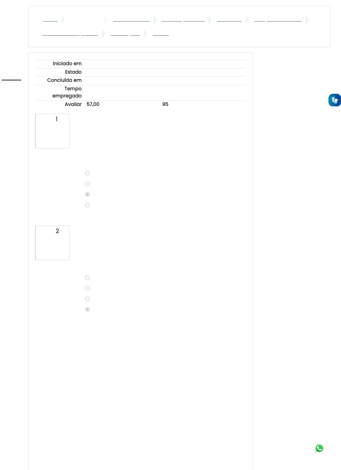 Painel Meus cursos CURSOS FUNEC Graduação - EAD Aluno EAD JUNÇÕES DE TURMA Física Geral e Aplicada AVALIAÇÕES PROVA Questão 1 Completo Atingiu 3,00 de 3,00 Questão 2 Completo Atingiu 3,00 de 3,00 Iniciado em Wednesday, 8 Sep 2021, 14:24 Estado Finalizada Concluída em Wednesday, 8 Sep 2021, 16:06 Tempo empregado 1 hora 41 minutos Avaliar 57,00 de um máximo de 60,00(95%) Uma bola é lançada verticalmente para cima a partir do solo. A altura máxima atingida nesse lançamento é de 50 metros. Nessas circunstâncias é correto afirmar que a velocidade de lançamento e o tempo de permanência da bola no ar são aproximadamente: (considere g = 10 m/s²) Escolha uma opção: a. V = 50 m/s e t = 10 s b. V = 31,62 m/s e t = 3,16 s c. V = 31,62 m/s e t = 6,3 s d. V = 50 m/s e t = 5 s O projetil de um canhão de defesa de massa de 10 kg, é lançada com velocidade de 1080 km/h. se o ângulo de lançamento for de 15º o alcance máximo será: (use g = 10 m/s²) Escolha uma opção: a. 2,5 km b. 3,5 km c. 5,5 km d. 4,5 km https://ava.funec.br/my/ https://ava.funec.br/course/index.php?categoryid=10 https://ava.funec.br/course/index.php?categoryid=17 https://ava.funec.br/course/index.php?categoryid=19 https://ava.funec.br/course/index.php?categoryid=77 https://ava.funec.br/course/view.php?id=447 https://ava.funec.br/course/view.php?id=447#section-5 https://ava.funec.br/mod/quiz/view.php?id=4752 javascript:void(0); https://ava.funec.br/user/index.php?id=447 https://ava.funec.br/badges/view.php?type=2&id=447 https://ava.funec.br/admin/tool/lp/coursecompetencies.php?courseid=447 https://ava.funec.br/grade/report/index.php?id=447 https://ava.funec.br/my/ https://ava.funec.br/?redirect=0 https://ava.funec.br/calendar/view.php?view=month&course=447 javascript:void(0); https://ava.funec.br/user/files.php https://ava.funec.br/course/view.php?id=374 https://ava.funec.br/course/view.php?id=870 https://ava.funec.br/course/view.php?id=757 https://ava.funec.br/course/view.php?id=356 https://ava.funec.br/course/view.php?id=461 https://ava.funec.br/course/view.php?id=954 https://ava.funec.br/course/view.php?id=322 https://ava.funec.br/course/view.php?id=369 https://ava.funec.br/course/view.php?id=366 https://ava.funec.br/course/view.php?id=865 https://ava.funec.br/my/ Questão 3 Completo Atingiu 3,00 de 3,00 Questão 4 Completo Atingiu 3,00 de 3,00 A figura abaixo representa a reposição de uma bola em uma partida de futebol. A trajetória da bola que vai das mãos do goleiro até a posição de 60 metros, leva o tempo de 4 segundos. Desprezando a resistência do ar, podemos concluir que os módulos da velocidade V, de lançamento, e da velocidade V , na altura máxima, são, em metros por segundos, iguais a, respectivamente: (Dados: senβ = 0,8; cosβ = 0,6.) Escolha uma opção: a. 25 e 25. b. 15 e 50. c. 15 e 25. d. 25 e 15. H O gráfico abaixo representa o movimento de um automóvel que se desloca em linha reta, partindo de uma posição inicial zero. A função que indica o deslocamento do carro em relação ao tempo t é: Escolha uma opção: a. X = 5t − 0,55t b. X = 20t −1,25t c. X = 5t + 0,625t d. X = 20t + 2,5t 2 2 2 2 javascript:void(0); https://ava.funec.br/user/index.php?id=447 https://ava.funec.br/badges/view.php?type=2&id=447 https://ava.funec.br/admin/tool/lp/coursecompetencies.php?courseid=447 https://ava.funec.br/grade/report/index.php?id=447 https://ava.funec.br/my/ https://ava.funec.br/?redirect=0 https://ava.funec.br/calendar/view.php?view=month&course=447 javascript:void(0); https://ava.funec.br/user/files.php https://ava.funec.br/course/view.php?id=374 https://ava.funec.br/course/view.php?id=870 https://ava.funec.br/course/view.php?id=757 https://ava.funec.br/course/view.php?id=356 https://ava.funec.br/course/view.php?id=461 https://ava.funec.br/course/view.php?id=954 https://ava.funec.br/course/view.php?id=322 https://ava.funec.br/course/view.php?id=369 https://ava.funec.br/course/view.php?id=366 https://ava.funec.br/course/view.php?id=865 https://ava.funec.br/my/ Questão 5 Completo Atingiu 3,00 de 3,00 Questão 6 Completo Atingiu 3,00 de 3,00 Questão 7 Completo Atingiu 3,00 de 3,00 Uma composição ferroviária de 9 vagões e uma locomotiva, devem atravessar uma ponte de 150 m de extensão. Sabendo que a velocidade dessa composição é constante e igual a 36 km/h e que cada elemento da composição mede 10 metros. Podemos a firmar que o tempo necessário para que a composição atravesse completamente a ponte é: Escolha uma opção: a. 10 b. 20 c. 25 d. 15 Sobre lançamento em duas dimensões é INCORRETO afirmar que: Escolha uma opção: a. O ângulo que fornecerá o maior alcance horizontal possível é o de 45°. b. Ao chegar na altura máxima a componente vertical da velocidade do móvel é máxima. c. Ao chegar na altura máxima a componente vertical da velocidade do móvel é nula. d. A componente horizontal da velocidade mantém-se inalterada, uma vez que no eixo x o movimento é classificado como retilíneo e uniforme. Dois blocos A e B de massas m = 3 kg e m = 2 kg, formam o sistema mostrado na figura. O cabo que une os dois blocos possui massa desprezível. O sistema se mantem estático devido ao atrito entre as superfícies do bloco A e o solo. Nestas condições é correto afirmar que o coeficiente de atrito entre as superfícies é: Escolha uma opção: a. b. c. d. A B μ = 2 3 μ = 3 2 μ = 0, 5 μ = 1 javascript:void(0); https://ava.funec.br/user/index.php?id=447 https://ava.funec.br/badges/view.php?type=2&id=447 https://ava.funec.br/admin/tool/lp/coursecompetencies.php?courseid=447 https://ava.funec.br/grade/report/index.php?id=447 https://ava.funec.br/my/ https://ava.funec.br/?redirect=0 https://ava.funec.br/calendar/view.php?view=month&course=447 javascript:void(0); https://ava.funec.br/user/files.php https://ava.funec.br/course/view.php?id=374 https://ava.funec.br/course/view.php?id=870 https://ava.funec.br/course/view.php?id=757 https://ava.funec.br/cou