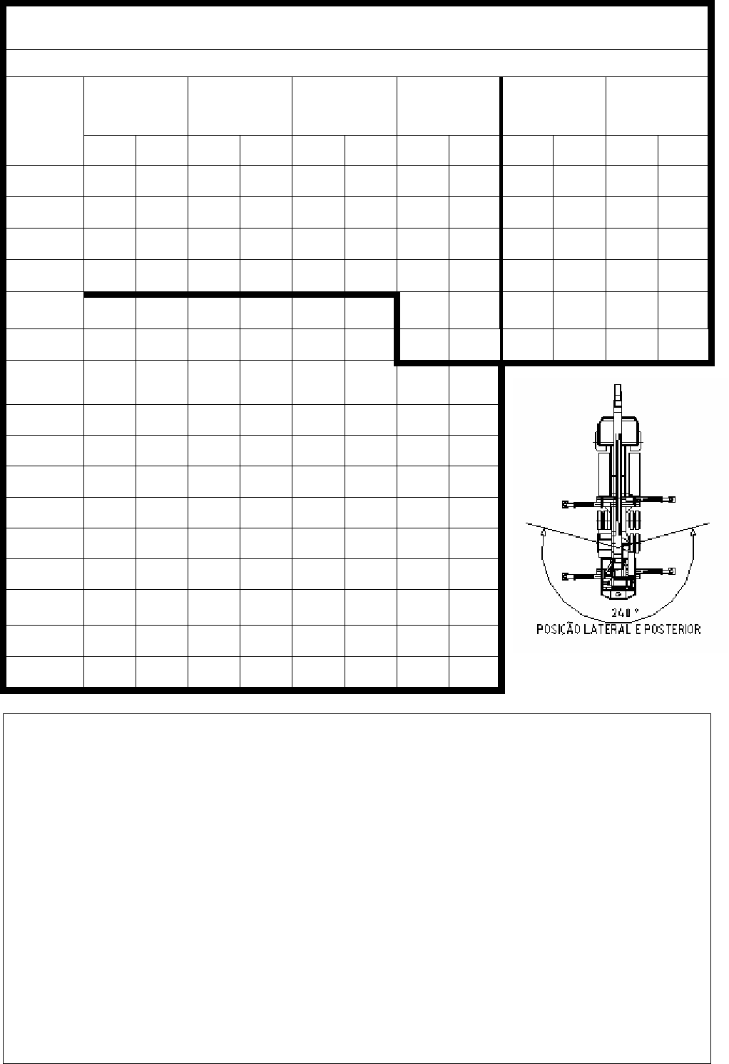 TABELA DE CARGAS E ALCANCES DO IMK 30.5 E SAPATAS COM EXTENSÃO MÁXIMA (POSIÇÃO LATERAL E POSTERIOR) PRINCIPAL 1°°°° Estagio CURSO I 2°°°° Estagio ½ CURSO PARCIAL II - III 3°°°° Estagio* CURSO TOTAL II - III 4°°°° Estagio** 1°°°° Jib 2°°°° Jib Angulo (graus) Raio (m) Carga Ton Raio (m) Carga Ton Raio (m) Carga Ton Raio (m) Carga Ton Raio (m) Carga Ton Raio (m) Carga Ton 75°°°° 1.76 30.5 3.57 19.21 5.37 6.38 7.17 6.18 10.22 2.64 11.92 0.47 70°°°° 2.64 30.5 5.04 13.36 7.42 6.62 9.80 4.46 13.51 1.99 15.76 0.48 65°°°° 3.50 28.78 6.46 10.47 9.40 5.82 12.35 3.43 16.69 1.31 19.47 0.42 60°°°° 4.33 23.33 7.83 8.38 11.30 4.64 14.79 2.80 19.75 0.93 23.04 0.37 55°°°° 5.12 17.86 9.13 6.58 13.12 3.53 17.12 2.36 22.66 0.81 26.43 0.34 50°°°° 5.85 14.00 10.36 5.12 14.82 2.68 19.31 1.98 25.40 0.64 29.62 0.30 45°°°° 6.54 11.61 11.49 4.06 16.40 2.10 21.34 1.64 40°°°° 7.17 10.06 12.53 3.35 17.85 1.70 23.20 1.33 35°°°° 7.74 8.89 13.47 2.88 19.16 1.41 24.88 1.07 30°°°° 8.24 7.96 14.30 2.52 20.32 1.16 26.36 0.85 25°°°° 8.67 7.26 15.01 2.23 21.31 0.94 27.63 0.69 20°°°° 9.02 6.73 15.60 2.00 22.13 0.78 28.69 0.58 15°°°° 9.30 6.33 16.07 1.83 22.78 0.67 29.52 0.49 10°°°° 9.50 6.13 16.40 1.74 23.24 0.62 30.12 0.44 05°°°° 9.62 5.98 16.60 1.71 23.52 0.60 30.47 0.40 00°°°° 9.67 5.93 16.67 1.70 23.60 0.60 30.60 0.39 * Estágio definido pela metade do curso da segunda e terceira lança sincronizadas. ** Estágio definido pelo curso completo da segunda e terceira lança sincronizadas. • Da linha em negrito para abaixo, as cargas estão limitadas pela estabilidade, devendo ser validade em função do PBT do veículo, após instalação. • Por medida de segurança as cargas limitadas pela linha de estabilidade devem ser içadas próximas ao chão para verificação da estabilidade. • Os valores de carga mostrados na tabela para ângulos inferiores a 30° são valores teóricos, não se aconselhando trabalhar nesta região devido aos grandes esforços gerados nos componentes da estrutura, alem de comprometer seriamente a estabilidade. • Jamais ultrapassar o limite de carga dos estágios telescópicos sob pena de danificar os mecanismos internos de cabo. • Jamais estender e/ou recolher as lanças com carga. • Equipamentos monitorados eletronicamente, deverão ter seus dados confrontados com as tabelas que acompanham o acompanham e aferidos quando necessário. TABELA DE CARGAS E ALCANCES DO IMK 30.5 E SAPATAS COM EXTENSÃO MÁXIMA (POSIÇÃO FRONTAL) PRINCIPAL 1°°°° Estagio CURSO I 2°°°° Estagio ½ CURSO PARCIAL II - III 3°°°° Estagio* CURSO TOTAL II - III 4°°°° Estagio** 1°°°° Jib 2°°°° Jib Ángulo (graus) Raio (m) Carga Ton Raio (m) Carga Ton Raio (m) Carga Ton Raio (m) Carga Ton Raio (m) Carga Ton Raio (m) Carga Ton 75°°°° 1.76 29.05 3.57 15.88 5.37 6.64 7.18 5.51 70°°°° 2.64 30.5 5.04 10.73 7.41 4.52 9.81 2.64 65°°°° 3.50 28.38 6.46 5.65 9.40 2.42 12.35 1.30 60°°°° 4.33 20.93 7.83 3.19 11.30 1.24 14.80 0.59 55°°°° 5.12 13.51 9.13 2.10 13.11 0.63 50°°°° 5.85 8.40 10.35 0.98 45°°°° 6.54 5.87 11.49 0.12 40°°°° 7.17 4.97 35°°°° 7.74 4.56 30°°°° 8.24 3.99 25°°°° 8.67 3.22 20°°°° 9.02 2.54 15°°°° 9.30 2.26 10°°°° 9.50 2.37 05°°°° 9.62 2.64 00°°°° 9.67 2.77 * Estágio definido pela metade do curso da segunda e terceira lança sincronizadas. ** Estágio definido pelo curso completo da segunda e terceira lança sincronizadas. • Da linha em negrito para abaixo, as cargas estão limitadas pela estabilidade, devendo ser validade em função do PBT do veículo, após instalação. • Por medida de segurança as cargas limitadas pela linha de estabilidade devem ser içadas próximas ao chão para verificação da estabilidade. • Os valores de carga mostrados na tabela para ângulos inferiores a 30° são valores teóricos, não se aconselhando trabalhar nesta região devido aos grandes esforços gerados nos componentes da estrutura, alem de comprometer seriamente a estabilidade. • Jamais ultrapassar o limite de carga dos estágios telescópicos sob pena de danificar os mecanismos internos de cabo. • Jamais estender e/ou recolher as lanças com carga. • Equipamentos monitorados eletronicamente, deverão ter seus dados confrontados com as tabelas que acompanham o acompanham e aferidos quando necessário.