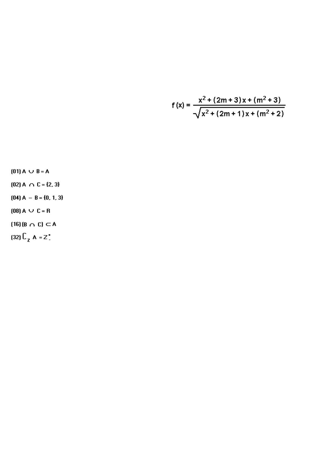 Exercícios de Matemática Equações de Segundo Grau TEXTO PARA A PRÓXIMA QUESTÃO (Ufba 96) Na(s) questão(ões) a seguir escreva nos parênteses a soma dos itens corretos. 1. Considerando-se os conjuntos A = { x Æ IN, x < 4 }, B = { x Æ Z, 2x + 3 = 7 }, C = { x Æ IR, x£ + 5x + 6 = 0 }, é verdade que: Soma ( ) 2. (Ita 2001) O conjunto de todos os valores de m para os quais a função está definida e é não-negativa para todo x real é: a) [1/4, 7/4[ b) ]1/4, ¶[ c) ]0, 7/4[ d) ]-¶, 1/4] e) ]1/4, 7/4[ 3. (Unitau 95) Qual é o valor da soma dos inversos dos quadrados das duas raízes da equação x£+x+1=0? 4. (Cesgranrio 95) A maior raiz da equação - 2x£+3x+5=0 vale: a) -1 b) 1 c) 2 d) 2,5 e) (3 + Ë19)/4 5. (Fuvest 96) Sejam x� e x‚ as raízes da equação 10x£+33x-7=0. O número inteiro mais próximo do número 5x�x‚+2(x�+x‚) é: a) - 33 b) - 10 c) - 7 d) 10 e) 33 6. (Ita 96) Seja ‘ um número real tal que ‘>2(1+Ë2) e considere a equação x£-‘x+‘+1=0. Sabendo que as raízes reais dessa equação são as cotangentes de dois dos ângulos internos de um triângulo, então o terceiro ângulo interno desse triângulo vale: a) 30° b) 45° c) 60° d) 135° e) 120° 7. (Ufpe 96) Se x é um número real positivo tal que ao adicionarmos 1 ao seu inverso obtemos como resultado o número x, qual é o valor de x? a) (1 - Ë5)/2 b) (1 + Ë5)/2 c) 1 d) (1 + Ë3)/2 e) (1 + Ë2)/2 8. (Puccamp 95) Considere as seguintes equações: I. x£ + 4 = 0 II. x£ - 2 = 0 III. 0,3x = 0,1 Sobre as soluções dessas equações é verdade que em a) II são números irracionais. b) III é número irracional. c) I e II são números reais. d) I e III são números não reais. e) II e III são números racionais. 9. (Uel 94) Os valores de m, para os quais a equação 3x£-mx+4=0 tem duas raízes reais iguais, são a) - Ë5 e 2Ë5 b) - 4Ë3 e 4Ë3 c) 3Ë2 e -3Ë2 d) 2 e 5 e) - 6 e 8 10. (Uel 96) Sabe-se que os números reais ‘ e ’ são raízes da equação x£-kx+6=0, na qual k Æ IR. A equação do 2° grau que admite as raízes ‘+1 e ’+1 é a) x£ + (k+2)x + (k+7) = 0 b) x£ - (k+2)x + (k+7) = 0 c) x£ + (k+2)x - (k+7) = 0 d) x£ - (k+1)x + 7 = 0 e) x£ + (k+1)x + 7 = 0 11. (Unesp 96) Seja "a" uma raiz da equação x£+2x+c£=0, em que c é um número real positivo. Se o discriminante dessa equação é menor que zero, então |a| é igual a a) c. b) 2c. c) c£. d) 2c£. e) c/2. 12. (Unesp 96) Para todo número real 'a', o número '- a' chama-se oposto de 'a' e para todo número real 'a', a·0, o número 1/a chama-se inverso de a. Assim sendo, determine todos os números reais x, x·1, tais que o inverso do oposto de (1-x) seja x+3. 13. (Unesp 96) Dada a equação x£ + x - Ë(2) = 0, calcule a soma dos inversos de suas raízes. 14. (Uece 96) Se x� e x‚ são as raízes da equação 3x£-2x-8=0, sendo x�<x‚, então 3x‚£-2x•-8 é igual a: a) 2/3 b) 8/3 c) 16/3 d) 20/3 15. (Mackenzie 96) Se A = {x Æ IR tal que (4 - x£) / (4 - 2Ñ) µ 0} e B = A º R_ , então os pontos (x, y) pertencentes a B x B definem no plano uma região de área: a) 1. b) 4. c) 9. d) 16. e) 25. Admin Nota None definida por Admin Admin Nota MigrationNone definida por Admin Admin Nota Unmarked definida por Admin Admin Nota None definida por Admin Admin Nota MigrationNone definida por Admin Admin Nota Unmarked definida por Admin 16. (Faap 96) Um reservatório de água está sendo esvaziado para limpeza. A quantidade de água no reservatório, em litros, t horas após o escoamento ter começado é dada por: V = 50 (80 - t)£ A quantidade de água que sai do reservatório nas 5 primeiras horas de escoamento é: a) 281.250 litros b) 32.350 litros c) 42.500 litros d) 38.750 litros e) 320.000 litros 17. (Ufpe 95) Se a equação y=Ë(2x£+px+32) define uma função real y=f(x) cujo domínio é o conjunto dos reais, encontre o maior valor que p pode assumir. 18. (Fei 96) A equação x£ - x + c = 0 possui duas raízes reais "r" e "s" tais que r=2s. Os valores de "r" e "s": a) 2/3 e 1/3 b) 2 e 1 c) -1/3 e -1/6 d) -2 e -1 e) 6 e 3 19. (Cesgranrio 90) Se a equação 10x£+ bx + 2 = 0 não tem raízes reais, então o coeficiente b satisfaz a condição: a) -4Ë5 < b < 4Ë5. b) b < 4Ë5. c) b > 4Ë5. d) 0 < b < 8Ë5. e) -8Ë5 < b < 0. 20. (Cesgranrio 90) Se x� e x‚ são as raízes de x£+57x-228 =0, então (1/x�)+(1/x‚) vale: a) - 1/4. b) 1/4. c) -1/2. d) 1/2. e) 1/6 ou -1/6. 21. (Cesgranrio 90) Se as raízes da equação x£ + bx + 27 = 0 são múltiplos positivos de 3, então o coeficiente b vale: a) 12. b) -12. c) 9. d) -9. e) 6. 22. (Mackenzie 97) Se x e y são números naturais tais que y=(x£+3)/(x+2), então x + y vale: a) 15 b) 10 c) 12 d) 9 e) 8 23. (Cesgranrio 90) Determine o parâmetro m na equação x£+mx+m£-m-12=0, de modo que ela tenha uma raíz nula e outra positiva. 24. (Unicamp 98) O índice I de massa corporal de uma pessoa adulta é dado pela fórmula: I = M/h£ onde M é a massa do corpo, dada em quilogramas, e h é a altura da pessoa, em metros. O índice I permite classificar uma pessoa adulta, de acordo com a seguinte tabela: a) Calcule o índice I para uma mulher cuja massa é de 64,0kg e cuja altura 1,60m. Classifique-a segundo a tabela anterior. b) Qual é a altura mínima para que o homem cuja massa é de 97,2kg não seja considerado obeso? Admin Nota None definida por Admin Admin Nota MigrationNone definida por Admin Admin Nota Unmarked definida por Admin Admin Nota None definida por Admin Admin Nota MigrationNone definida por Admin Admin Nota Unmarked definida por Admin 25. (Fatec 98) Sejam VÛ o conjunto verdade da equação Ë(x+8).Ë(x+3)=6 e V½ o conjunto verdade da equação Ë[(x+8).(x+3)]=6 no conjunto universo U=IR. Sobre as sentenças I. VÛ = V½ II. VÛ Å V½ III. -12 È VÛ; 1 Æ VÛ º V½; -12 Æ V½ é verdade que a) somente a I é falsa. b) somente a II é falsa. c) somente a III é falsa. d) todas são verdadeiras. e) todas são falsas. 26. (Fatec 