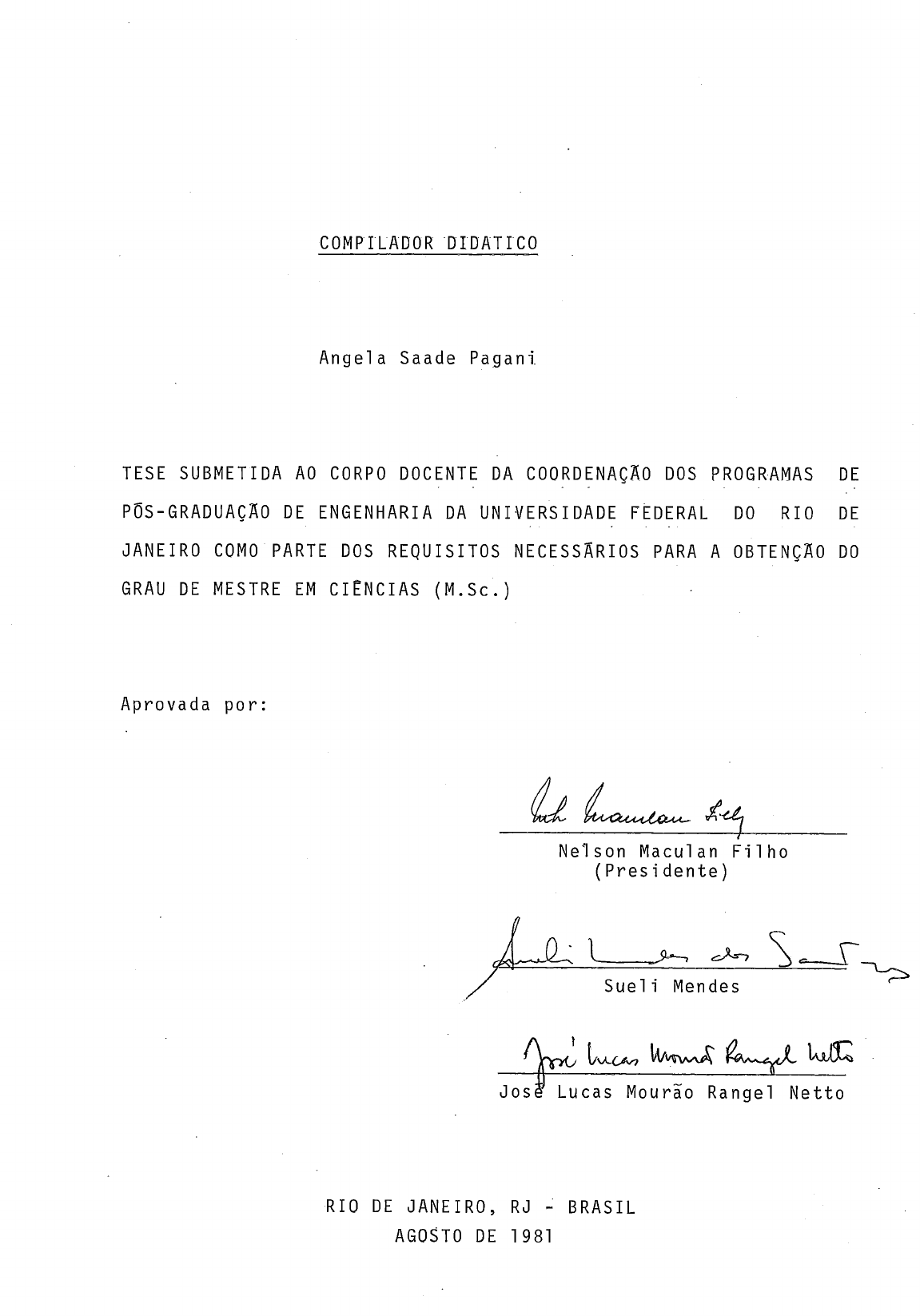 COMPILADOR DIDATICO Angela Saade Pagani TESE SUBMETIDA AO CORPO DOCENTE D A COORDENAÇÃO DOS PROGRAMAS D E PÕS-GRADUAÇÃO DE ENGENHARIA DA UNIVERSIDADE FEDERAL DO R I O DE J A N E I R O COMO PARTE DOS REQUISITOS NECESSÃRIOS PARA A OBTENÇÃO DO GRAU DE MESTRE EM CIENCIAS (M.Sc.) Aprovada por: Nelson Macul an Si 1 ho (Presidente) L J-7 \L- Sueli Mendes J O S ~ Lucas Mourão Range1 Netto RIO D E JANEIRO, RJ - BRASIL AGOSTO D E 1981 PAGANI, ANGELA SAADE Compilador Didático r ~ i o - de ~ a n e i r õ l - 1981. T X , 4 0 8 p. 29,7cm (COPPE-UFRJ, M.Sc., Engenharia d e Siste- mas e Computação, 1981) Tese - Univ. Fed. Rio de Janeiro. Centro d e Tecnologia. Ã A n t o n i o L u i z e M a d a l e n a iii AGRADECIMENTOS As p e s s o a s e e n t i d a d e s a b a i x o r e l a c i o n a d a s c o n t r i b u i - ram, de a l g u m a f o r m a , p a r a a r e a l i z a ç ã o d e s t e t r a b a l h o : A n t o n i o L u i z P a g a n i A n t o n i o J ú l i o L o s s i o B o t e l h o N e l s o n M a c u l a n F i 1 h o A g n e l l o J a c o b Saade N i e t e G imenes Saade M a d a l e n a Saade P a g a n i O1 i v i a F á v a r o P a g a n i C o n s e l h o N a c i o n a l de D e s e n v o l v i m e n t o C i e n t i f i c o e T e c n o l ó g i c o (CNPq) B a n c o de D e s e n v o l v i m e n t o d o E s t a d o do E s p i r i t o S a n t o (BANDES) C o o r d e n a ç ã o do A p e r f e i ç o a m e n t o de P e s s o a l de N i v e l S u p e r i o r (CAPES) ABSTRATO O presente trabal ho apresenta a impl ementação de um compilador para utilização em exercícios de curs.0 de construção de compiladores. - A 1.inguagem fonte e um sub-conjunto do PASCAL, representativo das linguagens de programação mais difundidas atualmente com 'relação a estrutura, comandos e dados, dan- do portanto uma visão realista do problema. A modularidade na implementação visa facilitar a alteração do compilador ou da linguagem para desenvolvi- mento e avaliação de outras técnicas de compilação, permi - tindo um trabalho a nível de detalhe, sem perda da noção de conjunto. ABSTRACT The present work introduces the implementation of a compiler for use in exercises on compiler construction trainning courses. The source language is a Pascal subset, which represents, among programming languages, one that is most difused as far as structure, commands and data are concerned, thus producing a more realistic view of the probl em. The modularity on implementation aims a t reducing the difficulties concerned with alterations on the compiler or language, for development and evaluation of other compiling technics, allowing a work on a more detailed basis, without loosing the view of the whole. T N D I C E ...... I n t r o d u ç ã o . . . . . . . . . . . . . . . . . . . . . . . . . . . . . . . . . . . . . . . . . . . . . . . . . . . 1 1 . Linguagem . . . . . . . . . . . . . . . . . . . . . . . . . . . . . . . . . . . . . . . . . . . . . . . 4 1 . 1 . T i p o s d e Dados . . . . . . . . . . . . . . . . . . . . . . . . . . . . . . . . . . . . . . . . . 4 1 . 1 . 1 . Real . . . . . . . . . . . . . . . . . . . . . . . . . . . . . . . . . . . . . . . . . . . . . . . . . 4 1 . 1 . 2 . I n t e g e r . . . . . . . . . . . . . . . . . . . . . . . . . . . . . . . . . . . . . . . . . . . . . . 4 1 . 1 . 3 . B o o l e a n . . . . . . . . . . . . . . . . . . . . . . . . . . . . . . . . . . . . . . . . . . . . . . 4 1 . 1 . 4 . Char . . . . . . . . . . . . . . . . . . . . . . . . . . . . . . . . . . . . . . . . . . . . . . . . . 5 . . . . . . . . . . . . . . . . . . . . . . . . . . 1 2 . Elernewtos B á s i c o s da Linguagem 5 1 . 2 . 1 . I d e n t i f i c a d o r e s ,. D . . . . . . . . . . . . . . . . . . . . . . . . . . . . . . . . . . . . . . 1 . 2 . 2 . P a l a v r a s Chave . . . . . . . . . . . . . . . . . . . . . . . . . . . . . . . . . . . . . . . 6 1 . 2 . 3 . L i t e r a i s . . . . . . . . . . . . . . . . . . . . . . . . . . . . . . . . . . . . . . . . . . . . . 7 . . . . . . . . . . . . . . . . . . . . . . . . . . . . . 1 . 2 . 4 . Números I n t e i r o s e R e a i s 7 1 . 2 . 6 . O p e r a d o r e s .......................................... 8 1. .3. D e c l a r a ç õ e s . . . . . . . . . . . . . . . . . . . . . . . . . . . . . . . . . . . . . . . . . . . . 8 . . . . . . . . . . . . . . . . . . . . . . . . . . . . . . . . 1 . 3 . 1 . D e c l a r a ç ã o d e R ó t u l o s 9 . . . . . . . . . . . . . . . . . . . . . . . . . . . . . 1 . 3 . 2 . Decl a r a ç ã o d e C o n s t a n t e s 9 . . . . . . . . . . . . . . . . . . . . . . . . . . . . . . 1 . 3 . 3 . D e c l a r a ç ã o d e V a r i á v e i s 1 0 . . . . . . . . . . . . . . . . 1 . 3 . 4 . . D e c l a r a ç ã o d e P r o c e d i l m e n t o s 'e. F u n g õ e s 11 1 . 3 . 4 . 1 . F u n ç õ e s I n t e r n a s . . . . . . . . . . . . . . . . . . . . . . . . . . . . . . . . . . . 1 4 1 . 4 . A r r a y s . . . . . . . . . . . . . . . . . . . n . e . m . e . . . . . . . . . . . . . . . . . . . . . . . . 1 6 ................... . . . . . . . . . . 1 . 4 . 1 . D e c l a r a ç ã o d e A r r a y s .... 1 6 . . . . . . . . . . . . . . . . . . . . . . . . . . . . . . . . . . . . . . . . . . . . . 1 . 5 . E x p r e s s õ e s 1 7 1 . 6 . Comandos . . . . . . . . . . . . . . . . . . . . . . . . . . . . . . . . . . . . . . . . . . . . . . . 21 1 . 6 . 1 . Comandos S i m p l e s . . . . . . . . . . . . . . . . .e. . . . . . . . . . . . . , . . . . . 21 1 . 6 . 1 . 1 . Comando d e A t r i b u i ç ã o . . . . . . . . . . . . . . . . . . . . . . . . . . . . . . 21 1 . 6 . 1 . 2 . Comando G O T O . . . . . . . . . . . . . . . . . . . . . . . . . . . . .e. . . . . . . . 22 1 . 6 . 1 . 3 . A t i v a ç ã o d e P r o c e d i m e n t o . . . . . . . . . . . . . . . . . . . . . . . . . . . . 2 3 1 . 6 . 2 . Comandos C o n d i c i o n a n t e s ............................... 2 3 1 . 6 . 2 . 1 . Comando I F .......................................... 23 
