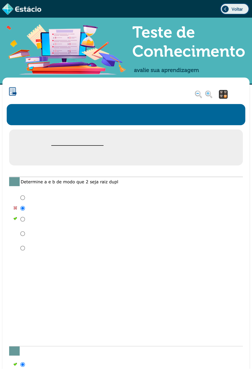 Teste de Conhecimento avalie sua aprendizagem Determine a e b de modo que 2 seja raiz dupla da equação x3 + ax2 - 8x + b = 0. O lucro de uma empresa é determinado pelo polinômio L(x) = -2x² + 220x - 200 , onde x é a quantidade de produtos. Determine a quantidade que maximiza esse lucro. NÚMEROS COMPLEXOS E EQUAÇÕES ALGÉBRICAS Lupa Calc. DGT0697_A9_202106068279_V4 Aluno: JHONNY PACINI Matr.: 202106068279 Disc.: NÚMEROS COMPLEXOS 2022.4 EAD (GT) / EX Prezado (a) Aluno(a), Você fará agora seu TESTE DE CONHECIMENTO! Lembre-se que este exercício é opcional, mas não valerá ponto para sua avaliação. O mesmo será composto de questões de múltipla escolha. Após responde cada questão, você terá acesso ao gabarito comentado e/ou à explicação da mesma. Aproveite para se familiarizar com este modelo de questões que será usado na sua AV e AVS. 1. a = -10 e b = 12 a = -1 e b = 2 a = -1 e b = 12 a = -1 e b = 10 a = -1 e b = -12 Explicação: Usar o dispositivo de Briot-Ruffini: Considerando os restos iguais a zero, temos um sistema de equações: 4a + b - 8 = 0 => 4a + 4 = 0 Na equação 4a + 4 = 0 encontramos a = -1. Substituindo a = -1 na equação 4a + b - 8 = 0 4(-1) + b - 8 = 0 => -4 + b - 8 = 0 => b = 12 2. 55 javascript:voltar(); javascript:voltar(); javascript:diminui(); javascript:aumenta(); javascript:calculadora_on(); Determine a multiplicidade algébrica das raízes da equação polinomial (x - 2)3(x + 1) = 0. A equação x2 + mx + n = 0, com m e n coeficientes reais, admite 5 - 2i como raiz. Determine os valores de m e n. O crescimento populacional de uma determinada região é definido pela equação C(t) = (5t³ - 2t² + 3) / 5, onde t é o tempo em anos e C(t) o crescimento em milhares de pessoas. Qual a população ( em milhares ) estimado pára 2017, se em 2015 a população erá de 325 000? 200 220 110 100 3. -2 possui multiplicidade 3 e -1 possui multiplicidade 1. 2 possui multiplicidade 2 e -1 possui multiplicidade 2. 2 possui multiplicidade 1 e 1 possui multiplicidade 1. -2 possui multiplicidade 2 e 1 possui multiplicidade 2. 2 possui multiplicidade 3 e -1 possui multiplicidade 1. Explicação: Essa equação pode ser escrita da seguinte forma: (x - 2)(x - 2)(x - 2)(x + 1) = 0. Logo, 2 é raiz tripla da equação, ou seja, possui multiplicidade três e (-1) é raiz simples ou de multiplicidade um da equação. 4. m = -9 e n = 27 m = -10 e n = 29 m = -11 e n = 29 m = -10 e n = 27 m = -1 e n = 29 Explicação: Veja que 5 - 2i é raiz então 5 + 2i também é raiz. x2 + mx + n = (x - 5 + 2i)(x - 5 - 2i) = x2 - 10x + 29 Logo, m = -10 e n = 29 5. O Custo de determinada empresa é definido pela função C(x) = x² - 62x + 600, onde C é o lucro da empresa em função da quantidade x em milhões de unidades. Defina a quantidade que deve ser produzida afim de minimizar o custo. Indique as raízes inteiras da equação x4 + 2x3 + 3x2 + 10x + 8 = 0. Um aluno de matemática recorta em uma folha de papel um retângulo de lados (x + 3) e (x -3). Após, faz um novo recorte, retirando do retângulo um quadrado de lado (x - 4). O polinômio que representa a área restante pode ser dada por 360 000 325 000 7000 35 000 332 000 Gabarito Comentado 6. 31 milhões 3,1 milhões 310 milhões 0,31 milhões 9,5 milhões Gabarito Comentado 7. -1 e 2 1, -4 e 8 -2, 4 e -8 -1, -2 e 4 -1 e -2 Explicação: O termo independente é 8. Os divisores de 8 são: 1, -1, 2, -2, 4, -4, 8 e -8. Substituindo os divisores de 8, um a um na equação dada, verificamos que -1 e -2 são as únicas raízes inteiras da equação, pois P(-1) = 0 e P(-2) = 0. 8. 8x - 25 x² - 9 8x + 25 x² - 16 x² - 8x + 16 Não Respondida Não Gravada Gravada Exercício inciado em 04/01/2023 13:59:34. javascript:abre_colabore('34459','301889516','5995802529');
