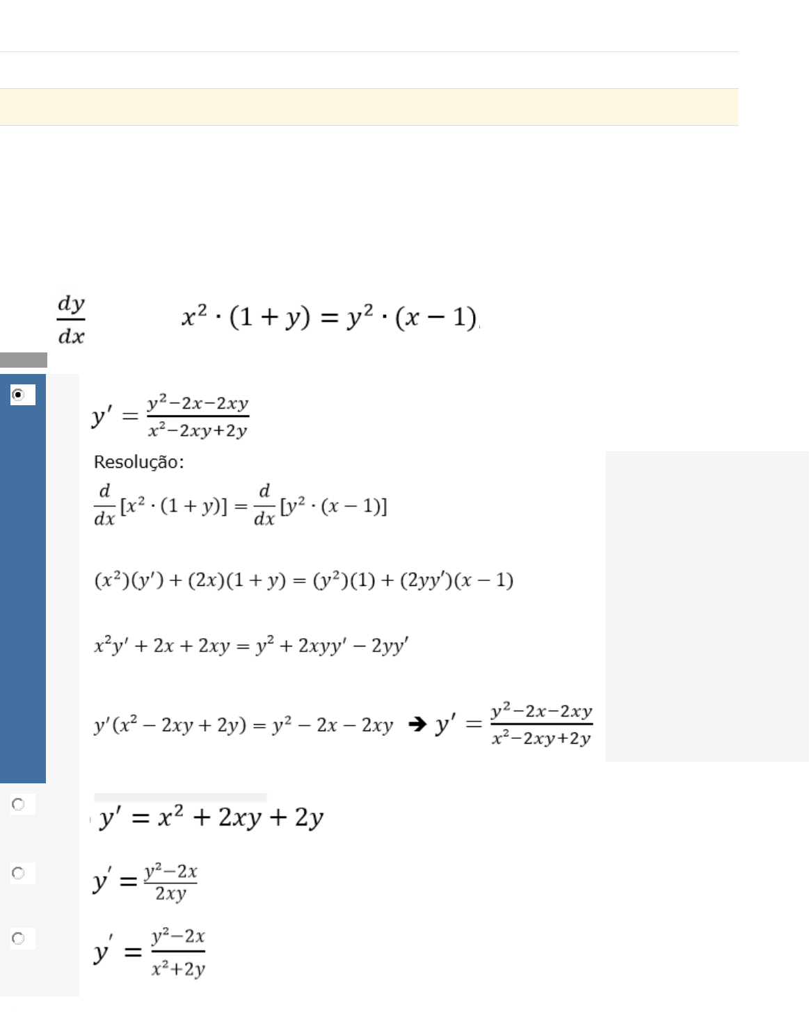 Disciplina(s): Cálculo Diferencial e Integral a Uma Variável Data de início: 24/10/2021 17:59 Prazo máximo entrega: - Data de entrega: 24/10/2021 18:30 Atenção. Este gabarito é para uso exclusivo do aluno e não deve ser publicado ou compartilhado em redes sociais ou grupo de mensagens. O seu compartilhamento infringe as políticas do Centro Universitário UNINTER e poderá implicar sanções disciplinares, com possibilidade de desligamento do quadro de alunos do Centro Universitário, bem como responder ações judiciais no âmbito cível e criminal. Questão 1/10 - Cálculo Diferencial e Integral a Uma Variável Calcule da função , por derivação implícita. Nota: 0.0 A B C D Questão 2/10 - Cálculo Diferencial e Integral a Uma Variável Calcule a devida da função f(x) = (x2 - 1)3 Nota: 10.0 A f'(x) = 3x4 - 2x2 + x B f'(x) = 6x5 - 12x3 + 6x Você acertou! C f'(x) = 6x3 - x2 + 6 D f'(x) = 6x4 - 12x3 + 7x Questão 3/10 - Cálculo Diferencial e Integral a Uma Variável Calcule a derivada da função Nota: 10.0 A Você acertou! B C D Questão 4/10 - Cálculo Diferencial e Integral a Uma Variável Calcule a derivada da função f(x) = 2x3 - 2x2 + x - 4 Nota: 10.0 A f'(x) = 6x2 - 4x + x - 4 B f'(x) = 5x2 - 4x - 4 C f'(x) = 5x2 - 4x + 1 D f'(x) = 6x2 - 4x + 1 Você acertou! Resolução: Usando a tabela de devidas e as regras de derivação, temos que f'(x) = 6x2 - 4x + 1 Questão 5/10 - Cálculo Diferencial e Integral a Uma Variável Um equipamento industrial é adquirido ao preço de R$ 860,00. Com o passar do tempo, ocorre uma depreciação linear no preço desse equipamento. Considere que, em 6 anos, o preço do moinho será de R$ 500,00. Com base nessas informações, é correto afirmar: Nota: 10.0 A Em três anos, o equipamento valerá 50% do preço de compra B É necessário um investimento maior que R$ 450,00 para comprar esse equipamento após sete anos. C Serão necessários 10 anos para que o valor desse equipamento seja inferior a R$ 200,00. D O equipamento terá valor de venda ainda que tenha decorrido 13 anos. Você acertou! Resolução: Variação de valor R$360,00 em 6 anos, logo R$ 60,00 de depreciação por ano. No 13° ano = R$80,00 Questão 6/10 - Cálculo Diferencial e Integral a Uma Variável Calcule a devida da função Nota: 10.0 A B Você acertou! C D Questão 7/10 - Cálculo Diferencial e Integral a Uma Variável Calcular a derivada da função f(x) = 2x2 - 1, no ponto x0 = 2. Nota: 10.0 A 7 B 8 Você acertou! C 6 D 5 Questão 8/10 - Cálculo Diferencial e Integral a Uma Variável Determine o limite: Nota: 10.0 A 1/3 B -1/3 C 1/18 D - 1/18 Você acertou! Questão 9/10 - Cálculo Diferencial e Integral a Uma Variável Use uma simplificação algébrica para achar o limite, se existe: Nota: 10.0 A 3x2 B 2x Você acertou! C 4x D 5x3 Questão 10/10 - Cálculo Diferencial e Integral a Uma Variável Calcule o limite: Nota: 10.0 A 0 Você acertou! B 1 C 2 D -1