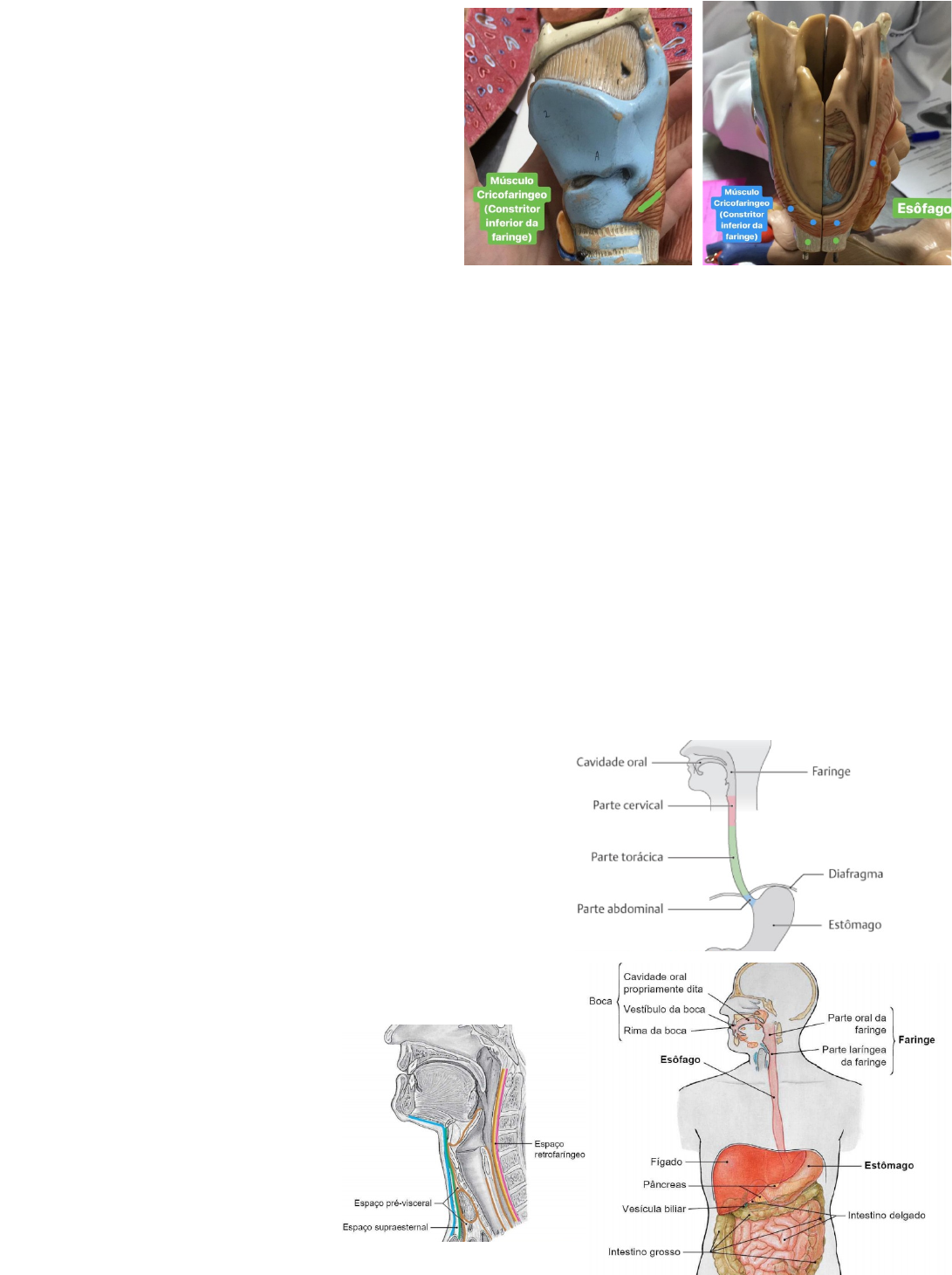 Maria Eduarda Pontes Nozaki - TVII Esôfago - tubo fibromuscular que se estende da faringe até o estômago - inicio: nível da borda inferior da cartilagem cricóidea e da 6° vértebra cervical - término: óstio cárdico ao nível da 11° vértebra torácica - está fixado às margens do hiato esofágico no diafragma pelo ligamento frenicoesofágico permite o movimento independente do diafragma e do esôfago durante a respiração e a deglutição. · Divisões do Esôfago 1. Parte Cervical - Inicio: musculo cricofaríngeo - Término: abertura superior do tórax – 1° costela - formada por musculo estriado esquelético · Sintopia · Anterior: traqueia · Posterior: coluna vertebral, músculo longo do pescoço e lâmina pré - vertebral da fáscia cervical · Lateral: artérias carótidas comuns, jugular interna, nervo vago, nervo hipoglosso e a parte posterior da glândula tireoide 2. Parte Torácica - situada um pouco para a esquerda no mediastino superior entre a traqueia e a coluna vertebral - Inicio: abertura superior do tórax - Término: hiato esofágico - formada por musculo liso - atravessa o mediastino superior e posterior · Sintopia · Anterior: traqueia, artéria pulmonar direita, arco da aorta, brônquio principal esquerdo, pericárdio (separando do átrio esquerdo) e músculo diafragma · Posterior: coluna vertebral, músculo longo do pescoço, artérias intercostais posteriores direitas, ducto torácico, veia ázigo e partes terminais das veias hemiázigo e hemiázigo acessória e aorta · Lateral a Esquerda: parte terminal do arco da aorta, artéria subclávia esquerda, ducto torácico, pleura esquerda e nervo laríngeo recorrente · Lateral a Direita: pleura direita e veia ázigos 3. Parte Abdominal - Inicio: hiato esofágico - Término: junção gastroesofágica/óstio cárdico do estômago - fixada ao diafragma pelo ligamento frenicoesofágico - formada por musculatura lisa · Sintopia · Posterior: lobo esquerdo do fígado e nervo esplâncnico maior esquerdo · Medial: estomago · Lateral: curvatura menor do estomago · Inferior: diafragma · Posterior: artéria aorta e veia cava inferior · Constrições Esofágicas - esôfago é comprimido por três estruturas: (1) arco da aorta, (2) brônquio principal esquerdo e (3) diafragma - constrições permitem a existência do clearance esofágico e impedem o refluxo do material ácido proveniente do estômago 1. Constrição Cervical (Esfíncter Superior do Esôfago): tem início na junção faringoesofágica e é causada pela parte cricofaríngea do músculo constritor inferior da faringe importância clínica: dificulta passagem de sonda gastroesofágica e a endoscopia 2. Constrição Broncoaórtica (Torácica): ocorre no local do primeiro cruzamento do arco da aorta e depois o cruzamento pelo brônquio principal esquerdo 3. Constrição Diafragmática: ocorre no local onde atravessa o hiato esofágico do diafragma importância clínica: Hérnias. · Vascularização · Suprimento Arterial · Cervical: aorta tronco braquiocefálico artéria subclávia tronco tireocervical artéria tireóidea inferior ramos esofágicos - contribuição: artéria tireóidea superior · Torácica: aorta torácica descendente ramos esofágicos (diretos) - contribuição: ramos bronquiais e intercostais · Abdominal: aorta abdominal tronco celíaco artéria gástrica esquerda ramos esofágicos - contribuição: artéria frênica inferior e superior · Suprimento Venoso · Cervical: ramos esofágicos veia tireoide inferior veia braquiocefálica veia cava superior · Torácica: ramos esofágicos veia ázigo veia cava superior veia hemiázigo · Abdominal: ramos esofágicos veia gástrica esquerda veia porta fígado veias hepáticas veia cava inferior *Obs: em casos de obstruções/lesão hepática ocorre o refluxo venoso, ocasionando dilatação dos ramos esofágicos, o que é denominado “varizes esofágicas” · Drenagem Linfática · Cervical: linfonodos justaesofagicos linfonodos cervicais profundos tronco jugular ângulo venoso direito · Torácica: linfonodos justaesofágicos tronco bronco-mediastinal AVE ou AVD · Abdominal: linfonodos gástricos esquerdos linfonodos celíacos cisterna do quilo ducto torácico E AVE · Inervação · Cervical · Motor Somático: núcleo ambíguo nervo laringorrecorrente (parte somática do nervo vago) esôfago - nervos laríngeos recorrentes situam-se nos sulcos traqueoesofágicos, ou perto deles, entre a traqueia e o esôfago · Inervação Parassimpática: núcleo dorsal do vago plexo esofágico esôfago (sinapse) *Obs: Lesão do Nervo Laringorrecorrente: rouquidão e disfagia inerva esôfago cervical E laringe · Torácico · Inervação Simpática: corno lateral T1 – T4 raiz anterior nervo espinal RCB Tronco simpático (sinapse) nervos esplâncnicos cardiopulmonares plexo esofágicos ramos esofágicos · Inervação Parassimpática: núcleo dorsal do vago plexo esofágico esôfago (sinapse) · Abdominal · Inervação Simpática: corno lateral T5 – T9 raiz anterior nervo espinal RCB tronco simpático (sinapse) nervo esplâncnico torácico maior plexo celíaco (sinapse) esôfago abdominal · Inervação Parassimpática: núcleo dorsal do vago plexo esofágico esôfago (sinapse) *Obs: 1) Divertículos na parede anterior do esôfago podem fistular e “jogar” o conteúdo para as vias áreas superiores 2) Se os anéis da traqueia fossem rígidos, a dilatação do esôfago causado pela passagem do alimento causaria o deslocamento da traqueia para frente. Como o anel fibroso (mole), ocorre a deformação da estrutura 3) Espaço retrofaringeo/retroesofágico: localiza entre o esôfago e a coluna cervical (vai da cabeça até o mediastino). Pode-se formar divertículos que rompem a parede posterior e caem no espaço retrofaringeo podendo chegar no mediastino superior importante para a motilidade do esôfago 4) Ordem: pescoço musculatura glândula tireoide traqueia (fáscia pré - traqueal: env