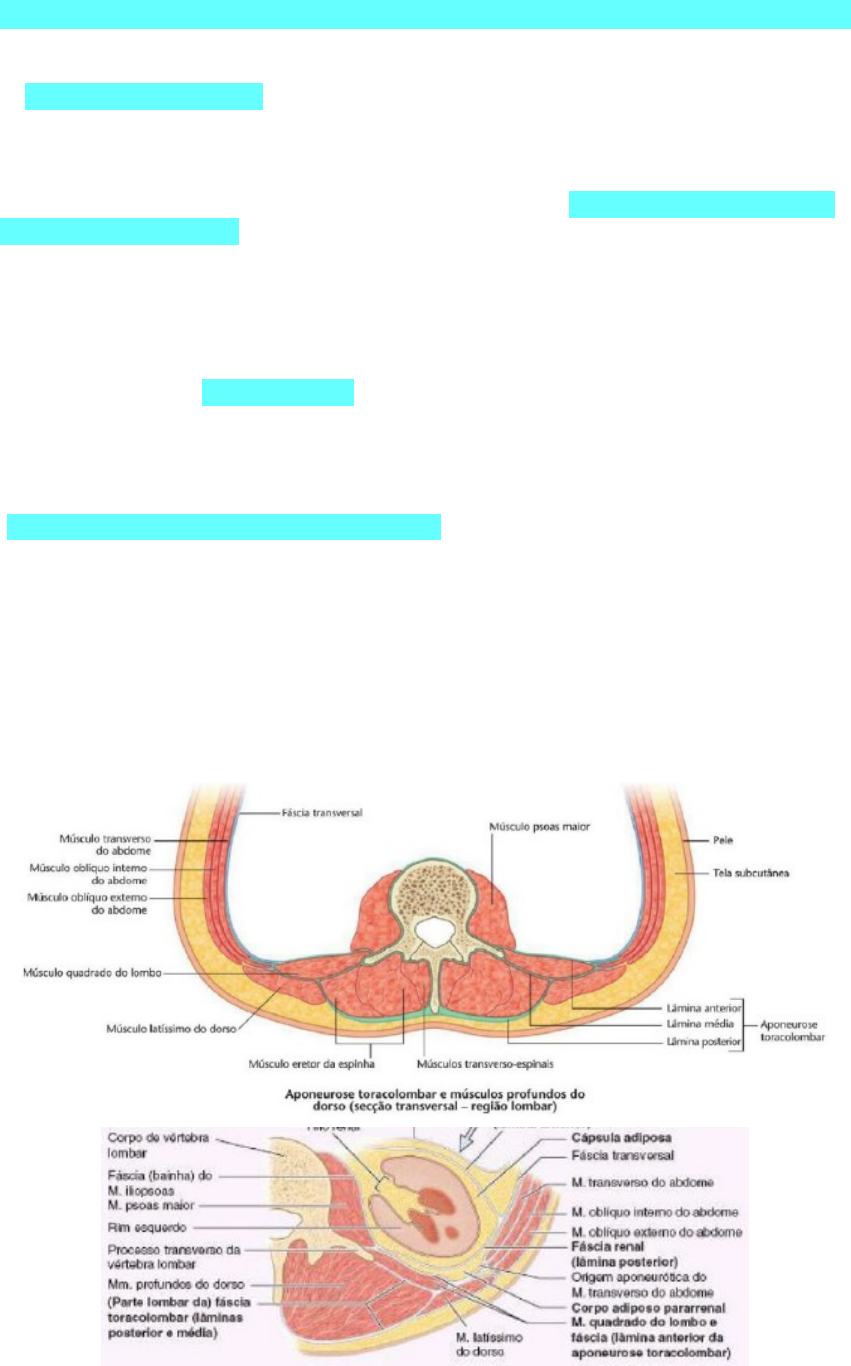 Abdome posterior ->A fáscia que reveste a parede posterior do abdome é contínua com a fáscia transversal que reveste o músculo transverso do abdome. -A aponeurose toracolombar é um complexo fascial extenso fixado à coluna vertebral medialmente que, na região lombar, tem lâminas posterior, média e anterior com músculos inseridos entre elas. É fina e transparente na região onde cobre as partes torácicas dos músculos profundos, mas é espessa e forte na região lombar. O revestimento dos músculos verticais profundos do dorso (músculo eretor da espinha) pelas lâminas posterior e média da aponeurose toracolombar na face posterior do tronco é comparável ao revestimento do músculo reto do abdome pela bainha do músculo reto do abdome na face anterior. No entanto, essa bainha posterior é ainda mais notável do que a bainha do músculo reto do abdome, por causa da espessura de sua camada posterior e da fixação central às vértebras lombares, ao contrário das bainhas do músculo reto do abdome, que não têm sustentação óssea no local em que se fundem uma à outra na linha alba. -A parte lombar dessa lâmina posterior, que se estende entre a costela XII e a crista ilíaca, fixa-se lateralmente aos músculos oblíquo interno e transverso do abdome, do mesmo modo que a bainha do músculo reto do abdome. Entretanto, ao contrário da bainha do músculo reto do abdome, a aponeurose toracolombar não se fixa ao músculo oblíquo externo do abdome; está fixada ao músculo latíssimo do dorso -A lâmina anterior da aponeurose toracolombar (fáscia do músculo quadrado do lombo), que reveste a face anterior do músculo quadrado do lombo — uma lâmina mais fina e transparente do que as outras duas — fixa-se às faces anteriores dos processos transversos das vértebras lombares, a crista ilíaca e a costela XII. A lâmina anterior é contínua lateralmente com a origem aponeurótica do músculo transverso do abdome. Espessa-se superiormente para formar o ligamento arqueado lateral e está aderida inferiormente aos ligamentos iliolombares. -Portanto: fáscia toracolombar -> lamina anterior (delgada), lamina media e lamina posterior **Lamina anterior (profunda) **Lamina media (espessa e prende no processo transverso)- cavidade e parede costal **Lamina posterior: prende no processo espinhoso ->Músculos superficiais da região lombar: principalmente m. latíssimo do dorso e m. serrátil póstero-inferior ->Músculos profundos da região lombar: m. sacro-espinhal (m. eretor da espinha/coluna) com suas porções: m. iliocostal porção lombar, m. longuíssimo porção torácica e m. espinhal porção torácica; m. multífidos, Mm. rotadores curtos e longos, m. interespinhais, m. Intertransversários **O músculo eretor da espinha é o principal extensor da coluna vertebral e é dividido em três colunas: o músculo iliocostal -> coluna lateral, o músculo longuíssimo -> coluna intermédia e o músculo espinal -> coluna medial. Cada coluna é dividida regionalmente em três partes, de acordo com as fixações superiores (músculo iliocostal do lombo, parte torácica do músculo iliocostal do lombo e músculo iliocostal do pescoço). INCISÃO · Pele-> lamina posterior da ATL-> M. Latissimo do dorso -> m serratil posterior inferior-> origem da ATL-> fáscia endoabdominal (transversal) -> espaço retroperitoneal INCISÃO · Pele-> Lamina posterior da fascia toracolombar-> afasta m sacro espinhal -> abrir laminina media -> afastar quadrado lombar -> abrir lamina anterior (profunda) -> abrir fascia endoabdominal · Sacroepinhal (eretor da espinha) · Mm. da parede interna: m. psoas maior e menor, m. quadrado do lombo e m. ilíaco · M. Diafragma e seus arcos: mediano, mediais e laterais e as estruturas que atravessam estes arcos *Prova: vermelho e verde · VCI: forame da veia cava; vasos linfáticos (linfonodos frênicos sup e inferiores) · Hiato esofágico: tronco vagal anterior e posterior · Hiato aórtico: ducto torácico e aorta · Arco medial e psoas maior: tronco simpático · Psoas e arco medial -A fascia endoabdominal: Subdividida- fáscia transversal sobre o m. transverso do abdome, fáscia sobre o m. quadrado lombar e fáscia sobre o m. psoas maior e menor-> A parede posterior do abdome é coberta por uma camada contínua da fáscia endoabdominal situada entre o peritônio parietal e os músculos. A fáscia que reveste a parede posterior do abdome é contínua com a fáscia transversal que reveste o músculo transverso do abdome. A fáscia do músculo psoas que cobre o músculo psoas maior (bainha do músculo psoas) está fixada medialmente às vértebras lombares e à margem da pelve, é espessa superiormente para formar o ligamento arqueado medial. A fáscia do músculo psoas funde-se lateralmente com a fáscia do músculo quadrado do lombo e a aponeurose toracolombar. Inferiormente à crista ilíaca, a fáscia do músculo psoas é contínua com a parte da fáscia ilíaca que cobre o músculo ilíaco. Drenagem Venosa: -Azigo e hemiázigo: diafragma para cima -Veia lombar ascendente (recebe parte do sangue venoso parietal para não sobrecarregar a cava) **Veia cava e lombar ascendente · Iliaca comum -> lombar ascendente -> azigo-> VCS · Iliaca comum -> lombar-> hemiazigo-> acessoria-> braquiocefalica E Irrigação Arterial -1° artéria lombar a 4° a lombar + artéria iliolombar D e E Inervação: -Plexo lombar (T2-L1 e as vezes L2) -Nervos: subcostal, ilio-hipogástrico e ilioinguinal OBS: compressão dos nervos-> parestesia (bolsa escrotal e grandes lábios) por extensão do abdome (gravidez, tumor) Clinica: **Cuidado também em apendicectomia: afastar os nervos para não dar parestesia do lado D da bolsa escrotal e grandes lábios Nervos intercostais -> vão para a parede do abdome devido as costelas