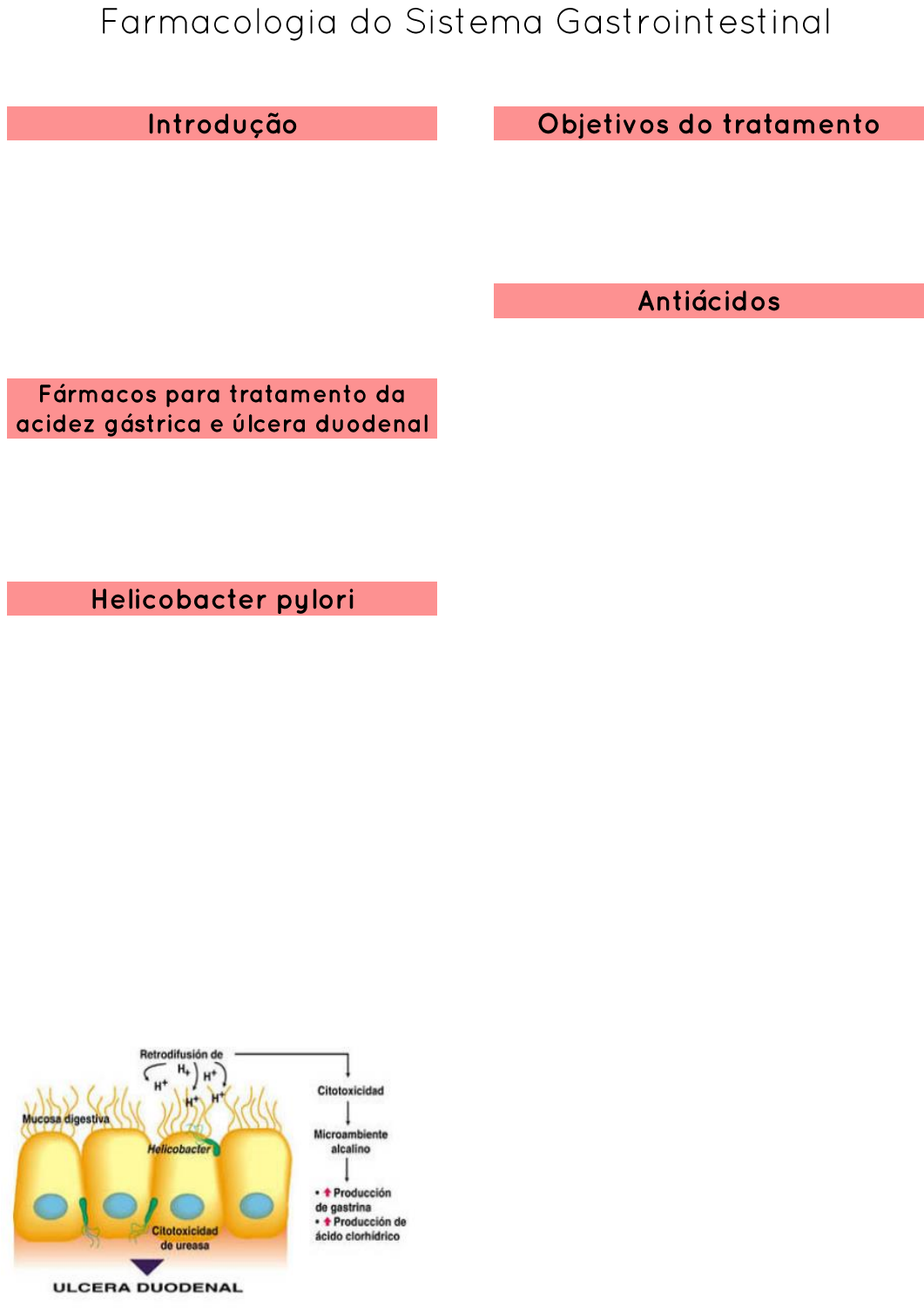 O sistema digestório é responsável por várias funções que vão desde preensão, mastigação, deglutição, maceração e decomposição do alimento até a degradação enzimática pelo organismo ou por microrganismos simbiontes, posterior absorção através do epitélio para dentro do organismo e, ainda, eliminação do material que não foi aproveitado. - Antiácidos - Bloqueadores da secreção de HCl (Antisecretores gástricos) - Protetores de mucosa É uma bactéria que se aloja no estômago ou intestino, onde prejudica a barreira protetora e estimula a inflamação, podendo provocar sintomas como dor e queimação abdominal, além de aumentar o risco para o desenvolvimento de úlceras e câncer. Ocorre 100% das vezes em gastrites crônicas, 90-95% úlcera duodenal, 60- 70% úlcera gástrica. O mecanismo preciso pelo qual o H. pylori contribui para a formação de DU não é completamente compreendido. No entanto, a bactéria parece: - Aumentar a secreção de ácido gástrico - Contribui para a metaplasia gástrica - Afeta os mecanismos de defesa da mucosa gástrica - Aliviar a dor - Cicatrizar a úlcera - Evitar a recidiva: erradicando o Helicobacter pylori São medicamentos que aumentam o pH gástrico, neutralizando o ácido clorídrico (HCl) liberado pelas células do estômago (células parietais). É indicado quando for preciso neutralizar uma quantidade exagerada de ácidos estomacais, aumentando o pH do estômago. Podem ser divididos em: Sistêmicos: podem ser absorvidos no sistema digestório e exercer este efeito no organismo do animal. - Bicarbonato de sódio (NaHCO3): capaz de reagir com uma molécula de ácido clorídrico (HCl), formando cloreto de sódio (NaCl), água (H2O) e gás carbônico (CO2 – pode causar distensão abdominal e eructação com refluxo ácido). Não sistêmicos: exercem seu efeito fundamentalmente no estômago. - Hidróxido de magnésio (Mg(OH)2 ): uma molécula de Mg(OH)2 reage com 2 moléculas de HCl, formando cloreto de magnésio (MgCl2) e 2 moléculas de água. - Óxido de magnésio (MgO): é convertido em Mg(OH)2 no organismo. - Carbonato de magnésio (MgCO3 ): uma molécula de MgCO3 reage com 2 moléculas de HCl, formando 1 molécula de cloreto de magnésio (MgCl2 ), gás carbônico e água. - Carbonato de cálcio (CaCO3 ): uma molécula de CaCO3 reage com 2 moléculas de HCl, Dentre os sais de cálcio, o mais usado como antiácido é o carbonato de cálcio, porém, atualmente, acredita-se que os íons Ca ++ possam favorecer a liberação de HCl do estômago (via gastrina), tendo efeito oposto ao desejado. O uso prolongado de sais de cálcio como antiácido pode interferir na absorção de fosfatos, e, ainda, a formação de sabões de cálcio no intestino pode causar irritação da mucosa.formando cloreto de cálcio (CaCl2 ), gás carbônico e água. - Hidróxido de alumínio (Al(OH)3 ): uma molécula de Al(OH)3 reage com 3 moléculas de HCl, formando cloreto de alumínio (AlCl3 ) e água. Obs. 1: Os sais de alumínio são antiácidos mais potentes por atuarem em 3 moléculas de HCl. Obs. 2: Os sais de magnésio têm ainda efeito laxante (ver mais adiante), e os de alumínio são constipantes; por isto é comum encontrar especialidades farmacêuticas que usam esta associação, visando minimizar estes efeitos colaterais. Obs. 3: A administração prolongada de antiácidos contendo sais de alumínio também pode causar efeitos indesejáveis, uma vez que possuem efeito adstringente, interferem na absorção de fosfatos por meio da formação de fosfato de alumínio no intestino, levando a hipofosfatemia e hipofosfatúria. Efeitos adversos - Podem causar constipação - Diminuição da motilidade intestinal - Desidratação e restrição líquida - Diarreia Resumindo • Evitar os absorvíveis e uso crônico • Evitar bicarbonato sódico em HTA, ICC… • Evitar hidróxido de alumínio em hipofosfatemia • Interferem com a absorção de outros medicamentos • Administrar 1/2 - 1 h após as refeições Para compreensão do mecanismo de ação destes agentes é relevante considerar alguns mecanismos envolvidos na liberação de HCl pelas células parietais: ➔ O controle desta secreção é feito pela acetilcolina (via nervo vago), que atua em receptores muscarínicos, e pela gastrina, ambas promovendo a liberação de histamina (que atua em receptores do tipo H2) e esta, de HCl. Os principais bloqueadores da secreção de HCl ou de seus efeitos são: Antagonistas histaminérgicos do tipo H2 - Cimetidina - Ranitidina - Famotidina - Nizatidina A cimetidina foi o primeiro a ser introduzido em terapêutica, causando grande impacto sobre o tratamento da hipersecreção de HCl gástrico; porém, devido aos efeitos colaterais que ocorrem com o uso prolongado (efeito antiandrogênico e ginecomastia em homens), tem sido substituído pelos antihistamínicos H2 mais modernos que diferem na potência e não na eficácia. - Via oral ou venosa - Alta segurança em uso - Menor eficácia que os inibidores da bomba de prótons - Ranitidina é mais potente que a Cimetidina - Precauções: insuficiência renal e idosos Farmacocinética: - Bem absorvidos via oral - A Famotidina tem meia-vida mais longa - Se distribuem por todos os tecidos, cruzando a barreira hematoencefálica, atravessam a placenta e são secretados pelo leite. Mecanismo de ação: Atua como antagonista competitivo e reversível nos receptores H2, o que bloqueia os efeitos da histamina, além de inibir a adenilciclase e o cAMP (AMP cíclico). Inibidores da bomba de prótons - Omeprazol - Lansoprazol Indicação: São utilizados exclusivamente para o tratamento de úlceras e gastrites. Não são mais recomendados como modo de prevenção para secreção ácida. Mecanismo de ação: Bloqueiam de forma irreversível e altamente seletiva uma bomba localizada na membrana das células parietais responsáveis pela secreção de HCl, chamada H + , K + ATPase; esta bomba troca íons H + por K