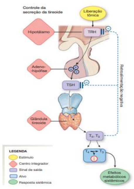 DANIELA SANTOS ROCHA HIPOTIREOIDISMO Hipotireoidismo é causado pela deficiência do hormônio tireoideano. É diagnosticado por meio de características clínicas, como aparência facial típica, fala lenta e voz grossa e pele seca, com baixas concentrações de hormônios tireoidianos. A conduta é o tratamento da causa subjacente e administração de tiroxina. O hipotireoidismo ocorre em qualquer idade, mas é particularmente comum em idosos, em que ele pode estar presente de maneira sútil e ser difícil de reconhecer. O hipotireoidismo pode ser • Primário: causado por doença na tireoide • Secundário: causado por doença no hipotálamo ou na hipófise Tireoide e eixo tireoidiano____________________ Hipófise A hipófise é uma glândula que se localiza na sela túrcica, que se conecta ao hipotálamo através do pedúnculo hipofisário. É dividida em adeno-hipófise, também chamada de hipófise anterior e neuro- hipófise, também chamada de hipófise posterior. Na adeno-hipófise são produzidos e secretados seis hormônios importantes: 1. Hormônio tireotrófico (TSH): controla a secreção de tiroxina e da tri-iodotironina pela glândula tireoide; 2. Hormônio adrenocorticotrófico (ACTH): controla a secreção de alguns hormônios adrenocorticais; 3. Hormônio folículo estimulante (FSH) e luteinizante (LH): controlam o crescimento dos ovários e testículos, e suas atividades hormonais e reprodutivas; 4. Prolactina: responsável pelo desenvolvimento da glândula mamária e pela produção de leite; 5. Somatotrofina (GH): promove o crescimento de todo o organismo. É válido ressaltar que na adeno-hipófise há 05 tipos celulares responsáveis pela produção e secreção dos hormônios supracitados, são eles: Tireotropos: responsáveis pela produção de TSH; Corticotropos: responsáveis pela produção de ACTH; Gonadotropos: responsáveis pela produção de LH E FSH; Lactotropos: responsáveis pela produção de prolactina; Somatotropos: responsáveis pela produção de GH. Além disso, cerca de 30-40% das células da adeno- hipófise são somatotrópicos, ou seja, células responsáveis pela produção de hormônio de crescimento, e apenas 20% são corticotrópicos, que secretam ACTH. Os outros tipos celulares, apesar de secretar hormônios potentes, correspondem a apenas 3-5% do total de células da adeno-hipófise. Na neuro-hipófise, são secretados dois hormônios: 1. Hormônio antidiurético (ADH): controla a excreção da água na urina; 2. Ocitocina: auxilia na ejeção de leite pelas glândulas mamárias para o mamilo durante a sucção. Hipotálamo O hipotálamo é responsável por controlar a secreção hipofisária através de sinais hormonais e nervosos. Na adeno-hipófise, a secreção é controlada por hormônios hipotalâmicos liberadores e hormônios hipotalâmicos inibidores, que chegam na região DANIELA SANTOS ROCHA anterior da hipófise através dos vasos portais hipotalâmico-hipofisários. Por outro lado, na neuro- hipófise, a secreção é controlada por sinais neurais vindos do hipotálamo. Os principais hormônios liberadores e inibidores hipotalâmicos são: 1. Hormônio liberador de tireotropina (TRH) 2. Hormônio liberador de corticotropina (CRH) 3. Hormônio liberador do hormônio de crescimento (GHRH) 4. Hormônio liberador da gonadotropina (GnRH) 5. Hormônio inibidor da prolactina (PIH) O hormônio liberador de tireotropina (TRH), liberado pelo hipotálamo, age nos tireotropos, localizados na hipófise, estimulando a secreção de TSH. Tireoide A tireoide é uma das maiores glândulas endócrinas, e é responsável pela secreção dos hormônios tiroxina e tri-iodotironina, comumente conhecidos como T3 e T4, respectivamente. Esses hormônios são responsáveis por aumentar o metabolismo do organismo. A secreção dos hormônios tireoidianos (T3 e T4) é controlada, principalmente, pelo TSH (hormônio tireoestimulante) secretado pela hipófise anterior. Cerca de 93% dos hormônios liberados pela tireoide consistem em tiroxina (T3), e 7% são tri-iodotironina (T4). No entanto, nos tecidos, quase toda a tiroxina é convertida em tri-iodotironina, que é cerca de quatro vezes mais potente que a tiroxina, mas está em menor quantidade no sangue e persiste por um tempo muito curto. Ao serem liberados no sangue, os hormônios tireoidianos ligam-se às proteínas plasmáticas. Porém, devido à alta afinidade da ligação, esses hormônios – sobretudo a tiroxina) são liberados de forma lenta para as células teciduais. Nas células-alvo, esses hormônios ligam-se às proteínas intracelulares, são armazenadas e, lentamente, utilizadas ao longo de dias ou semanas. Regulação da secreção dos hormônios tireoidianos Para manter o nível ideal de secreção de hormônio tireoidiano, mecanismos específicos de feedback agem no hipotálamo e na hipófise anterior, com o fito de controlar a secreção tireoidiana. Através de um feedback negativo, quando estão em grandes quantidades nos líquidos corporais, os hormônios tireoidianos inibem a hipófise, reduzindo a liberação de TSH, e o hipotálamo, reduzindo a liberação de TRH. Por outro lado, quando os níveis de hormônios estão reduzidos, ocorre um feedback positivo, estimulando a hipófise e o hipotálamo a liberar mais TSH e TRH, respectivamente. A síntese dos hormônios tireoidianos requer iodo. O iodo, ingerido na alimentação e na água como iodeto, é ativamente concentrado pela tireoide e convertido em iodo orgânico (organificação) dentro das células foliculares pela peroxidase tireoidiana. As células foliculares circundam um espaço preenchido por coloide, que consiste em tireoglobulina, uma glicoproteína que contém tirosina em sua matriz. A tirosina em contato com a membrana das células foliculares é iodada em 1 (monoiodotirosina) ou 2 (di- DANIELA SANTOS ROCHA iodotirosina) locais e depois acoplada para produzir 2 formas de hormônio tireoidiano. • Di-iodotiros