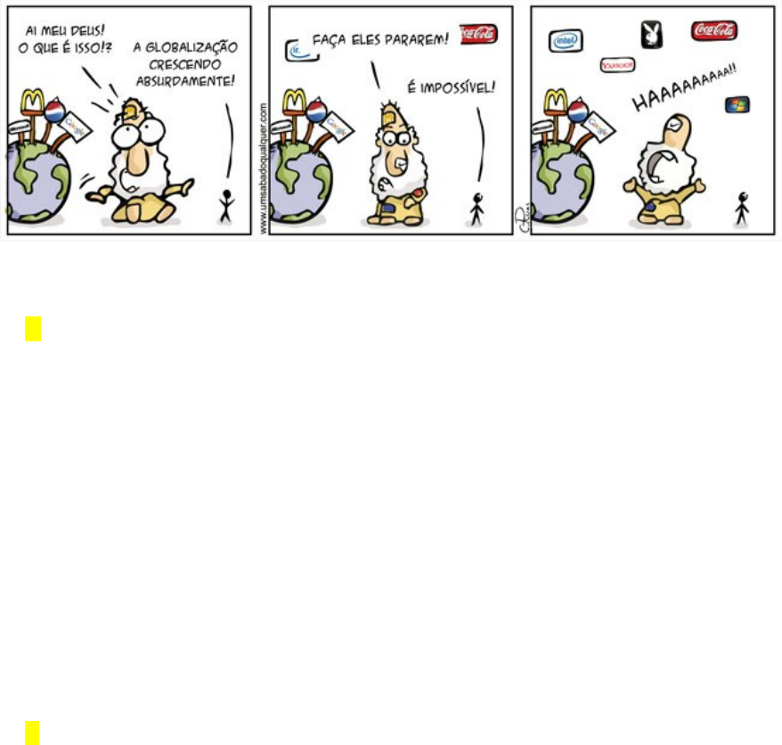 1) Assinale a alternativa que indica a característica da Globalização representada pela tirinha: A) Mercantilização da Economia B) Formação de Acordos Econômicos C) Cartelização D) Expansão das empresas globais E) Censura aos meios publicitários 2) Sobre a ação do Estado na política econômica e social de um país e suas repercussões nas sociedades contemporâneas, assinale a alternativa correta. A) Nos regimes socialistas derivados do antigo bloco soviético o Estado apresenta-se pouco atuante, sendo que as comunas populares controlam o sistema produtivo e o poder. B) A social democracia caracteriza-se pela valorização da iniciativa privada e pela ausência de seguridade social do Estado. Os serviços de saúde, educação e seguridade social são privados. C) O Parlamentarismo é a forma de representação própria das monarquias e dos regimes totalitários; o Presidencialismo é próprio das democracias socialistas. D) O Estado laico caracteriza-se pela ingerência religiosa nos assuntos de Estado. O Irã é um exemplo de Estado laico. E) No capitalismo neoliberal o Estado não é controlador do mercado, favorecendo a livre iniciativa e a livre competição entre as empresas. Não prioriza o protecionismo da produção industrial nacional. 3) O início do século XXI vem sendo marcado por uma grave crise financeira e econômica mundial, culminada por diferentes eventos. Alguns analistas comparam parte de seus efeitos com aqueles decorrentes da crise da primeira metade do século XX marcada pela _____________. Ao contrário da precedente, a atual crise não pode ser marcada por um único evento, mas sim eventos, como, por exemplo, o estouro da “bolha da internet” (Índice Nasdaq), em 2001, a quebra de bancos de investimentos importantes nos EUA, em 2008, dentre outros. Em suas diferenças e especificidades, porém, pode-se afirmar que ambas as crises são _____________ e geraram _____________. Igualmente que afetaram, sem precedentes, a economia de diferentes países, sendo grande parte por causa da ______________. Assinale a alternativa que preenche corretamente os espaços em branco, na sequência estabelecida, com as respectivas informações que se integram ao contexto. A) crise dos suprimes – nacionais – superinflação – crise das moedas como dólar e o euro. B) quebra da Bolsa de Valores de Nova Iorque, em 1929 – mundiais – recessão – interdependência entre os mercados C) Primeira Guerra Mundial, em 1914 – mundiais – guerra – indústria armamentista D) crise do café no Brasil, em 1929 – regionais – crescimento – comodities E) quebra da Bolsa de Valores de Nova Iorque, 1929 – diferentes, pois uma era local e outra mundial – medo do comunismo e agora medo do esfacelamento da União Européia – crise política e econômica na Europa e EUA. 4) O fenômeno da Globalização, constituído por processos diversos, marca a experiência do tempo e do espaço vivenciada atualmente. Sobre este tema considere as afirmações a seguir: I. Com a globalização as relações de intercâmbio se intensificaram, levando a um acirramento da concorrência entre lugares, cidades e países que disputam os investimentos estrangeiros. II. Os fluxos de mercadorias, capitais e informações cresceram no mundo globalizado, intensificando o poder dos Estados sobre as suas economias nacionais. III. O processo de globalização não é somente caracterizado pela intensificação das relações transfronteiriças e globais, mas também pelo aumento das disparidades entre lugares e países, por novos processos de exclusão socioeconômica. IV. Caracterizam a globalização, entre outros fatores, a maior dificuldade do estabelecimento dos fluxos transfronteiriços de capitais e mercadorias. V. As redes que sustentam os fluxos transnacionais também podem dar suporte aos circuitos informais de lavagem de dinheiro em paraísos fiscais e de atuação do narcotráfico internacional. Assinale a alternativa que indica as afirmações INCORRETAS. A) I, II e III. B) IV e V. C) II, III e V. D) III e IV. E) II e IV. 5) (...) Liberalismo, o Neo, bateu à porta da quitinete onde morava o Estado Mínimo e sua numerosa família. O Estado Mínimo – diga-se de passagem – já fora o máximo no passado, requisitado por todos, vivia confortavelmente em uma cobertura duplex no edifício Keynes. A partir dos anos 1980, seu prestígio começou a declinar diante da campanha orquestrada pelo Liberalismo que avançou no seu patrimônio e privatizou suas empresas sob o pretexto de que ele, Estado, não entendia nada de economia, cobrava altos impostos e impedia a maximização dos seus lucros. Empobrecendo, o Estado teve que se mudar para um apartamento menor e depois para outro menor ainda e hoje vive em uma modesta unidade no conjunto habitacional Milton Friedmam. (...) NOVAES, Carlos Eduardo, ‘Liberalismo e Estado Mínimo’, 01/mar./2009, Jornal do Brasil. A opção que apresenta exemplos, no Brasil, que confirmam a explicação contida no trecho da crônica é: A) privatização de bancos, aumento das barreiras alfandegárias, aplicação dos Planos Quinquenais. B) desestatização de empresas, desregulamentação da economia, criação de Agências Reguladoras. C) redução da concentração do poder administrativo federal, redução das taxas de juros, criação dos Órgãos de Planejamento Regional. D) ampliação da esfera de atuação das secretarias de governo, reforma fiscal, implementação de Programas de Desenvolvimento Nacional. E) nacionalização de empresas, redução das tarifas alfandegárias, implementação dos Programas Nacionais de Desenvolvimento. 6) A globalização pode ser descrita como um conjunto de transformações na ordem política e econômica mundial que vem acontecendo nas últimas décadas. São manifestações características da globalização, EXCETO: A) A globalização aumentou a força/influência do Estado-Nação como poder regulado